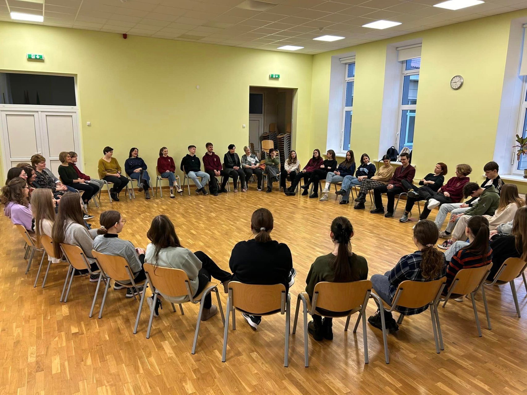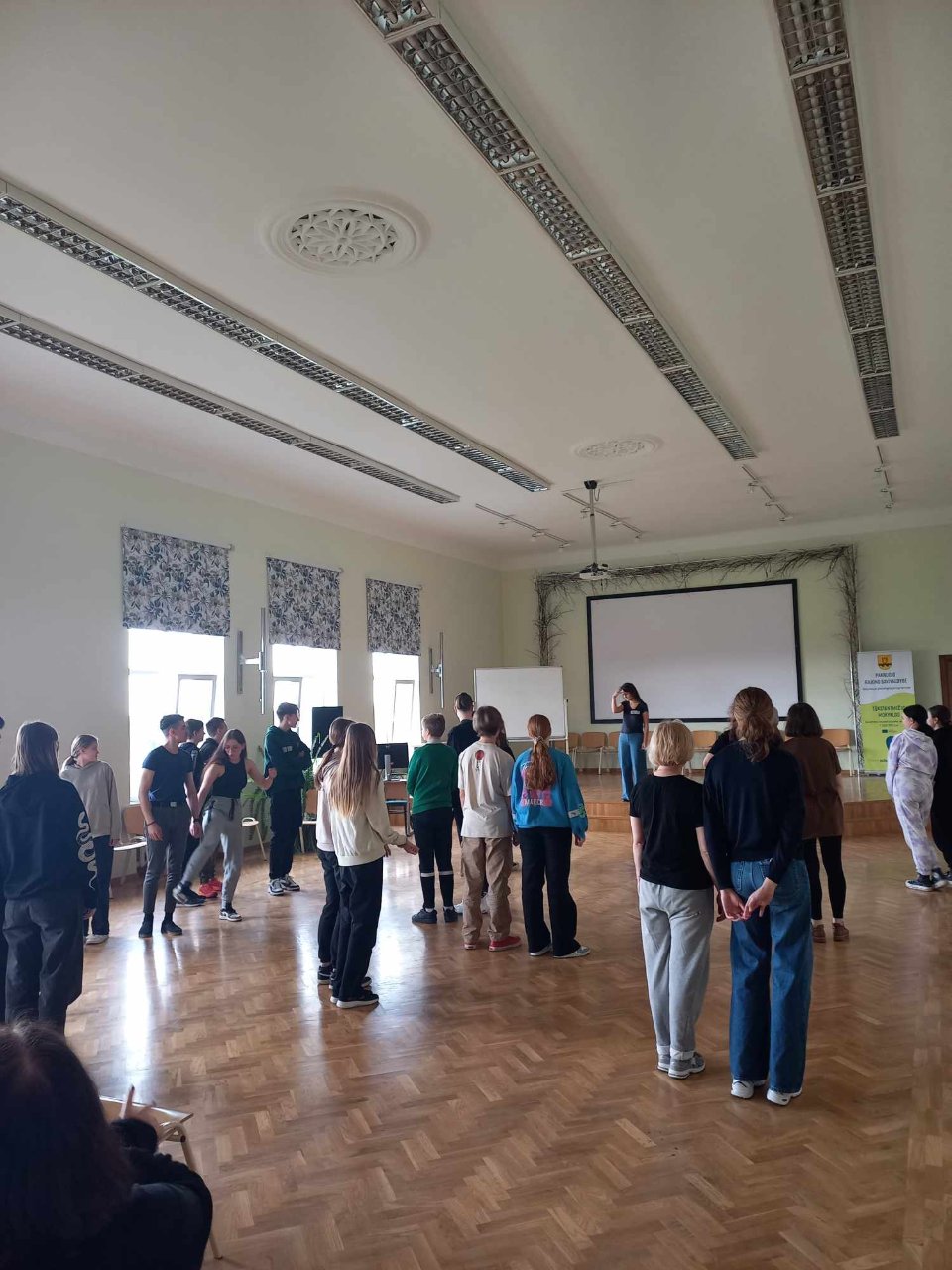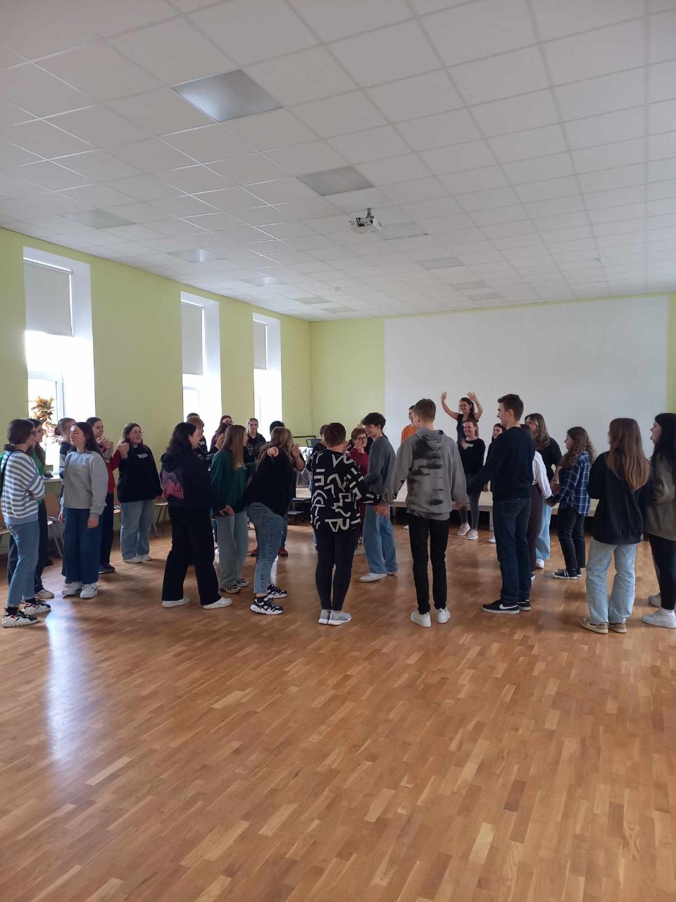 Pirmąjį užsiėmimą mokiniams ir mokytojams vedė Simonas. Su juo mokėmės susikaupimo, tvardymosi ir nejudėjimo ten, kur nereikia. Išmokome sutelkti dėmesį į aplinką. Daug dirbome prie mizanscenų. Mokėmės atsidurti nurodytoje vietoje tam tikru metu. Buvo daug painiavos, bet užduotis puikiai ugdė mūsų atmintį ir susikaupimą. Taip pat gilinome žinias apie mūsų pojūčius, ypač klausą, žaisdami tylos gaudynes. Diena su Simonu tikrai neprailgo. Buvo linksma, įgijome naujų patirčių. Kita diena buvo skirta pamokoms su Rugile. Beveik visą dieną mus lydėjo muzika ir ritmas. Daug dirbome grupėmis, lavinome susikaupimą ir greitį perduodami signalus, ritmiškai mėtėmės kamuoliukais, kūrėme judesių „mašinas" ir jas pristatėme, ugdėme savo bendradarbiavimo įgūdžius. Visą užsiėmimą vainikavo šokiai pagal populiarias dainas. Jie pareikalavo nepaprastai daug energijos, bet suteikė džiaugsmo!