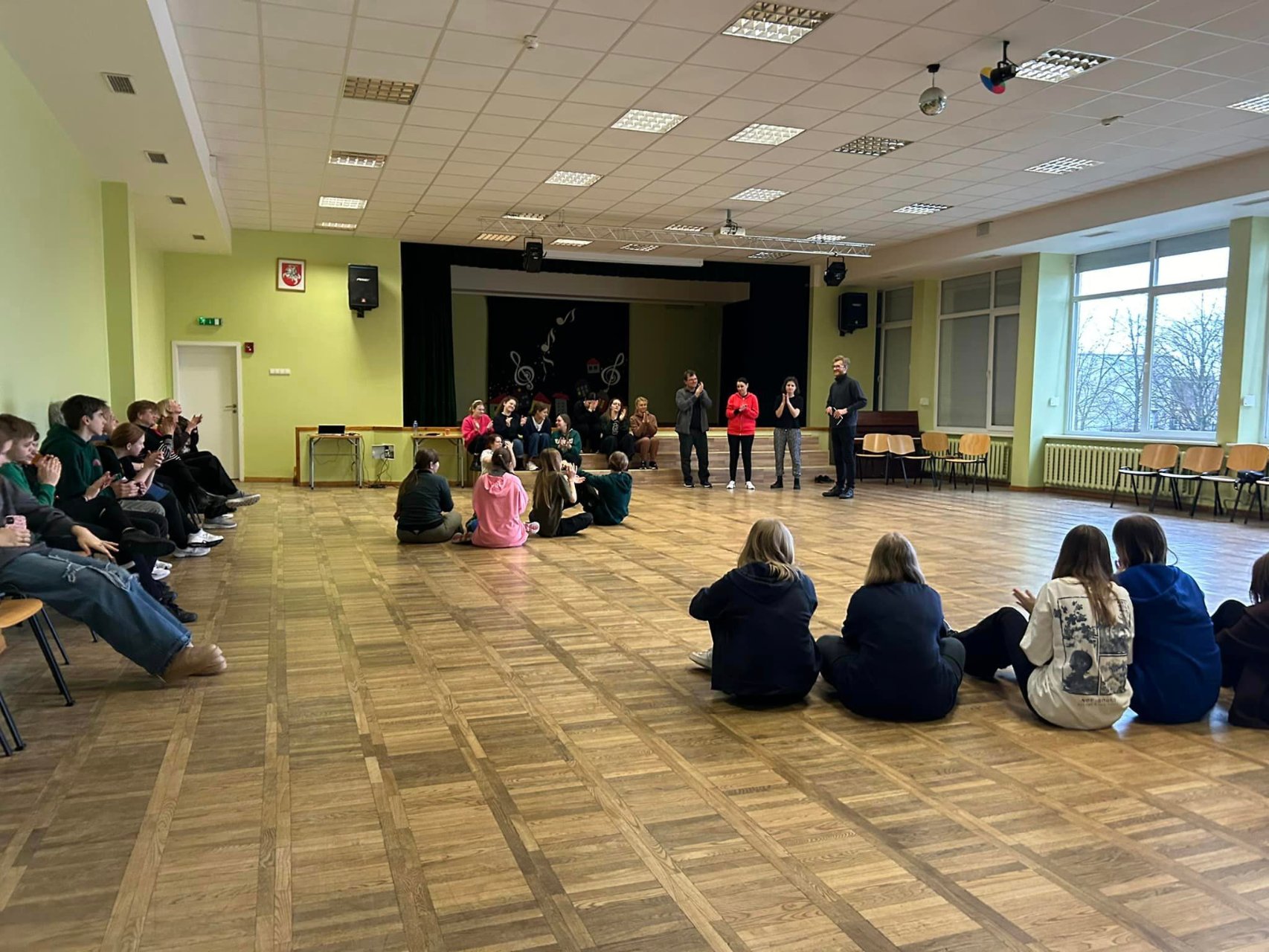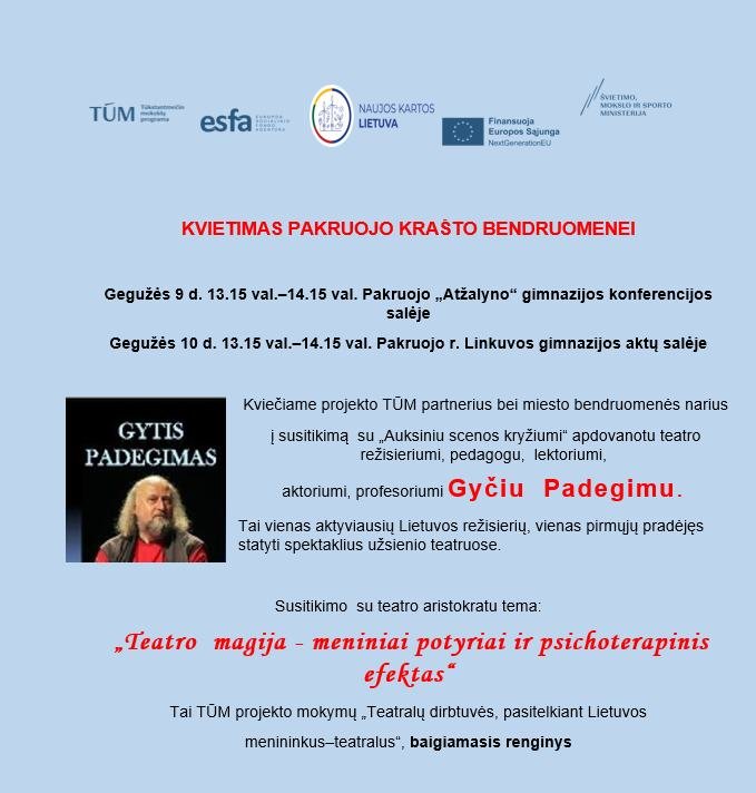 Gegužės 9 dieną mūsų gimnazijoje vyko TŪM projekto mokymų „Teatralų dirbtuvės, pasitelkiant Lietuvos menininkus-teatralus“, baigiamasis renginys, kurį vedė įžymus lietuvių teatro režisierius, profesorius, rašytojas Bernardas Gytis Padegimas. Gerbiamas profesorius mus mokė, kaip atrasti, pažinti ir ugdyti savo vidines galias, susikoncentruoti ir valdyti savo dėmesį, lavinti vaizduotę, kaip išmokti atpalaiduoti ir valdyti kūną. Jis mus supažindino su keturių stichijų (oro, vandens, žemės ir ugnies) judesiais bei paaiškino jų svarbą mūsų kasdieniniame gyvenime.