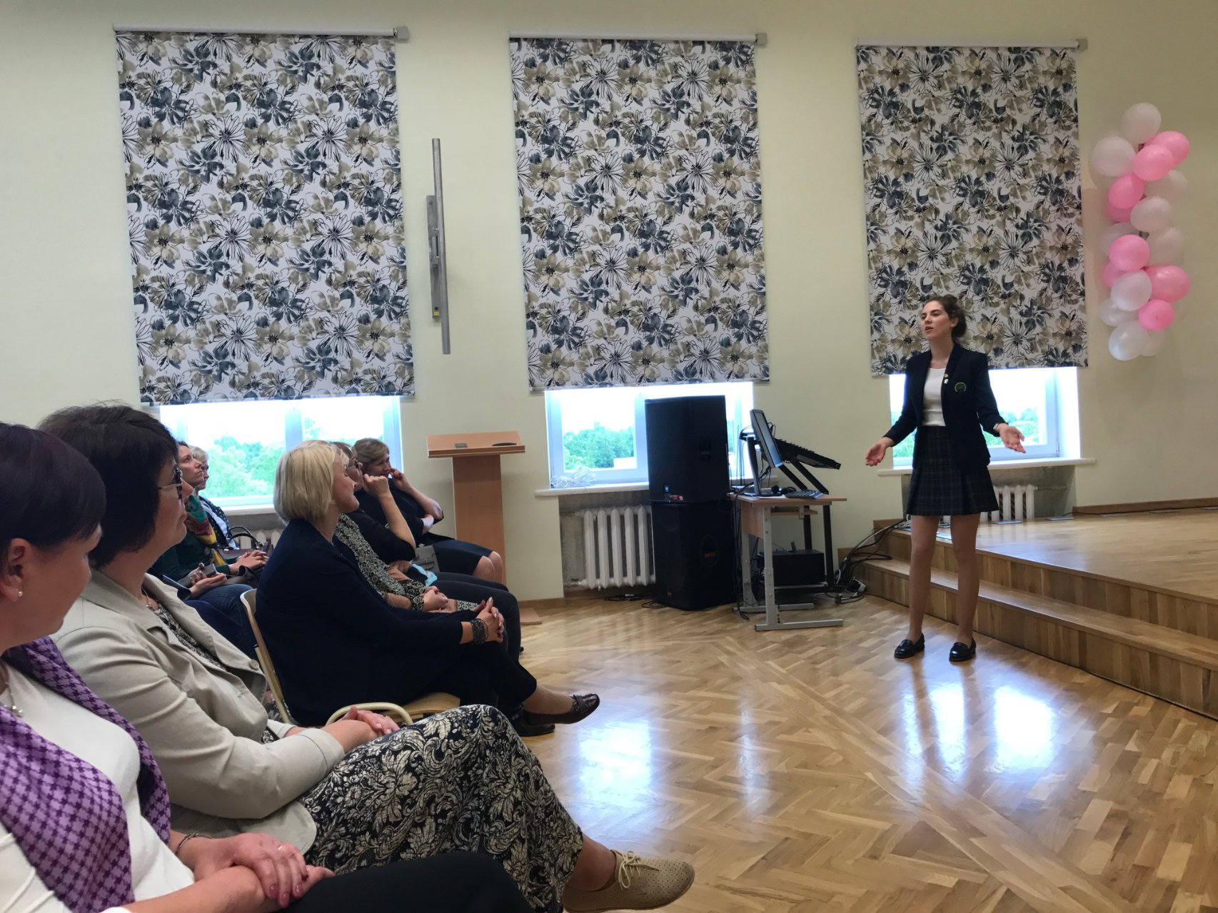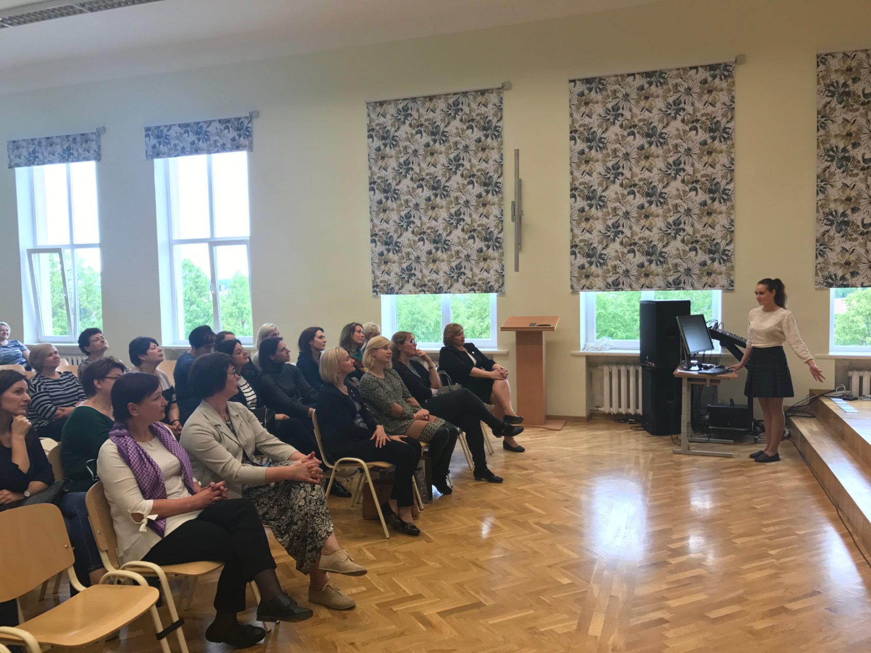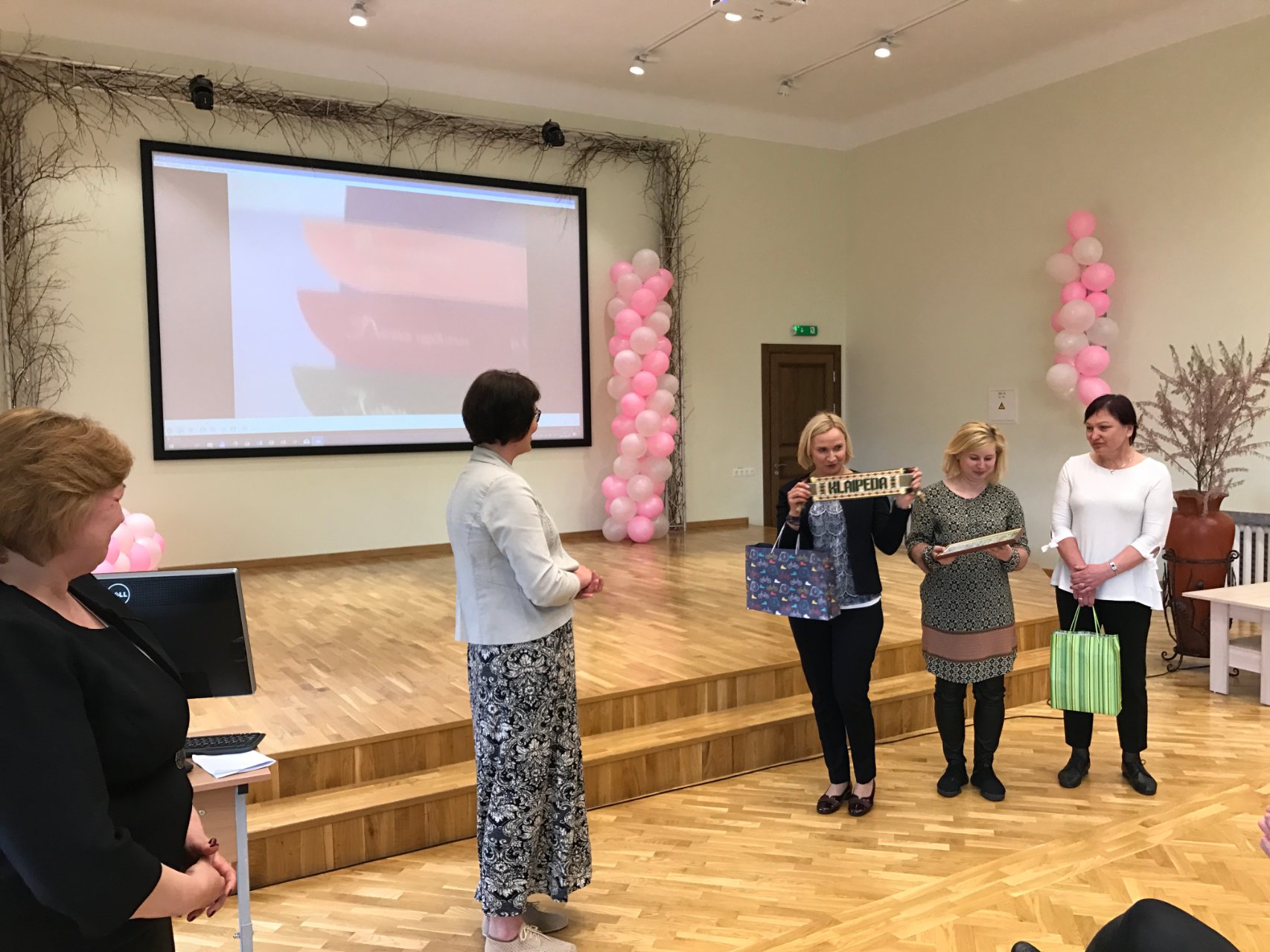 Posėdžių ir konferencijų salėje direktoriaus pavaduotoja ugdymui Rasa Bertulienė, laikinai atliekanti direktoriaus funkcijas, ir direktoriaus pavaduotoja ugdymui Rasa Augustinaitienė pristatė vykdomus projektus, įvairią kitą mokykloje ir už jos ribų vykdomą veiklą. „Metų gimnaziste“ išrinkta Austėja Miknevičiūtė, IVc klasės mokinė, papasakojo apie savo paieškų ir atradimų kupiną kelionę, kuri prasidėjo čia, gimnazijoje. Jautri abiturientės kalba sujaudino viešnias. Neįkainojamą patirtį kaupia ir Kamilė Augėnaitė, IIIb klasės gimnazistė, Jaunimo Europos komandos narė, kalbėjusi apie įvairių renginių, konkursų, projektų iniciavimą ir dalyvavimą juose. Klaipėdos miesto mokyklų direktorių pavaduotojos padėkojo gimnazijos administracijai už jaukų susitikimą ir įteikė atminimo dovanėlių. Buvo šaunu išgyventi bendrystės jausmą ir pagalvoti apie bendradarbiavimą ateityje.