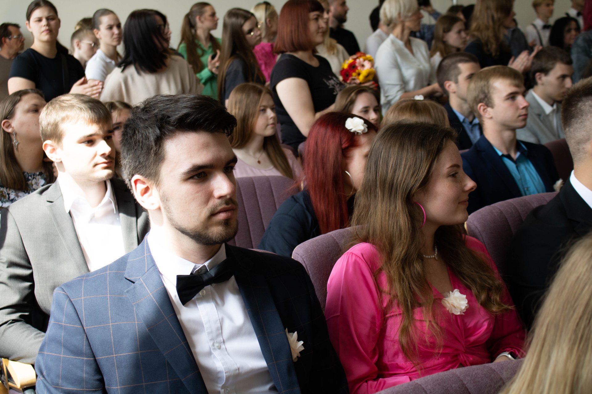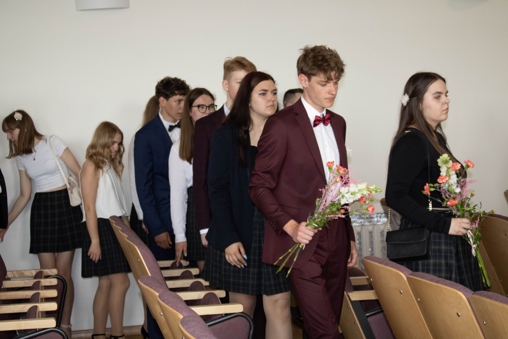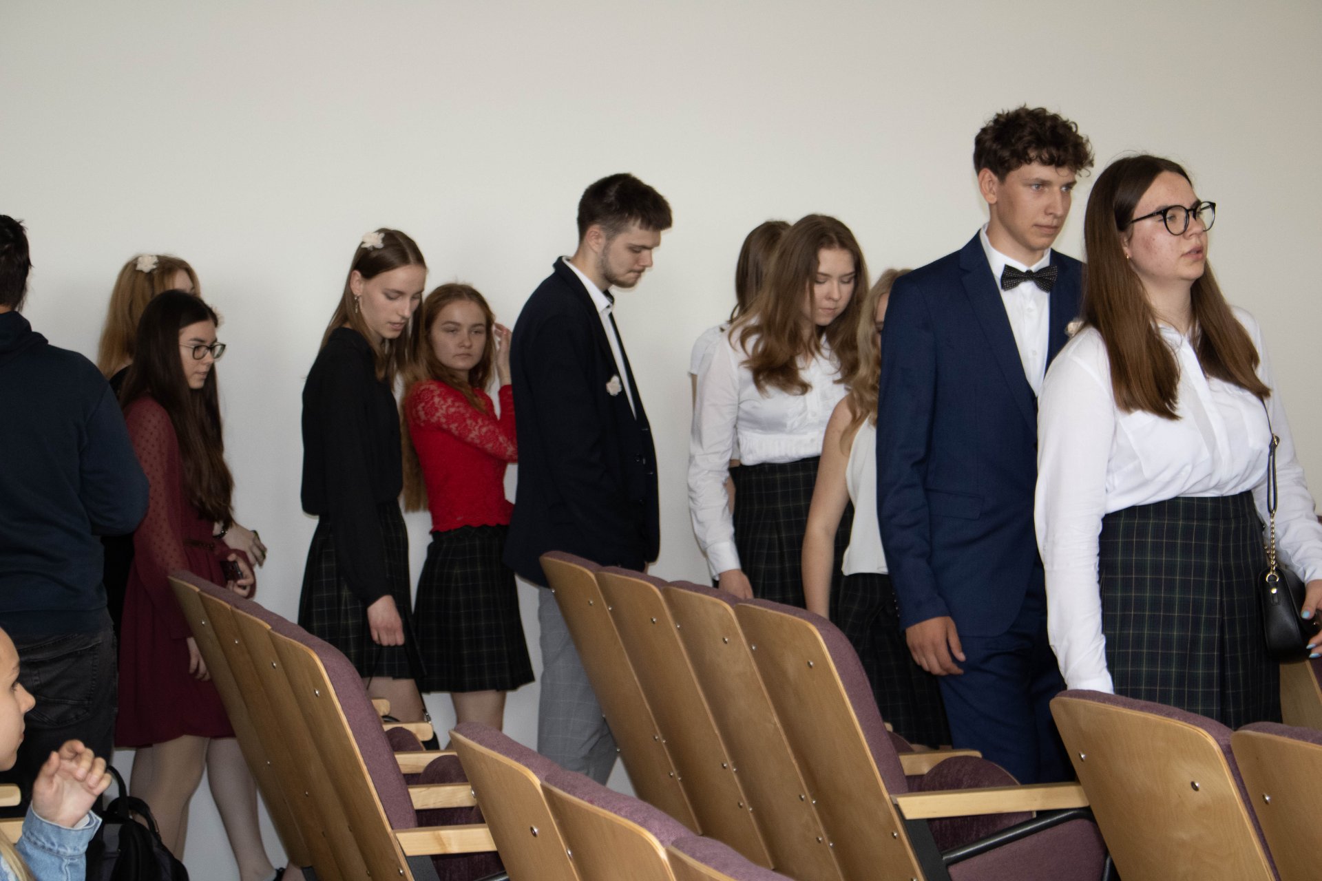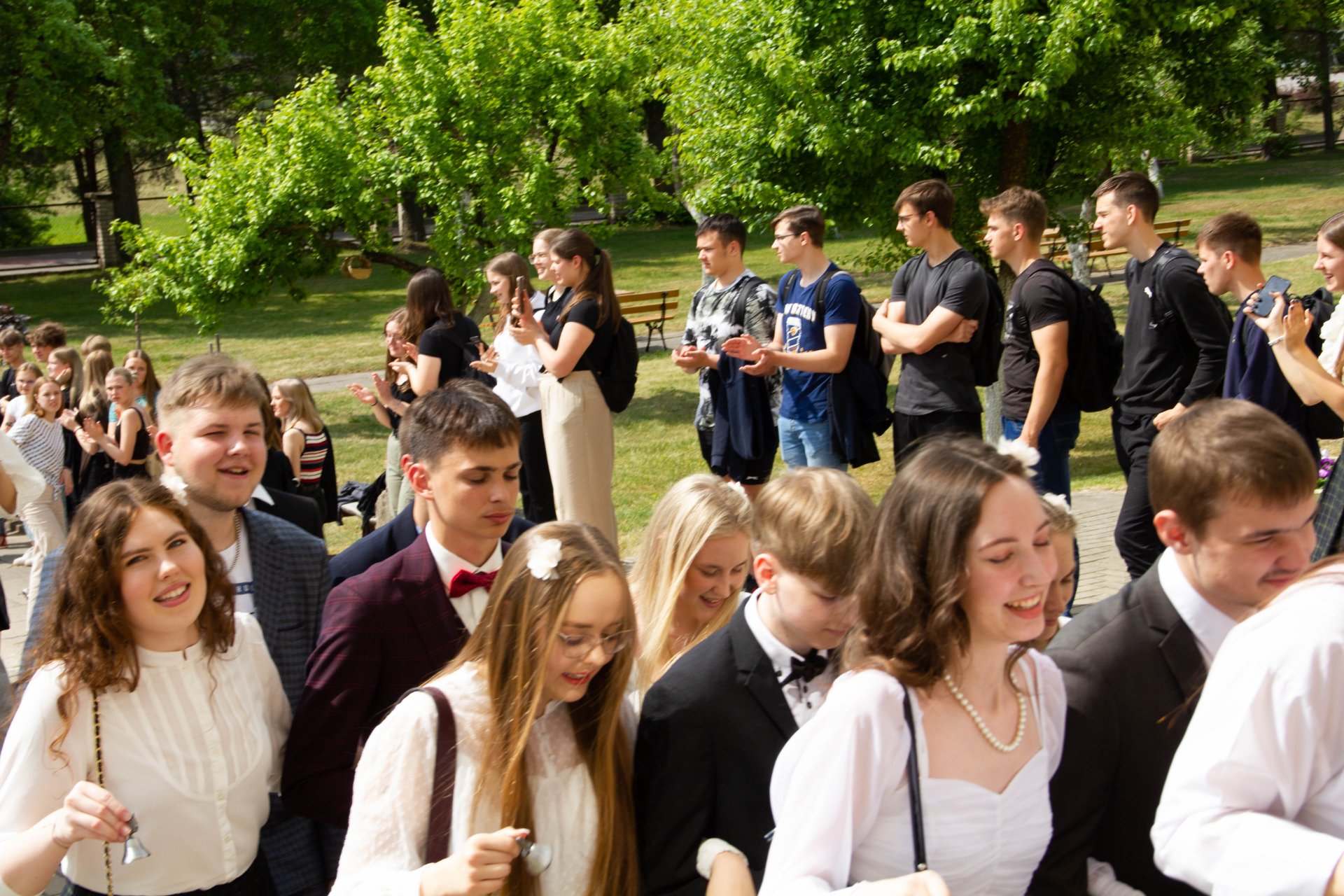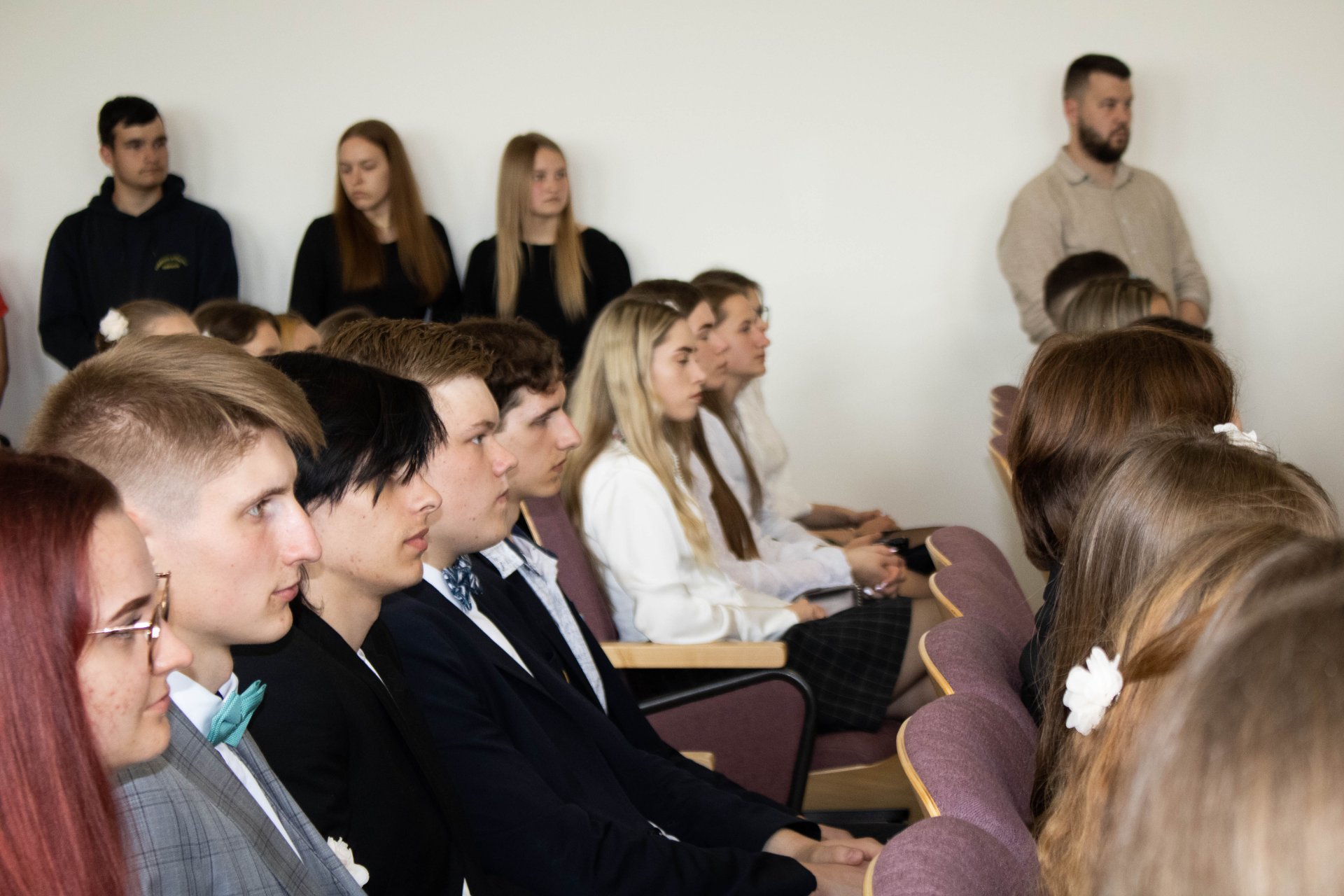 75 gimnazijos laidai nuskambėjo Paskutinis skambutis Aktų salėje Paskutinio skambučio šventė buvo jautri ir nuoširdi. Renginį tradiciškai organizavo trečiokai gimnazistai. Abiturientams širdis graudino mokinių muzikiniai pasirodymai. Kūrinius atliko vokalinis tercetas (Evelina, Gabrielė ir Jokūbas), Martyna ir grupė „Antiq“, dvi skambias dainas dovanojo vaikinų ansamblis, taip pat ukulėlių vokalinis ansamblis „Fireflies“, girdėjome Evelinos atliekamą kūrinį „Smuiko stygos“, o jai smuiku pritarė abiturientas Jokūbas, ketvirtokai žavingai sukosi valso sūkury. Trečiokas Vincentas skaitė savo kūrybos eilėraštį ir kvietė neliūdėti, juk pavasaris, apie jaunystės šėlsmą ketvirtokų gyvenime buvo ir trečiokų sukurtas filmukas. Padrąsinantys ir sugraudinantys, viltingi ir jautrūs žodžiai skambėjo iš gimnazijos direktorės Astos Valuntienės, buvusio direktoriaus Kęstučio Razumo, direktoriaus pavaduotojos ugdymui Rasos Augustinaitienės (beje, patiems aktyviausiems ji įteikė padėkos raštus), mokinių prezidentės Gretos Gudaitės, abiturientų pirmųjų mokytojų ir buvusių auklėtojų lūpų, taip pat padėkos ir atsisveikinimo žodį tarė ir patys abiturientai. Tylos minute prisimintas ir pagerbtas buvusio auklėtojo, mokytojo Juozo Vėdaro atminimas. Be to, šventėje dalyvavo ir sporto centro direktorė Aušra Dvelienė, kuri tarė sveikinimo žodį ir įteikė padėkos raštus geriausių sporto rezultatų pasiekusiems abiturientams.