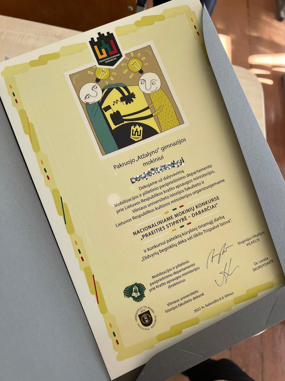Prieš metus keletas gimnazijos mokinių komandų dalyvavo konkurse „Praeities stiprybė – dabarčiai“. Stropiai dirbusios grupės buvo apdovanotos kelione į Vilnių, o aukštesnę vietą užėmusiems komandos nariams, kurie pateko į geriausiųjų dešimtuką, įteikti padėkos raštai. Balandžio 8 diena prasidėjo Vilniaus universitete, kuriame visi išklausėme istorijos dėstytojo vedamą istorijos pamoką ir sulaukėme apdovanojimų. Be abejo, nuvežėme lauktuvių, kurias gamino technologijų mokytojas E. Impolis. Toliau keliavome susipažinti su bioarcheologija. Daug įdomios informacijos suteikė bioarcheologė dr. Justina Kozakaitė. Jos pagrindinis tyrimų informacijos šaltinis yra žmogaus kūnas, kaulai. Žinoma, gimnazistams buvo suteikta proga iš arti pamatyti tikrus žmogaus kaulus (XVII a.). Įpusėjus dienai keliavome į Istorijų namus, kuriuose gidė supažindino su paroda „Ką slepia sarkofagas?“ Na, o po to visų laukė paskutinis kelionės tikslas prieš pietų pertrauką – Gedimino pilies bokštas. Jame gidė papasakojo istorijų apie pilį ir priminė jau žinomų faktų. Atėjo pietų metas, kurių visi skubėjome į Generolo Jono Žemaičio Lietuvos karo akademiją. Pasistiprinę lyg tikri kareivėliai ėjome susipažinti su batalionu ir tikra karių amunicija. Pagaliau buvo sulaukta ir praktinių veiklų. Kiekvienam teko išbandyti šaudymą lazeriniais ginklais ir varžytis, kas pataikys arčiausiai centro. Trys taikliausi gimnazistai buvo apdovanoti. Namo grįžome sužinoję daug naujos informacijos. Džiaugiamės ir laukiame būsimų projektų – esame pasiruošę naujiems iššūkiams!