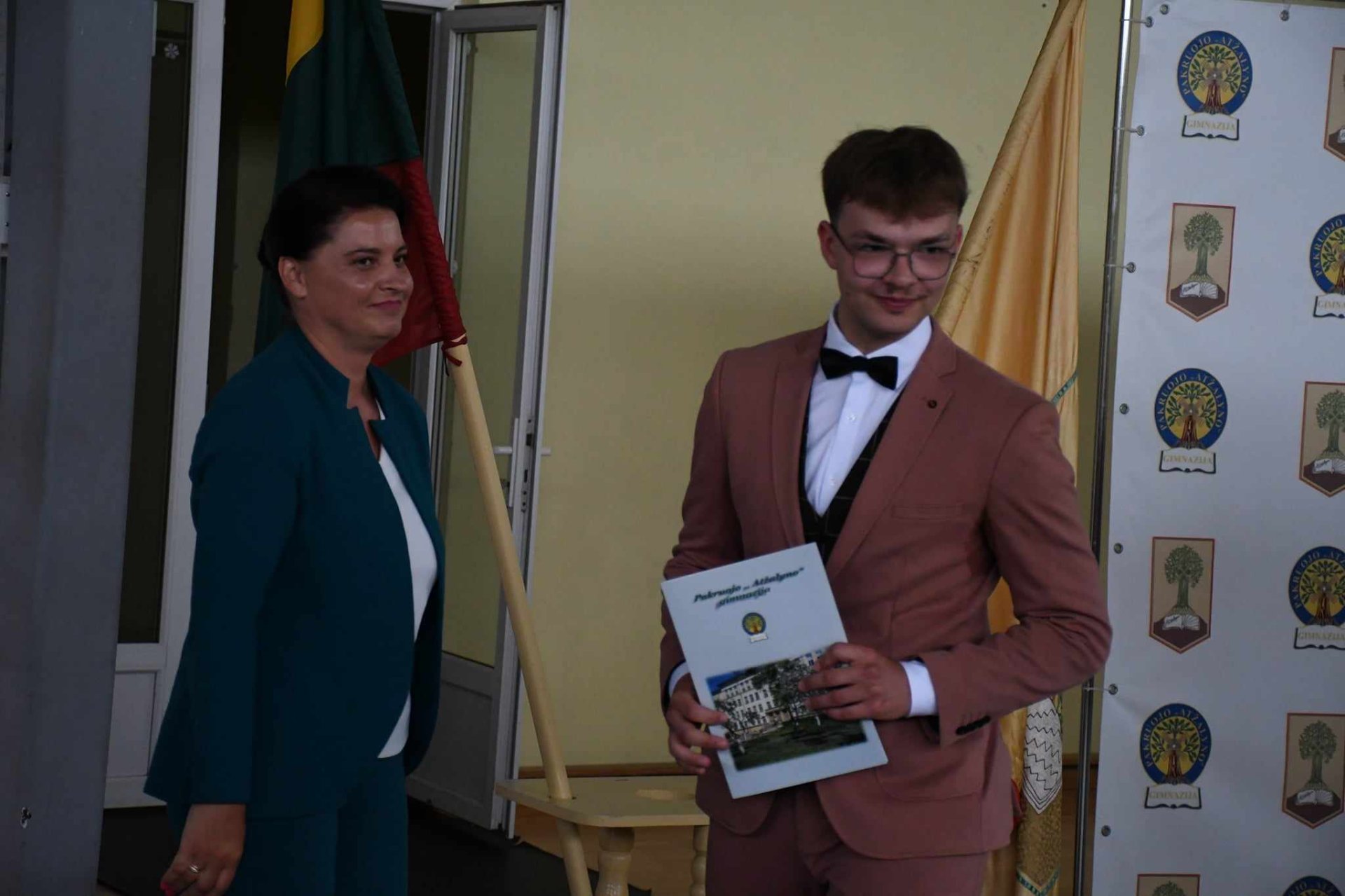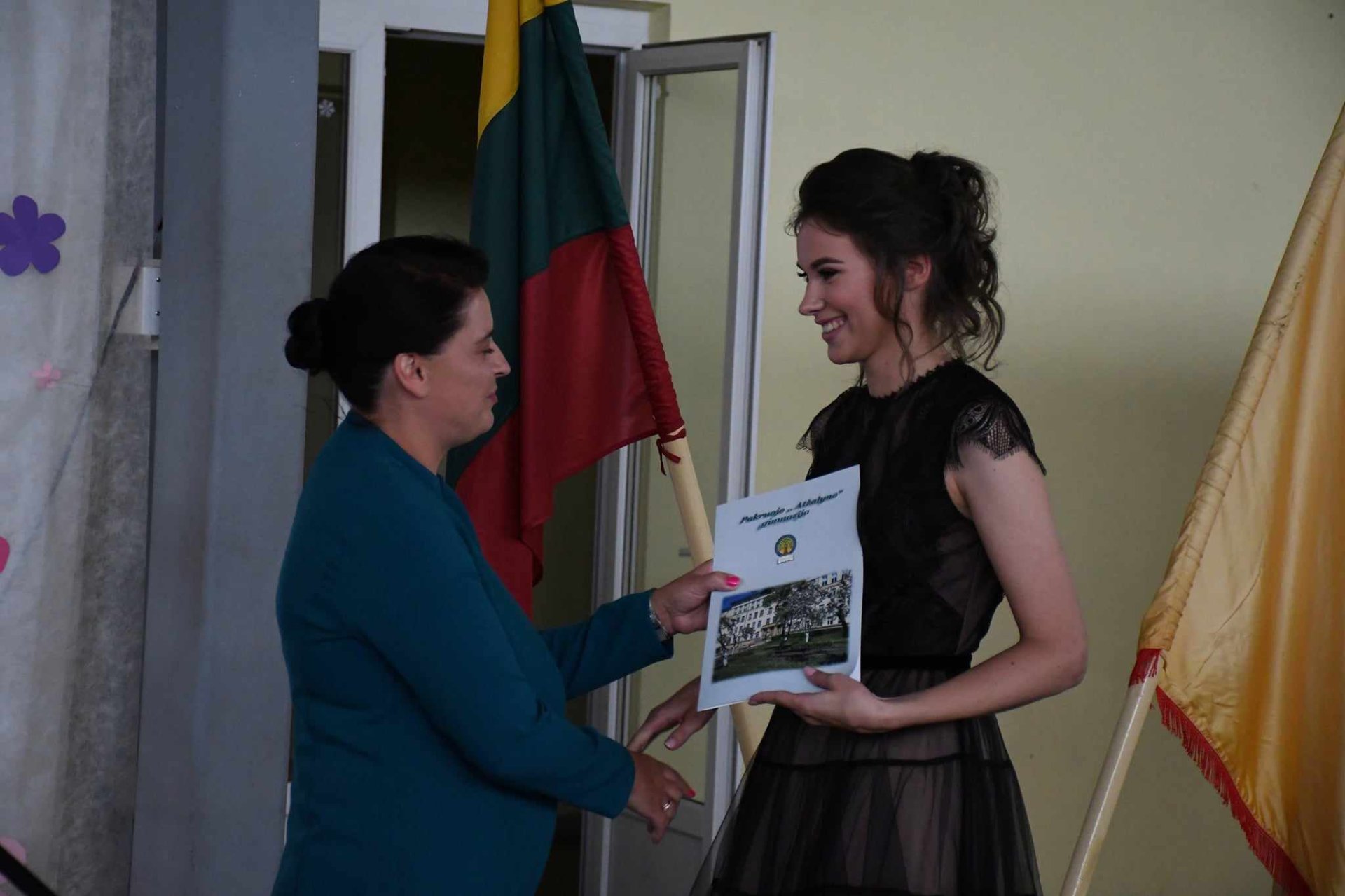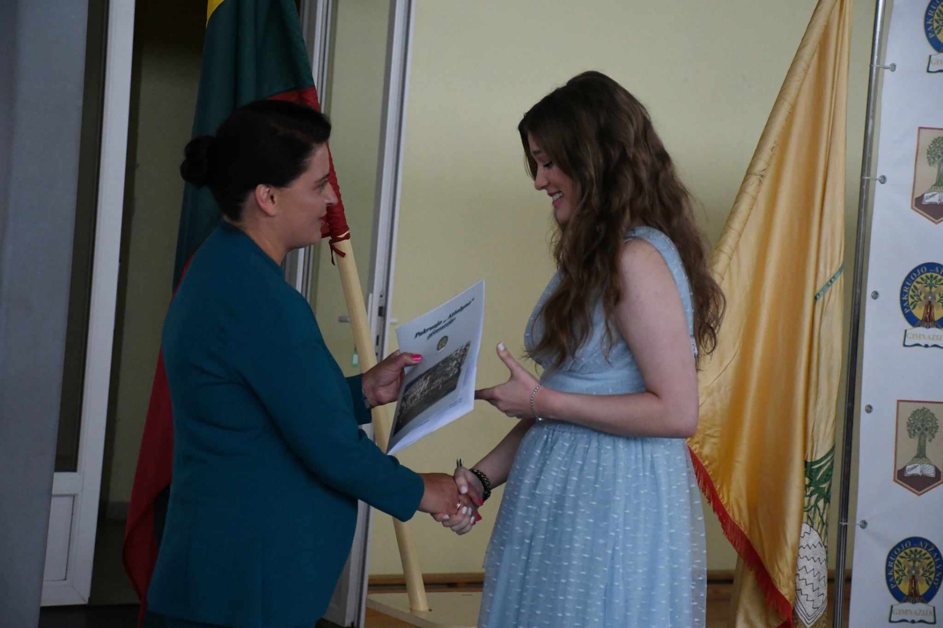 Po šv. Mišių gražus abiturientų būrys pasuko gimnazijos link, kur vyko iškilminga brandos atestatų įteikimo šventė. Sveikinimo žodį tarė gimnazijos direktorė Asta Valuntienė. Vadovė pasidžiaugė brandžiais abiturientais, pasiruošusiais savarankiško gyvenimo kelionei, dėkojo mokytojams, auklėtojoms, tėveliams. Direktorė pasveikino abiturientes Agnę Milaknytę (IV a kl.), Gerdą Bertulytę (IV b kl.) ir  Gabiją Grinaitę (IV b kl.), kurios už lietuvių kalbos ir literatūros VBE gavo 100-ukus. Renginyje dalyvavo Pakruojo rajono savivaldybės meras Saulius Margis, Pakruojo švietimo skyriaus vedėja Irena Mažulienė, Seimo narys Antanas Matulas, Pakruojo rajono savivaldybės tarybos narė, Seimo nario Antano Matulo padėjėja Erika Kižienė, Pakruojo seniūnas Svajūnas Miknevičius, gimnazijos mokinių prezidentė Greta Gudaitė. Abiturientams linkėta nebijoti iššūkių, tikėti savimi, baigus studijas grįžti į gimtąjį kraštą ir gerais darbais jį garsinti. Seimo narys Antanas Matulas kiekvienam abiturientui dovanojo po Lietuvos Respublikos Konstitucijos knygelę.