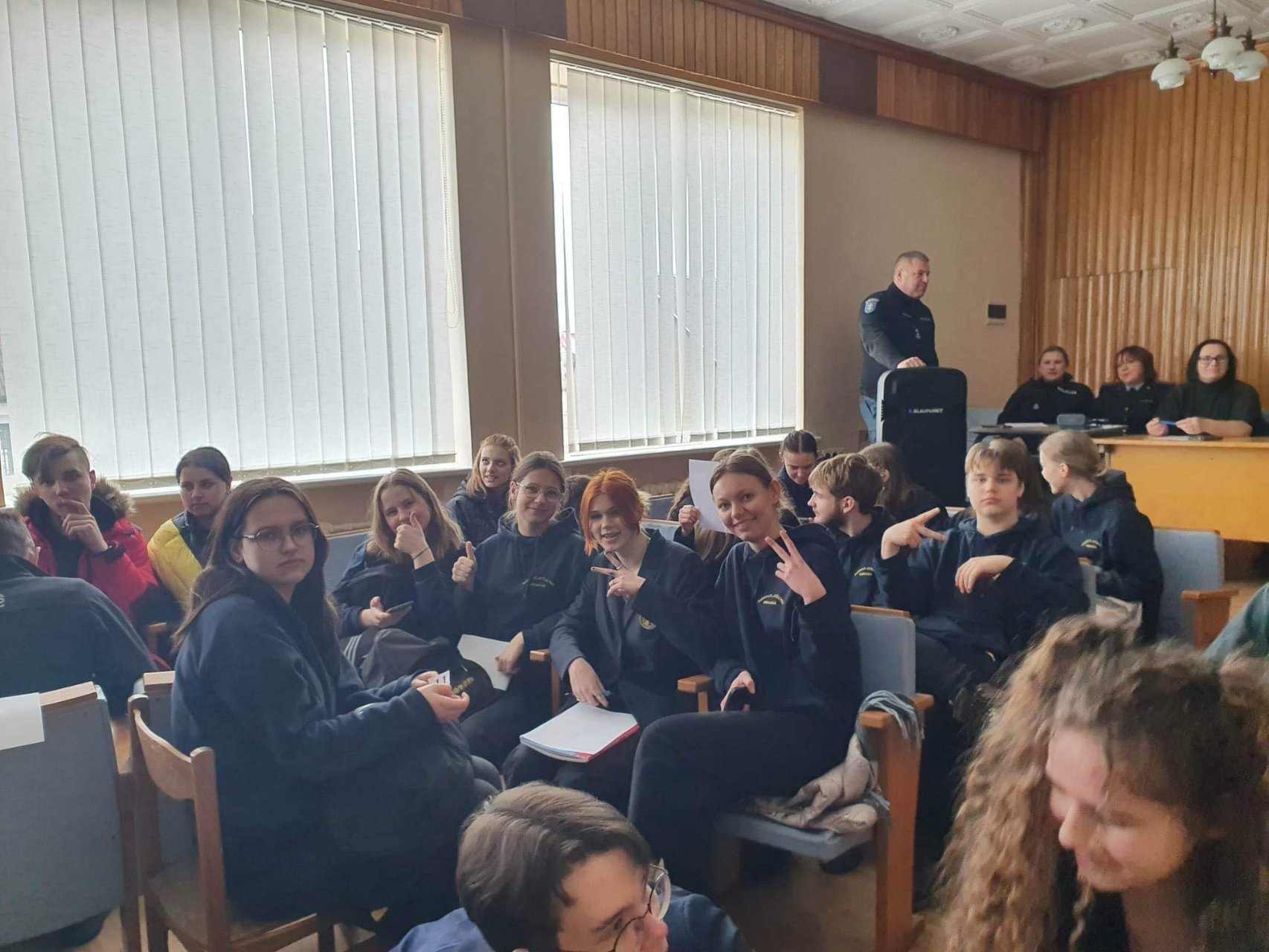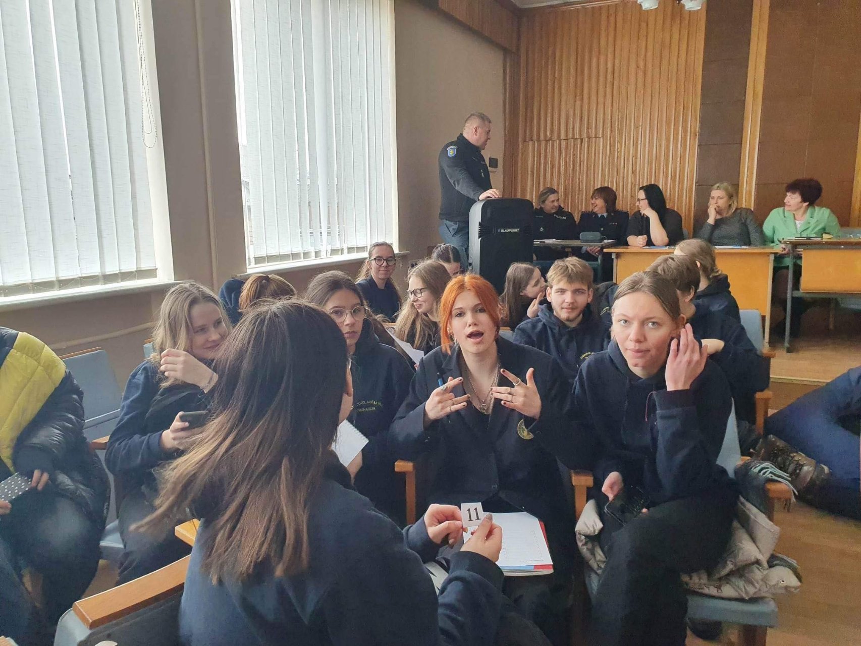Kovo 14 dieną 5 Pakruojo „Atžalyno“ gimnazijos mokinių komandos pasitikrino savo žinias policijos organizuojamame mokinių teisinių žinių konkurse, kurio tikslas – ugdyti mokinių supratimą apie teisinę sistemą, vykdyti ankstyvąją teisės pažeidimų, narkomanijos, smurto prevenciją, suteikti jauniems žmonėms žinių, kuriant saugią aplinką. Mūsų gimnazijos mokiniai šiame konkurse dalyvauja jau keletą metų iš eilės. Iš tiesų šiemet nustebino organizuojamo konkurso vieta. Iš viso dalyvavusios 13 komandų susirinko mažoje bei jaukioje salėje, draugiškai dalijosi savo žiniomis su kaimynais. Ruošdamiesi mokiniai įgijo naujos patirties bei susipažino su Lietuvos Respublikos Konstitucijos, LR baudžiamojo kodekso, administracinių nusižengimų kodekso, LR vaiko minimalios ir vidutinės priežiūros įstatymo bei kelių eismo taisyklių temomis. Konkurse gimnazistai smagiai praleido laiką, atliko kūrybinę užduotį – per 20 minučių reikėjo sukurti reklamą apie jaunimo daromus 3 pagrindinius nusižengimus. Už paruošimą ir galimybę dalyvauti „Temidės“ konkurse dėkojame istorijos mokytojai Gražinai Kairiūkštienei.