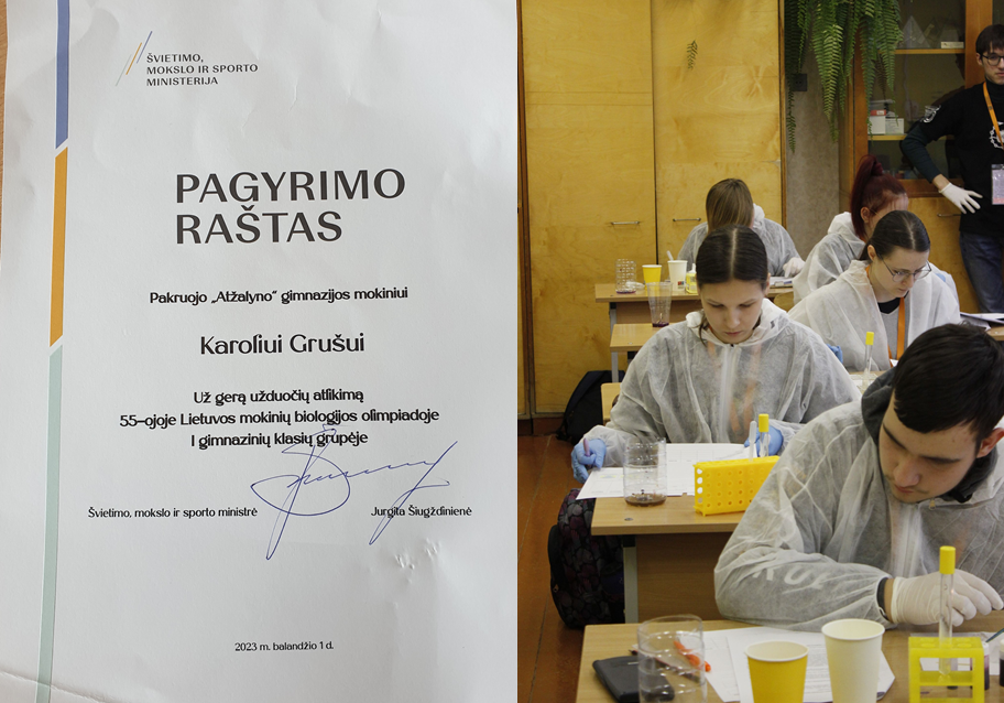 Šiais metais kovo 30-balandžio 1 dienomis Taujėnuose vyko 55-oji mokinių biologijos olimpiada. Į ją buvo pakviesti mūsų gimnazistai Karolis Grušas (I c kl.) ir Agnietė Kapučinskaitė (III b kl.) Nors medalių ir nelaimėjome, bet didžiuojamės ir džiaugiamės Karolio pasiekimu – mokinys apdovanotas Švietimo, mokslo ir sporto ministerijos PAGYRIMO RAŠTU už gerą užduočių atlikimą.