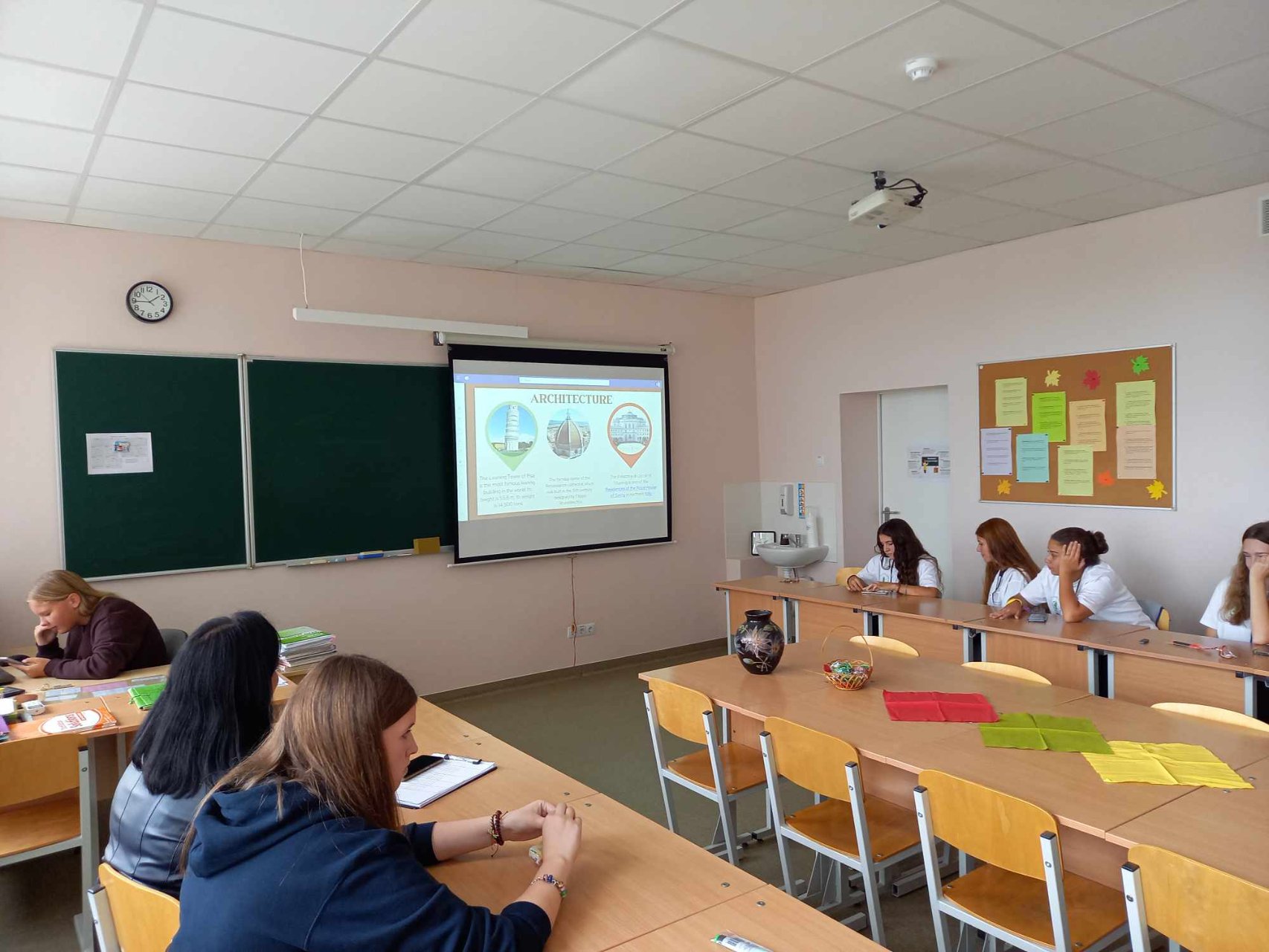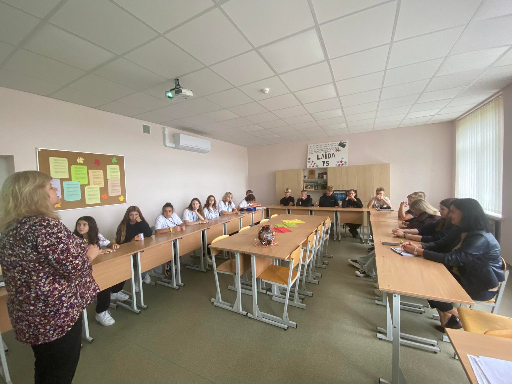 Anglų kalbos mokytoja Rasa Stravinskienė pasakoja: „Su I a klase rugsėjo 25 d. vedžiau pamoką kitaip tema „Ambasadorių suvažiavimas“ . Dalyvavo „ambasadoriai“ iš 13 šalių: Prancūzijos, Vokietijos, Italijos, Airijos, JAV, Danijos, Švedijos, Nyderlandų, Brazilijos, Portugalijos, Graikijos, Vengrijos, Ispanijos. Mokiniai kūrybiškai ir vaizdžiai pristatė savo šalis, įžymius tos šalies žmones, pamokė tos kalbos žodžių ir frazių. Dalyvių laukė siurprizas – Guostė, kuri pristatė Ispaniją, atsivedė į pamoką draugę iš Barselonos, kuri jai padėjo, nes papasakojo apie savo šalį. Be to, dalyvavo dar dvi viešnios iš Ispanijos. Pamokos pabaigoje daviau užduotį visiems dalyviams: palinkėjimus, užrašytus ant lietuviško saldainio, išversti į tų šalių kalbas, kurias jie pristatė. Visas frazes užrašėme lentoje.“