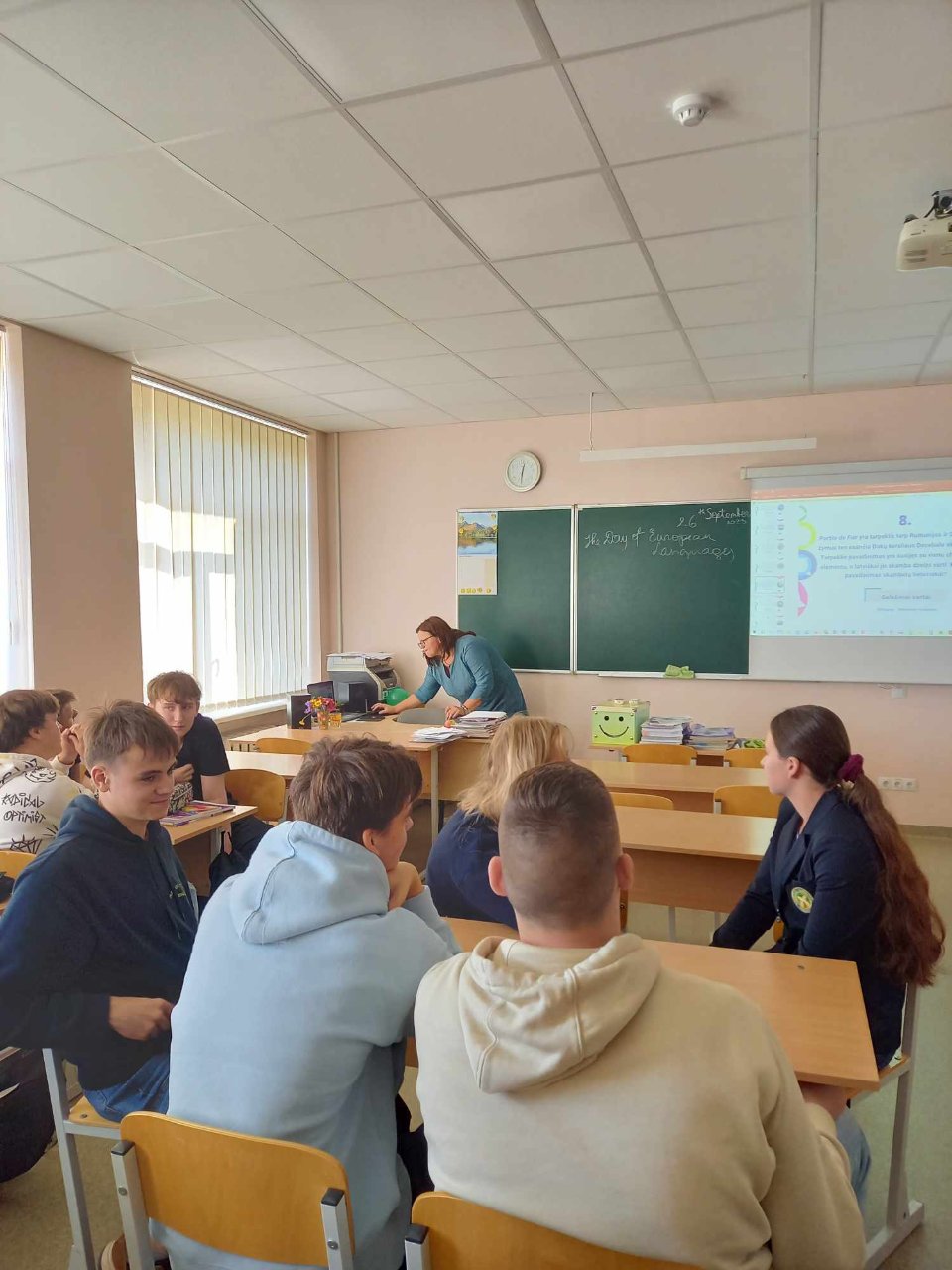 Anglų kalbos mokytoja Vilma Sabaliauskienė apie šią dieną: „Rugsėjo 26-ąją pirmokai ir antrokai atliko „Protų mūšio“ užduotis, kurios buvo skirtos Europos kalbų dienai. Pamokos pabaigoje aptarėme, kas labiausiai įsiminė. Taigi, mus nustebino faktas, kad ispanų himne nėra žodžių. Sužinojome apie jodliavimą, žinių perdavimo būdą, kadaise paplitusį kalnuotose vietovėse, be to, išgirdome, kas slepiasi po trumpiniu Wi-Fi bei SMS. Visų atradimas buvo NATO fonetinės abėcėlės kalba, kurią vartoja ne tik kariai, bet ir ugniagesiai, policininkai ir pilotai, duodami komandas esant prastam ryšiui. Visi užsirašėme savo vardus pagal šią abėcėlę. Mūsų gimnazijos pavadinimas NATO fonetine kalba būtų toks: Alpha, Tango, Zulu, Alpha, Lima, Yankee, November, Alpha, Sierra.