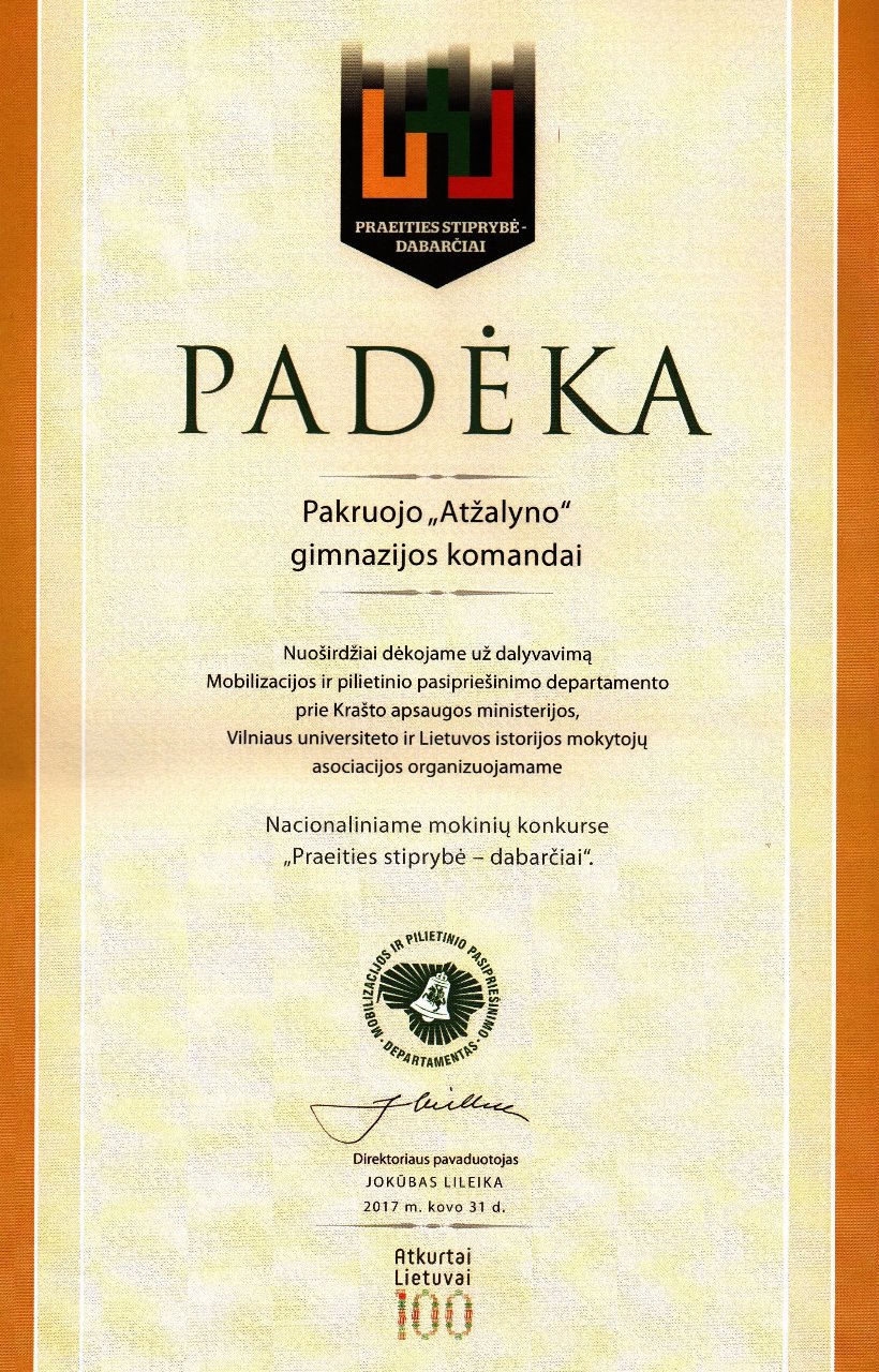 2017 m. balandžio 20 d. Pakruojo miesto parke vyko rajono bendrojo lavinimo mokyklų 1998-2001 m. gimusių jaunuolių lengvosios atletikos kroso estafečių varžybos. Pakruojo „Atžalyno“ gimnazijos komanda užėmė I vietą.