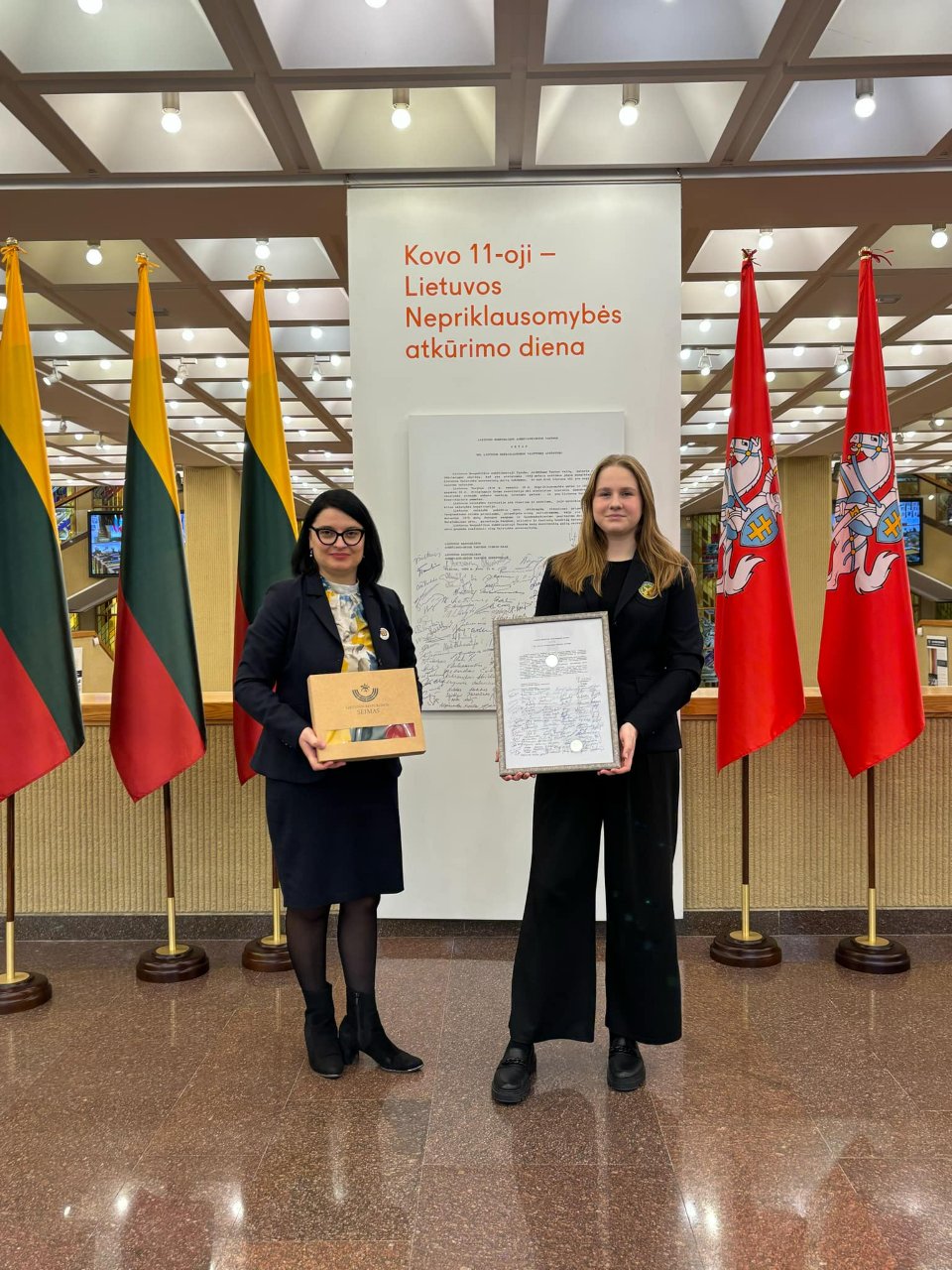 Kovo 11-ąją gimnazijos direktorė Asta Valuntienė ir trečiokė Gustė Mitkaitė dalyvavo Lietuvos Respublikos Seime vykusiame iškilmingame minėjime, kuris buvo skirtas Lietuvos Nepriklausomybės atkūrimo 35-mečiui. Kovo 11-osios akto signatarų iniciatyva visų Lietuvos savivaldybių atstovai gavo dovanų. Gimnazistei įteikta simbolinė „Signatarų trispalvė“ ir Kovo 11-osios akto kopija. Susitikta ir pabendrauta su Lietuvos Respublikos Seimo nare Ilona Gelažnikiene. Direktorė Asta Valuntienė ir mokinė Gustė Mitkaitė dovanas parvežė į Pakruojo „Atžalyno“ gimnaziją.