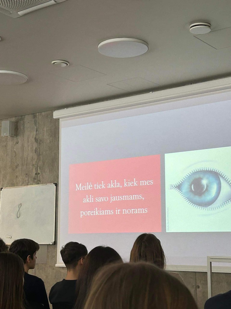 Visuomenės sveikatos fakulteto Sveikatos psichologijos katedros asistentė Goda Martinkutė skaitydama paskaitą „Kodėl sakoma, kad meilė yra akla?“ įtraukė klausytojus į diskusiją apie meilę, apie tai, kokius jausmus jaučiame mylėdami ar įsimylėję, kas yra „toksiški santykiai“, kaip išsirinkti tinkamą žmogų, kad mūsų širdis nebūtų sudaužyta, kokios yra „meilės kalbos“.