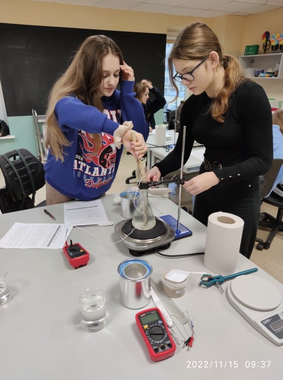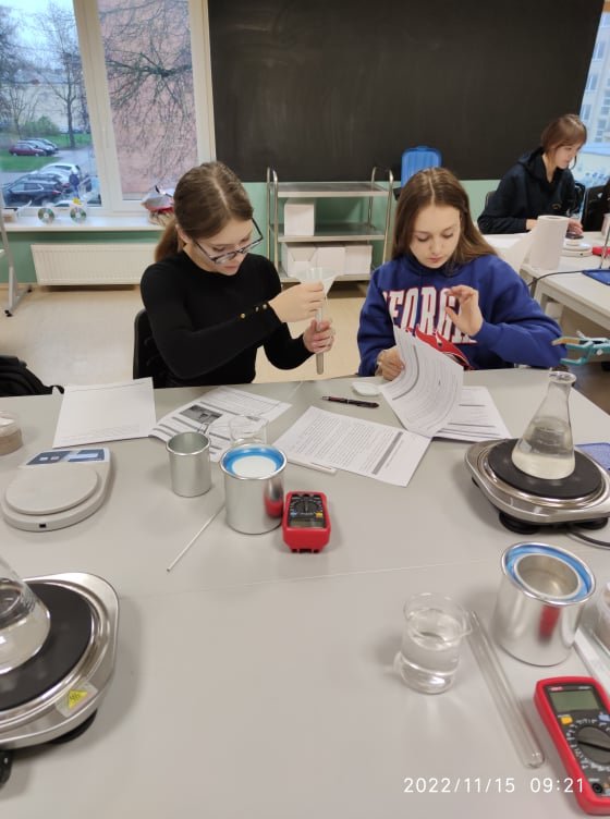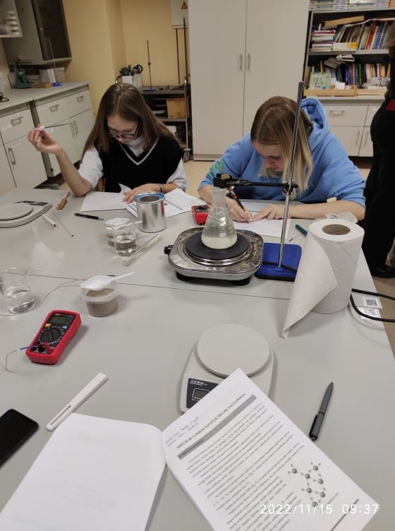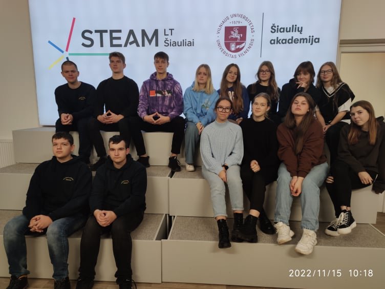 Lapkričio 15 d. grupelė pirmokų ir antrokų gimnazistų kartu su fizikos mokytoja Vida Imanavičiūte vyko į VU Šiaulių akademijos STEAM centro fizikos ir inžinerijos laboratoriją. Mokiniai atliko tiriamąjį darbą „Šiluminių ir elektrinių gamtos reiškinių tyrimas“. Atlikdami tyrimą bandėme nustatyti ir palyginti smėlio bei vandens savitąsias šilumas, taip pat matavome, koks yra elektros laidumas skirtingo dirvožemio vandenyje. Kiekviena veikla buvo didelė patirtis. Tirdami vandens elektros laidumą filtravome tris skirtingus dirvožemius, gautus filtratus matavome jutikliais, kurių rodmenys buvo pateikti kompiuteriuose. Atlikdami smėlio ir vandens tyrimą kaitinome smėlį, stebėjome jo ir vandens temperatūras, atlikome skaičiavimus.