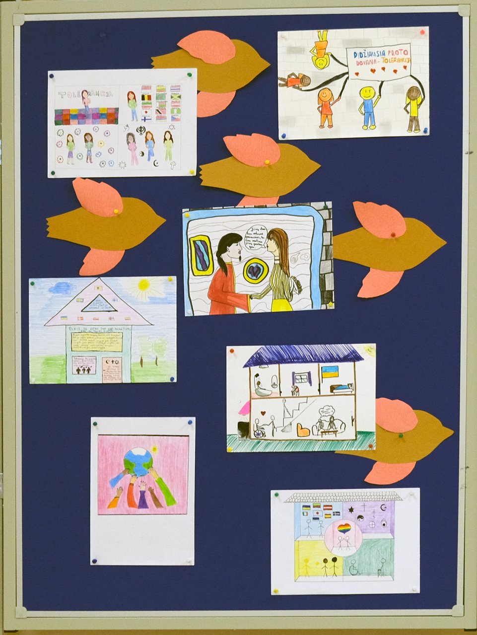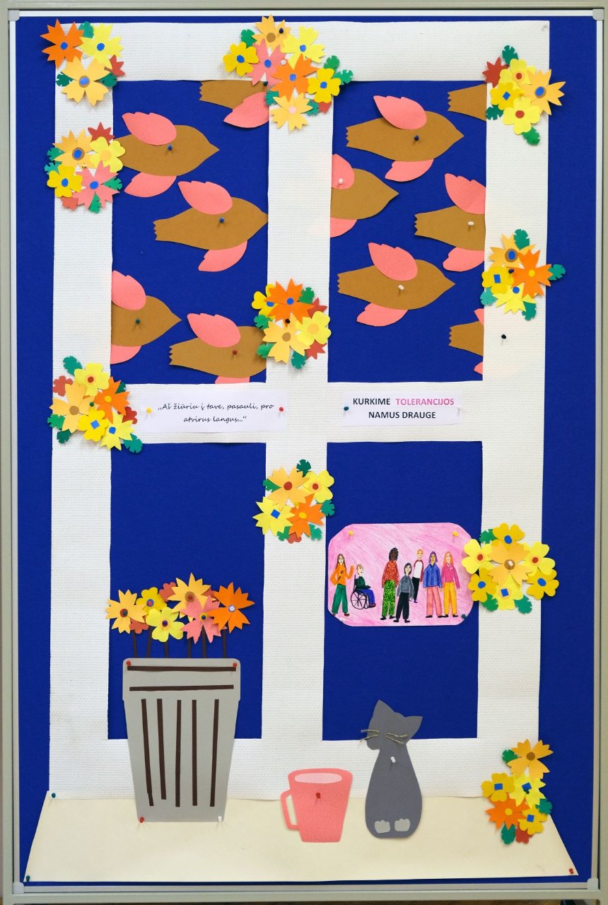 Mokyklos bendruomenė nėra abejinga problemoms, kurios iškyla dėl tolerancijos stokos. Vis dar susiduriame su neapykanta kitos tautos, religijos ar rasės žmogui. Todėl susibūrėme ir sukūrėme tokį stendą, kuris simbolizuoja „Tolerancijos namą“. Jauniausieji gimnazistai per dorinio ugdymo (tikybos ir etikos) pamokas samprotavo, kas galėtų vykti už „Tolerancijos namo“ sienų, jiems padėjo mokytoja Laimutė Činčienė. Savo pamąstymus mokiniai perteikė piešiniuose. Dailės pamokose įvairių klasių gimnazistai stropiai karpė nuotaikingas dekoracijas.