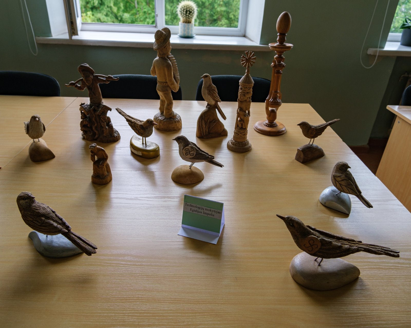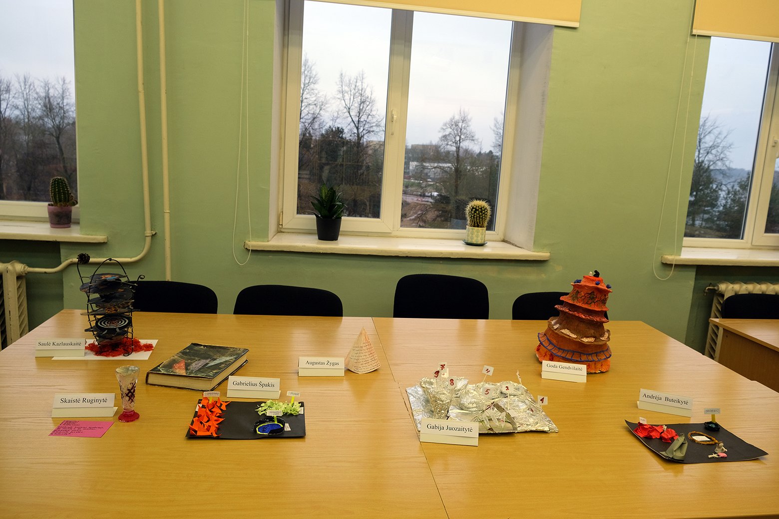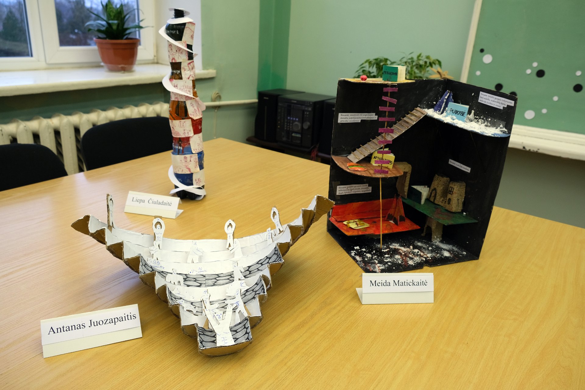 Gegužės 27 dieną gimnazijos bibliotekoje pasklido skrabalų muzika, atliekama mokytojo Egidijaus Impolio, – buvo pristatyta gimnazijos mokytojų ir mokinių kūrybos darbų paroda. Iki pat mokslo metų pabaigos bibliotekos lankytojai žavėjosi gimnazijos specialiosios pedagogės Intos Bulaitienės, muzikos mokytojos Vaivos Klupšienės, dailės mokytojos Simonos Čemoškaitės, technologijų mokytojo Egidijaus Impolio kūriniais, Eglės Pupinytės (I a), Emili Mackonytės (I a), Nidos Stanevičiūtės (I c) iš siūlų sukurtu grožiu, Eglės Pupinytės (I a) ir Vaivos Gutauskaitės (II c) piešiniais ir didelio būrio I ir II klasių vaikinų gaminiais iš medžio. Visiems linkime gražios vasaros ir dalijamės kompiuterių sistemų inžinieriaus Mindaugo Kėblio nuotraukomis, kad neliktų nuskriausti tie, kas negalėjo „gyvai“ pamatyti parodos.