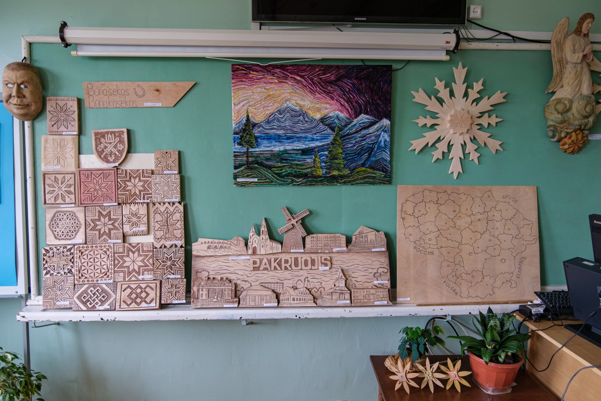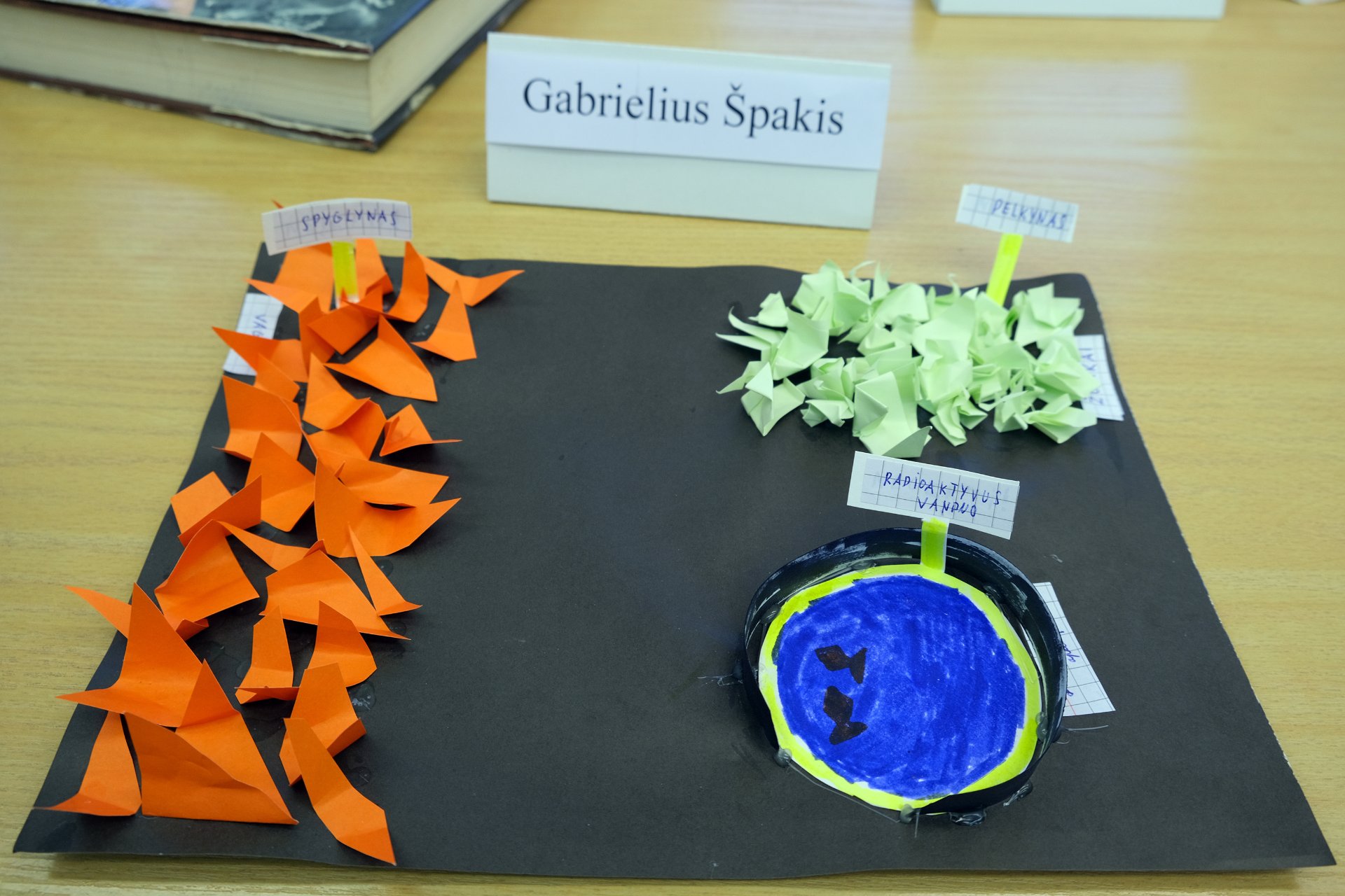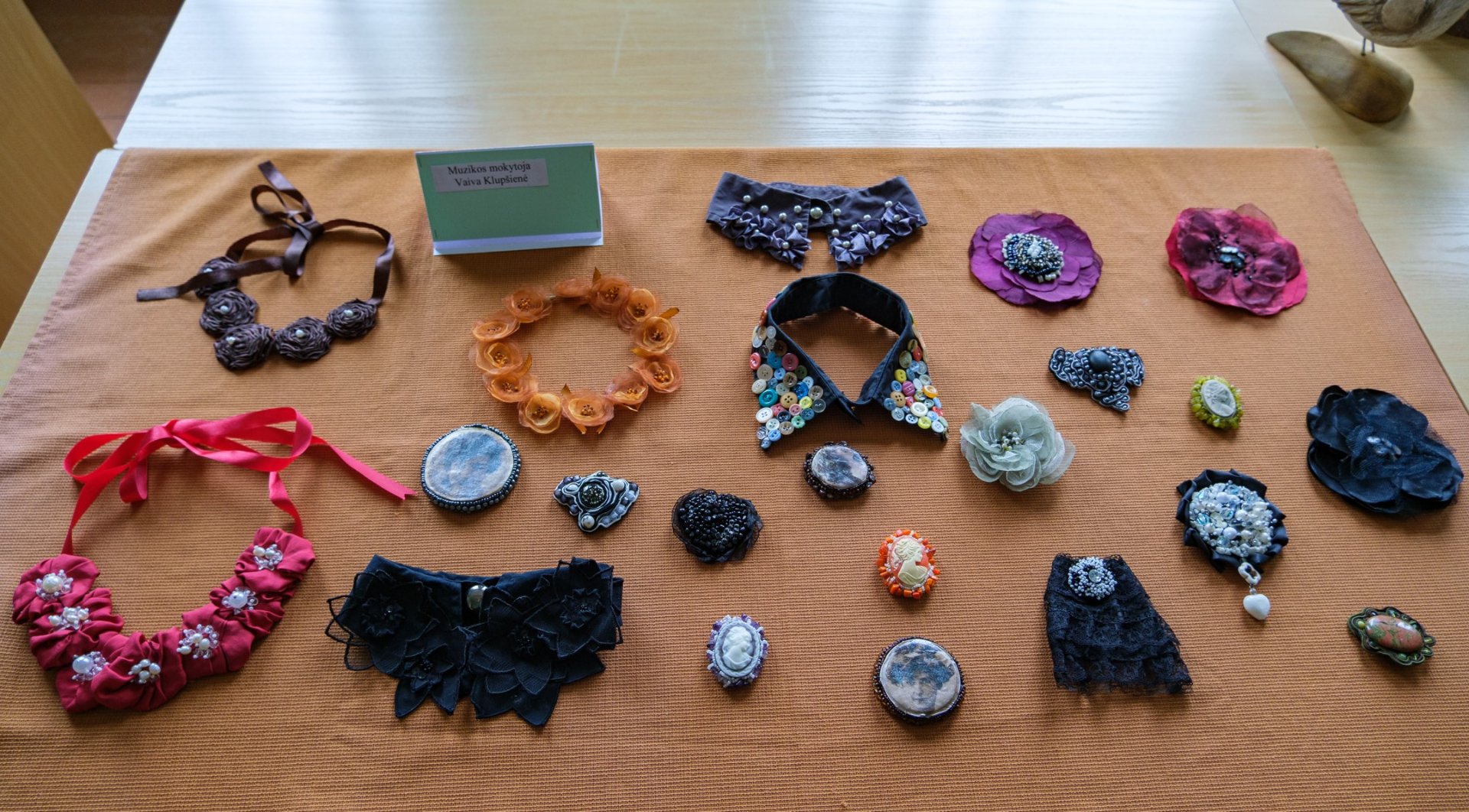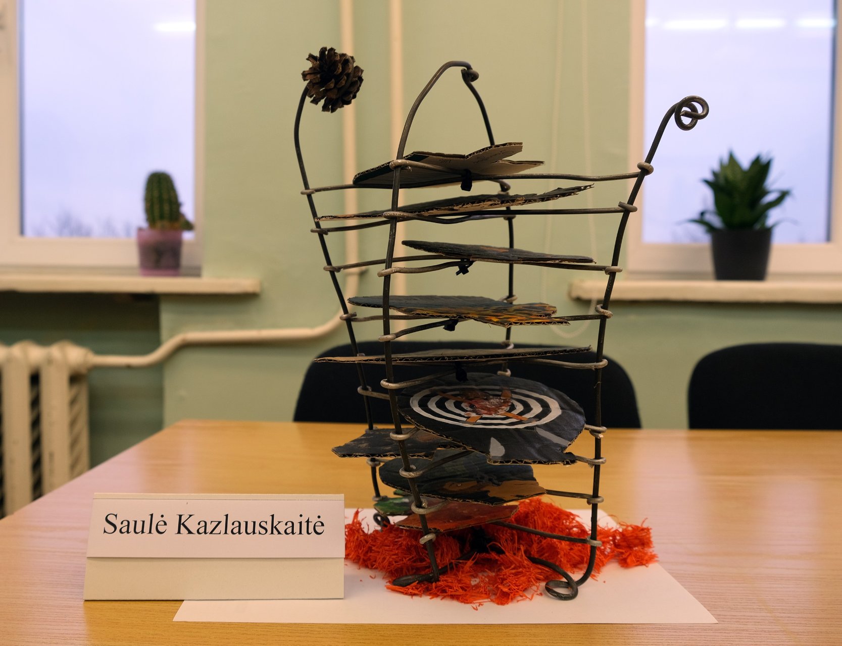 Gegužės 27 dieną gimnazijos bibliotekoje pasklido skrabalų muzika, atliekama mokytojo Egidijaus Impolio, – buvo pristatyta gimnazijos mokytojų ir mokinių kūrybos darbų paroda. Iki pat mokslo metų pabaigos bibliotekos lankytojai žavėjosi gimnazijos specialiosios pedagogės Intos Bulaitienės, muzikos mokytojos Vaivos Klupšienės, dailės mokytojos Simonos Čemoškaitės, technologijų mokytojo Egidijaus Impolio kūriniais, Eglės Pupinytės (I a), Emili Mackonytės (I a), Nidos Stanevičiūtės (I c) iš siūlų sukurtu grožiu, Eglės Pupinytės (I a) ir Vaivos Gutauskaitės (II c) piešiniais ir didelio būrio I ir II klasių vaikinų gaminiais iš medžio. Visiems linkime gražios vasaros ir dalijamės kompiuterių sistemų inžinieriaus Mindaugo Kėblio nuotraukomis, kad neliktų nuskriausti tie, kas negalėjo „gyvai“ pamatyti parodos.