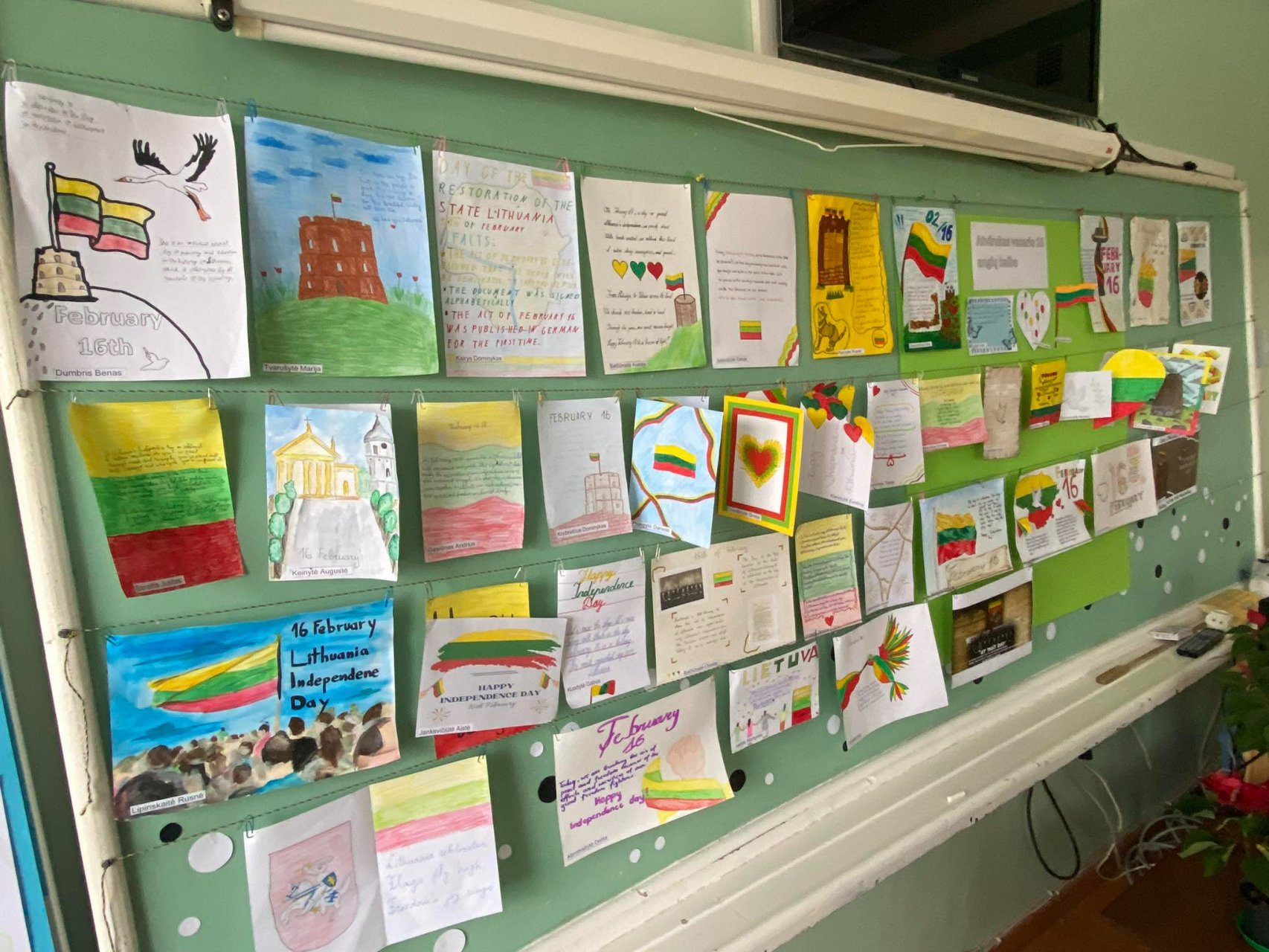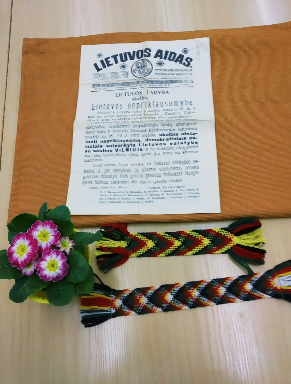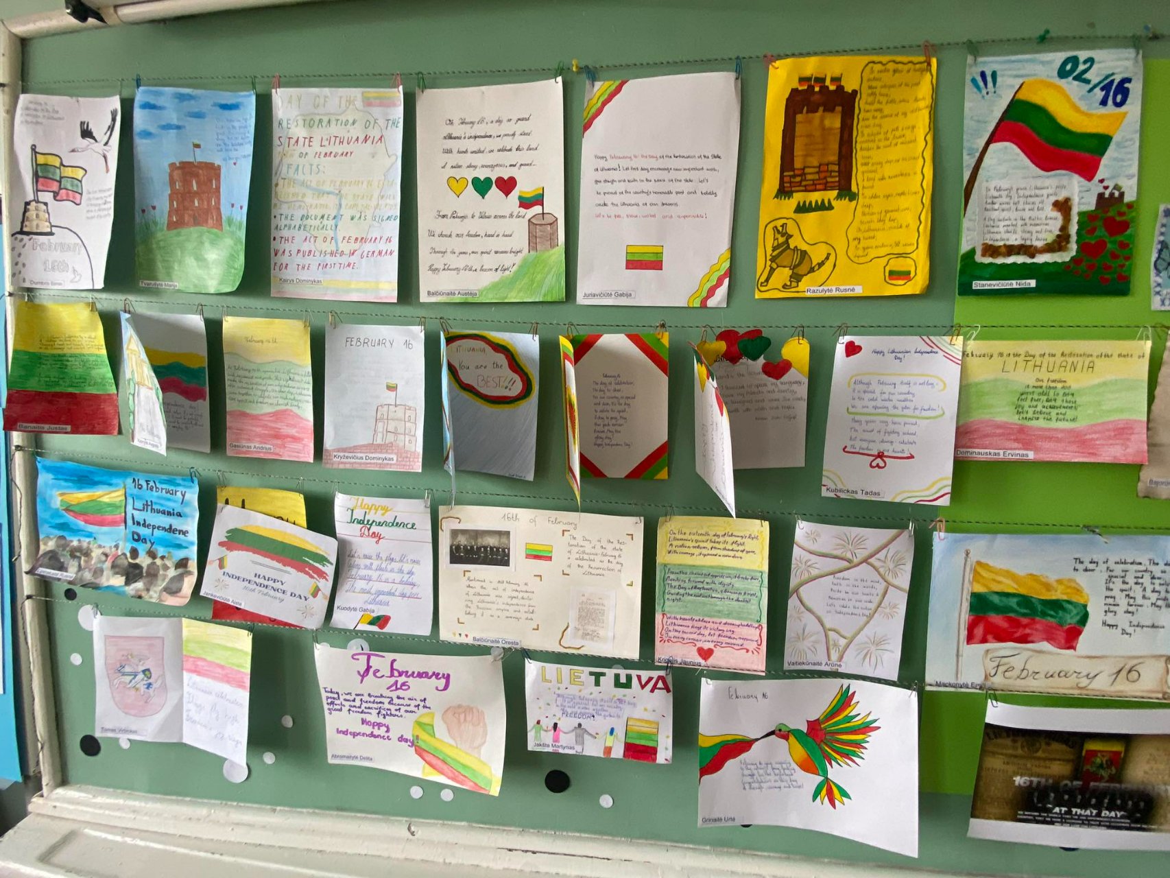 Artėjant Vasario 16-ajai gimnazijos langai nušvito trispalvės šviesa. Nuoširdžiai dėkojame gimnazijos įvaizdžio kūrimo grupei už kruopštų darbą. Metodinės grupės įvairiose gimnazijos erdvėse pristato kūrybinius darbus, kurie akcentuoja istorijos svarbą, tėvynės reikšmę žmogaus gyvenime, tautinės tapatybės išsaugojimo prasmę. Gimnazijos bibliotekoje – vieno kūrinio paroda smalsiems. Joje laikraščio „Lietuvos aidas“ 22 numeris, išleistas 1918 metų vasario 19 dieną. Jo tituliniame puslapyje – Lietuvos Nepriklausomybės Aktas. Beje, leidinyje publikuojami ir straipsniai, kuriuose rašoma apie lietuvių tautos laisvės troškimą, to meto pasaulio ir Lietuvos aktualijas.