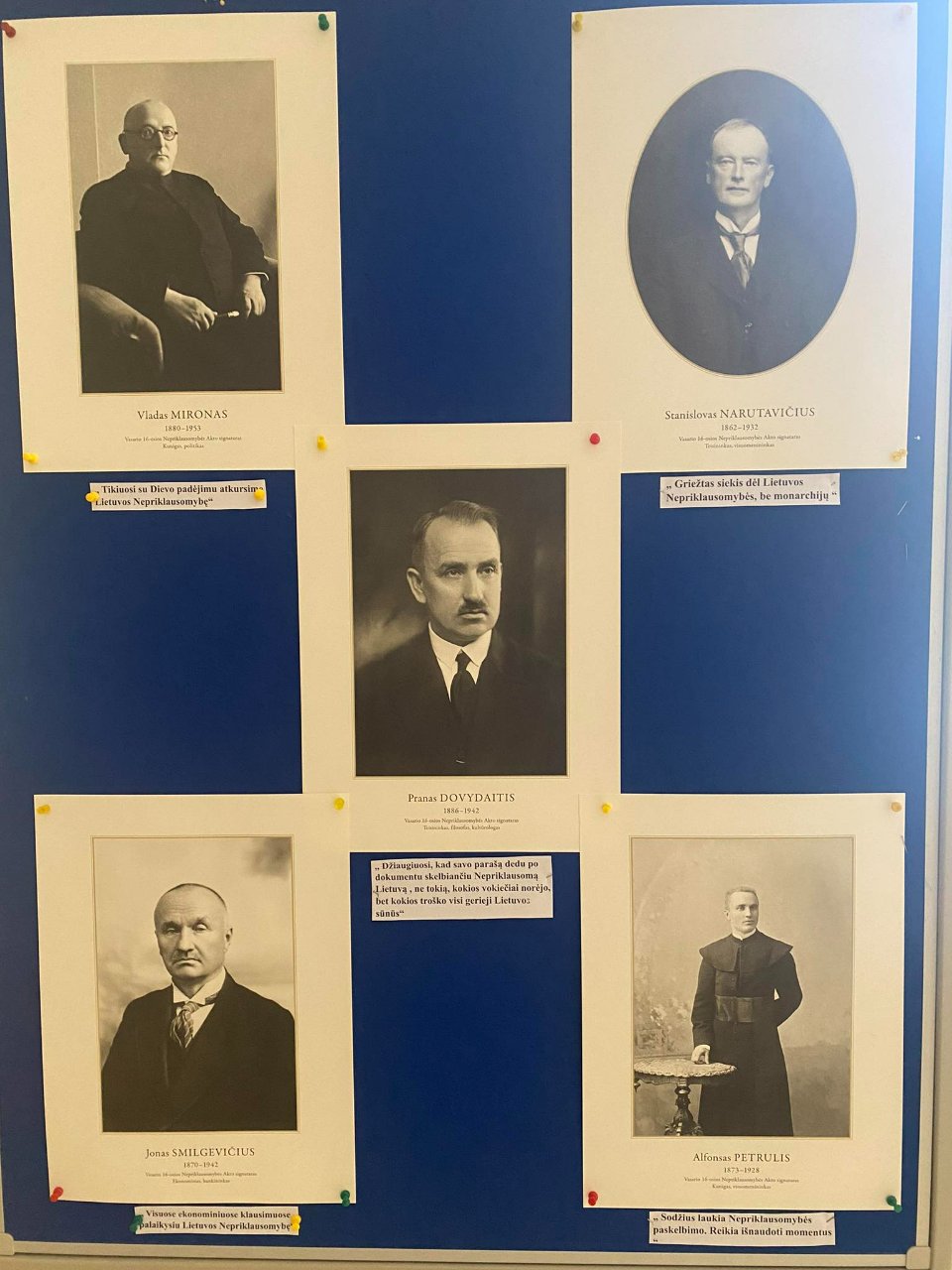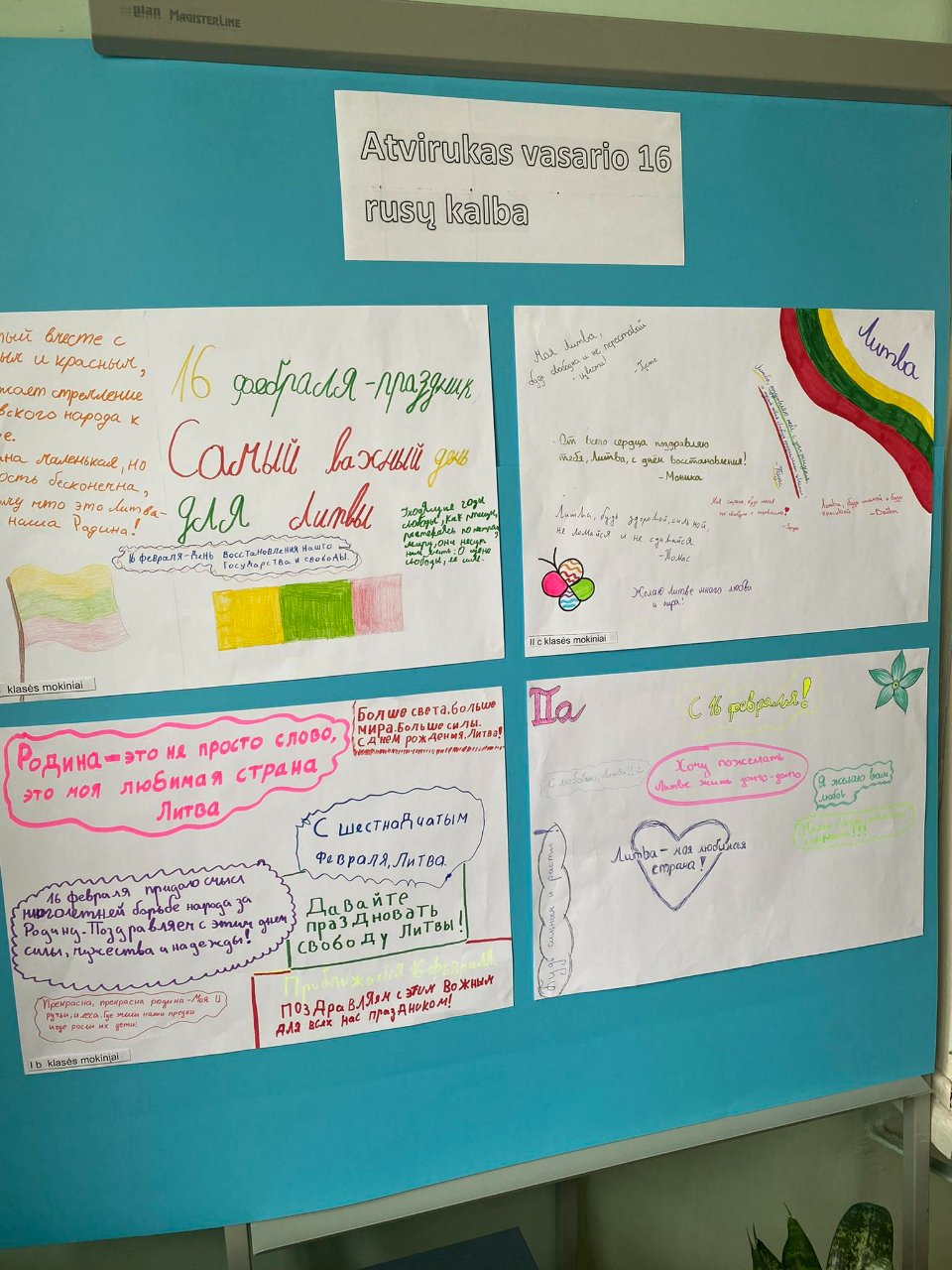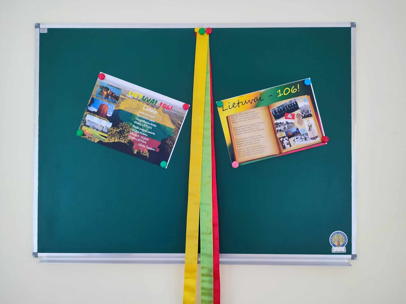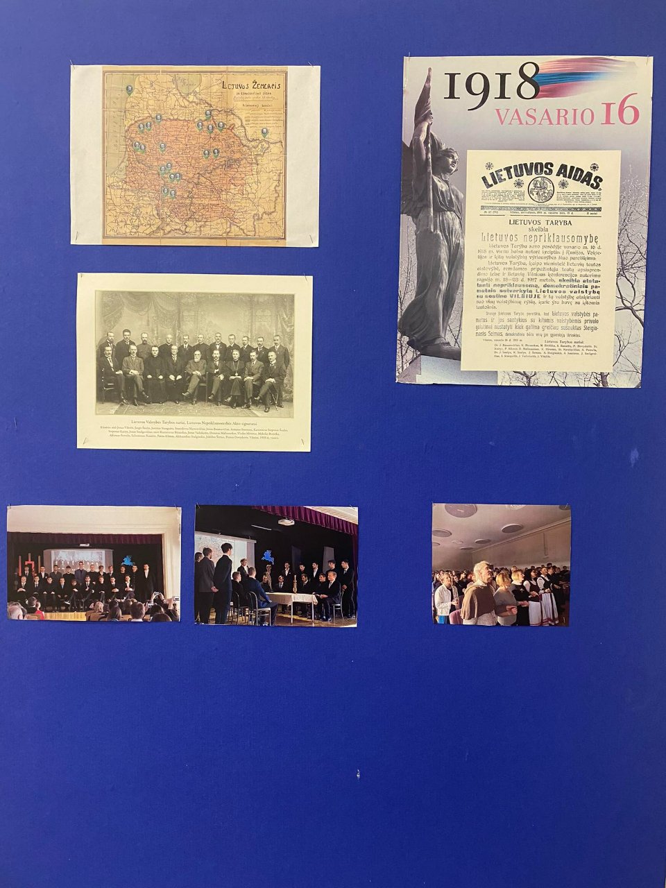 Artėjant Vasario 16-ajai gimnazijos langai nušvito trispalvės šviesa. Nuoširdžiai dėkojame gimnazijos įvaizdžio kūrimo grupei už kruopštų darbą. Metodinės grupės įvairiose gimnazijos erdvėse pristato kūrybinius darbus, kurie akcentuoja istorijos svarbą, tėvynės reikšmę žmogaus gyvenime, tautinės tapatybės išsaugojimo prasmę. Gimnazijos bibliotekoje – vieno kūrinio paroda smalsiems. Joje laikraščio „Lietuvos aidas“ 22 numeris, išleistas 1918 metų vasario 19 dieną. Jo tituliniame puslapyje – Lietuvos Nepriklausomybės Aktas. Beje, leidinyje publikuojami ir straipsniai, kuriuose rašoma apie lietuvių tautos laisvės troškimą, to meto pasaulio ir Lietuvos aktualijas.