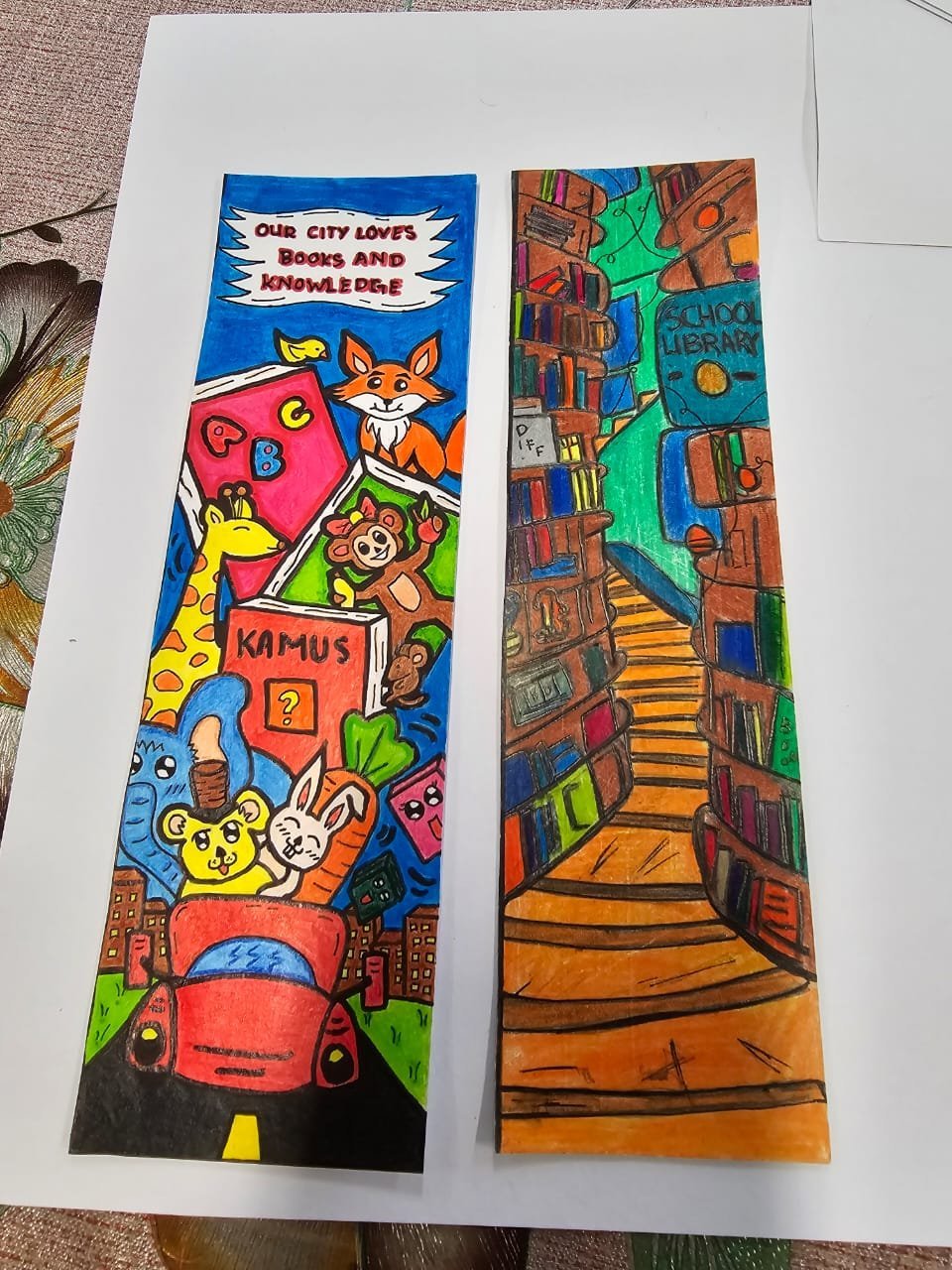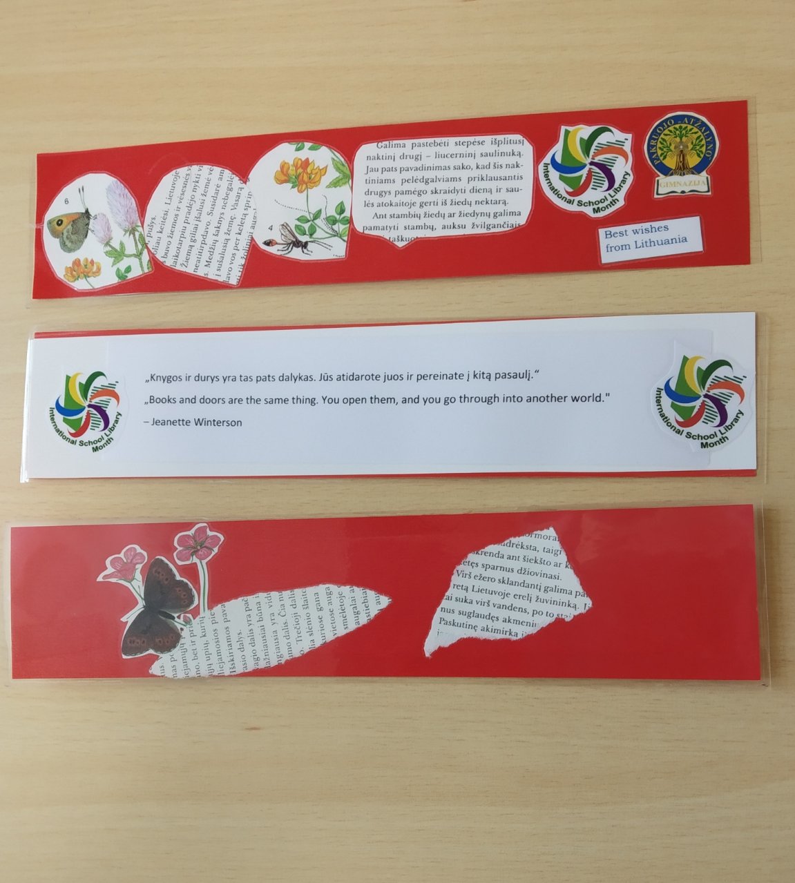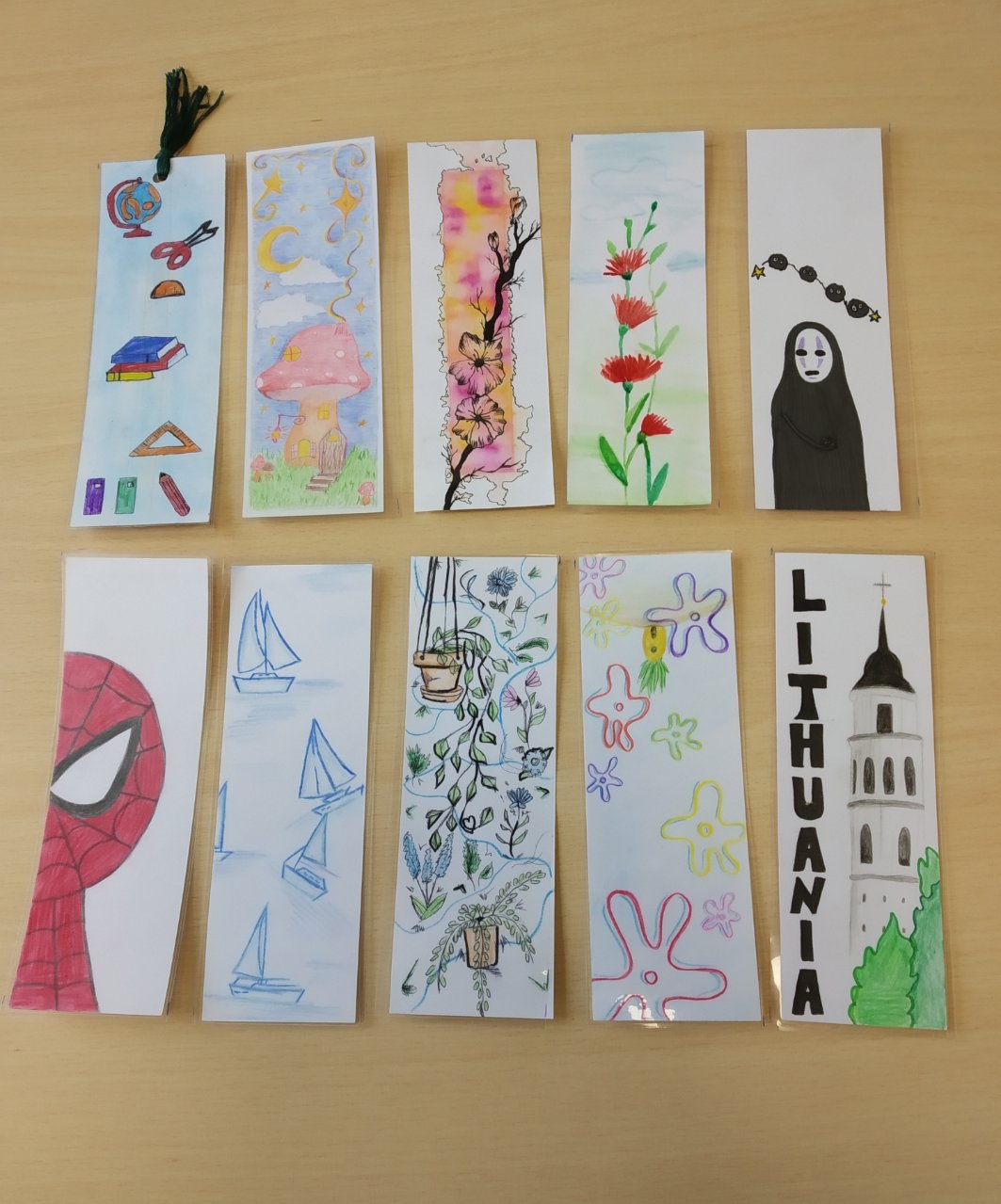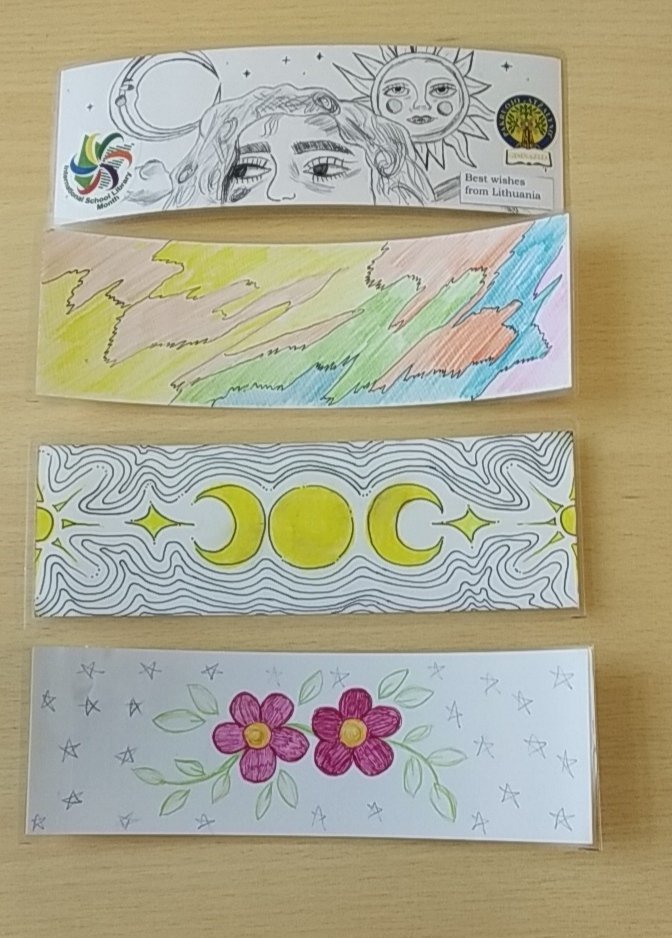 Nuostabaus grožio knygų skirtukai, kruopščiai sukurti talentingų mūsų gimnazijos mokinių, išsiųsti nudžiuginti JAV Hilltop High School (Čula Vista, Kalifornijoje) vidurinės mokyklos ir Malaizijos La Salle Sentul School (Kvala Lumpūro) valstybinės mokyklos mokinių.