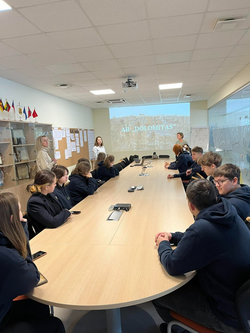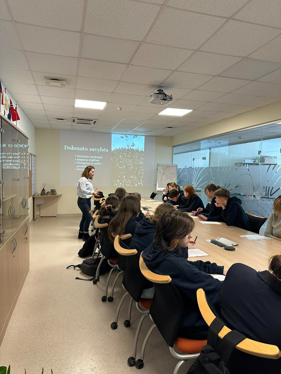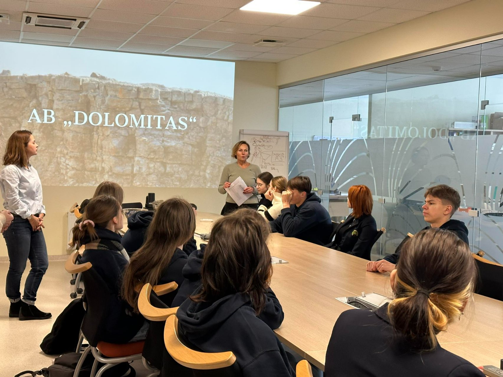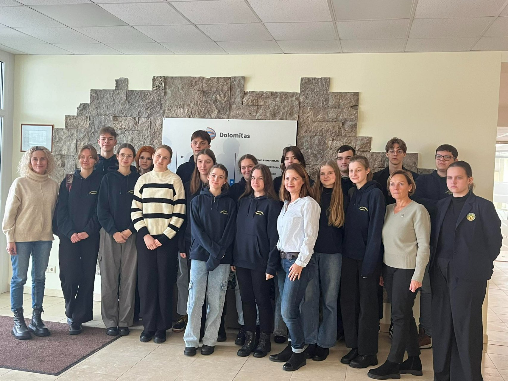 Žiemišką gruodžio 5-ąją Pakruojo „Atžalyno“ gimnazijos II c klasės mokiniai kartu su geografijos ir biologijos mokytojomis vyko pas „Tūkstantmečio mokyklos I“ projekto partnerį AB „Dolomitas“. Gimnazistus pasitiko įmonės aplinkos inžinierė-vadovybės atstovė kokybei Rima Gudienė. Ji integruotos pamokos pradžioje papasakojo apie dolomitmilčius – vieną iš įmonės gaminamų produktų. Vėliau Rima Gudienė pateikė daug informacijos apie išgaunamą dolomitą, jo panaudojimo būdus, taip pat pristatė aukščiausios kokybės gaminius, aptarė atsakingą įmonės požiūrį, saugant aplinką. Per pamoką buvo pateikta dolomito pavyzdžių, kuriuos mokiniai noriai tyrinėjo. Gimnazistai įdėmiai klausėsi AB „Dolomitas“ atstovės pasakojimo, uždavė jai klausimų, o integruotos pamokos pabaigoje turėjo apibendrinti žinias ir atlikti užduotis.