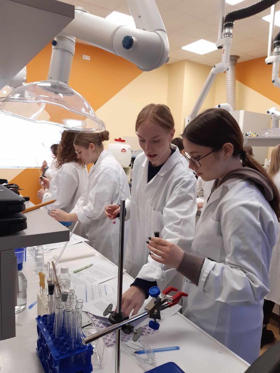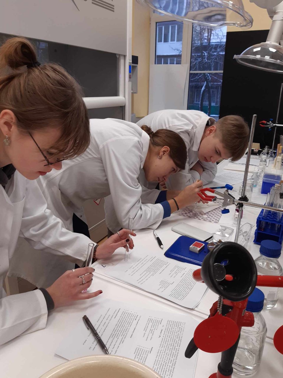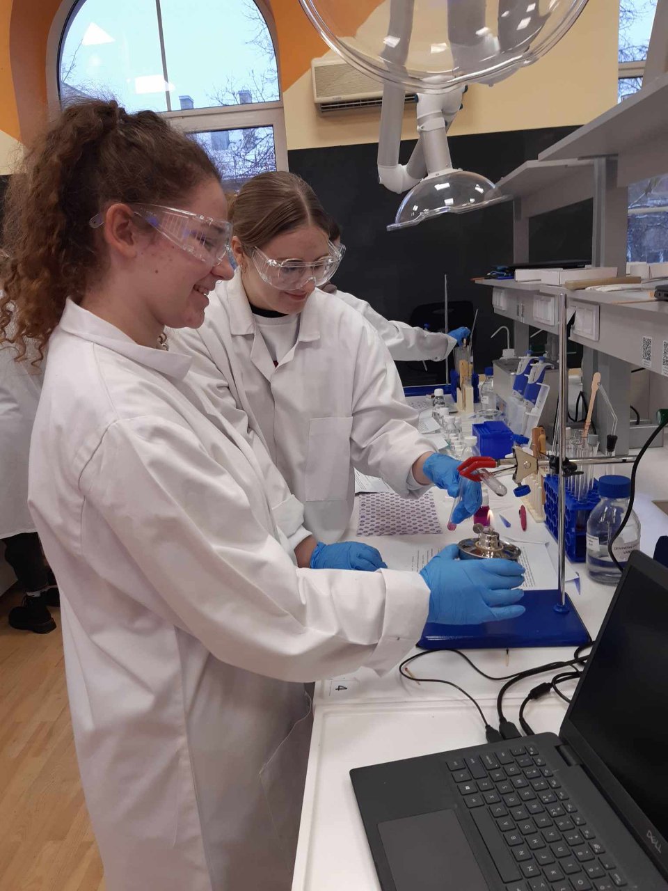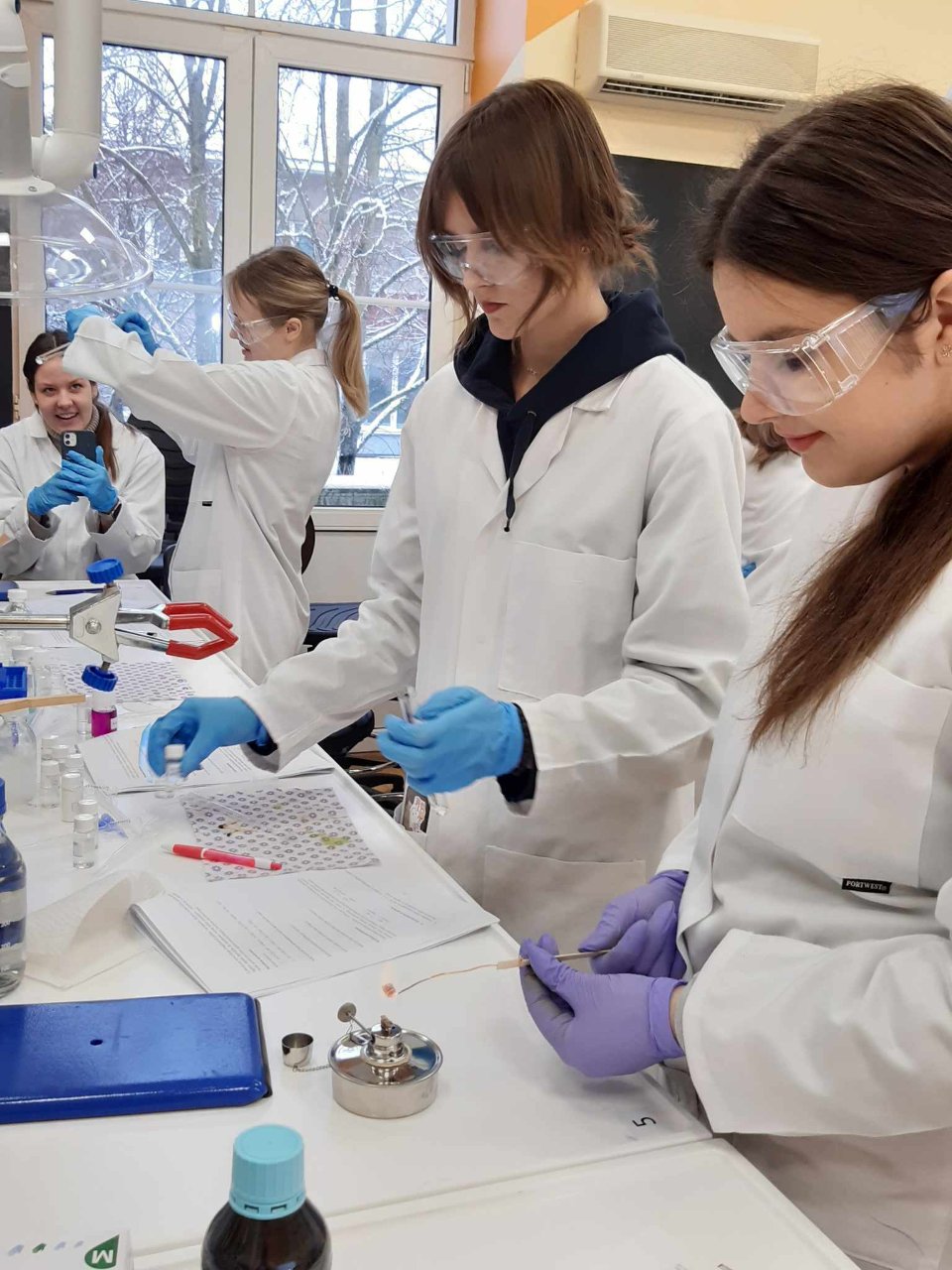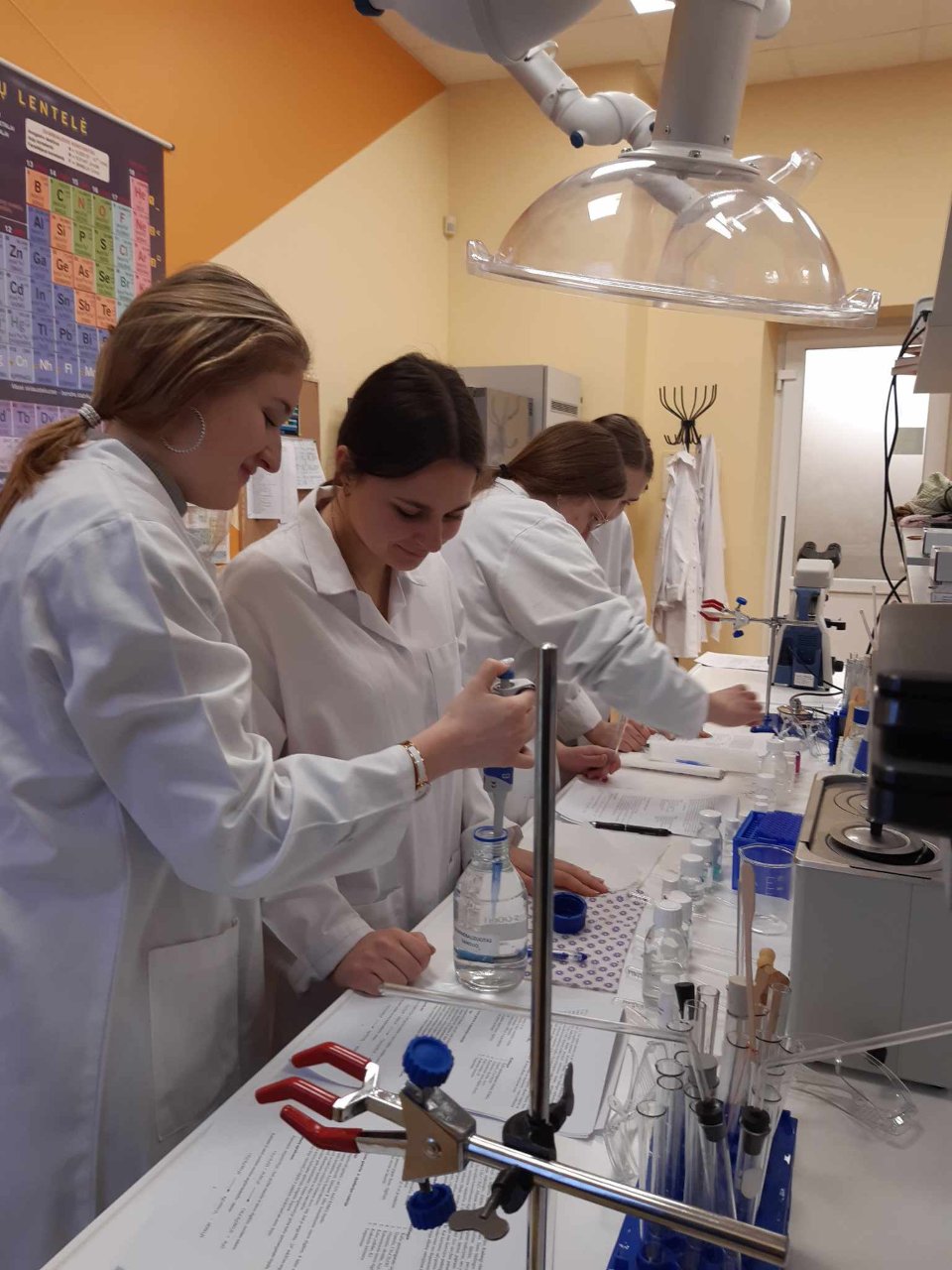 Kol gimnazijoje po truputį įrengiama nauja gamtos mokslų laboratorija, trečiokai noriai chemijos mokslo pasaulio tyrinėti vyksta į VU Šiaulių STEAM centro laboratoriją. Centro metodininkė dr. Ilona Kerienė mūsų gimnazistams buvo paruošusi 3 valandų trukmės organinės chemijos praktikos darbą. Sintetinome eteną iš etanolio, apelsino žievelėmis ir ananasais kvepiančius esterius. Be to, atlikome alkanų, alkenų, alkoholių ir aldehidų kokybines reakcijas, taip pat sužinojome apie mūsų aplinkoje randamus terpenus. Per pamokas darbą tęsime: aptarsime atliktų eksperimentų rezultatus, darysime išvadas.