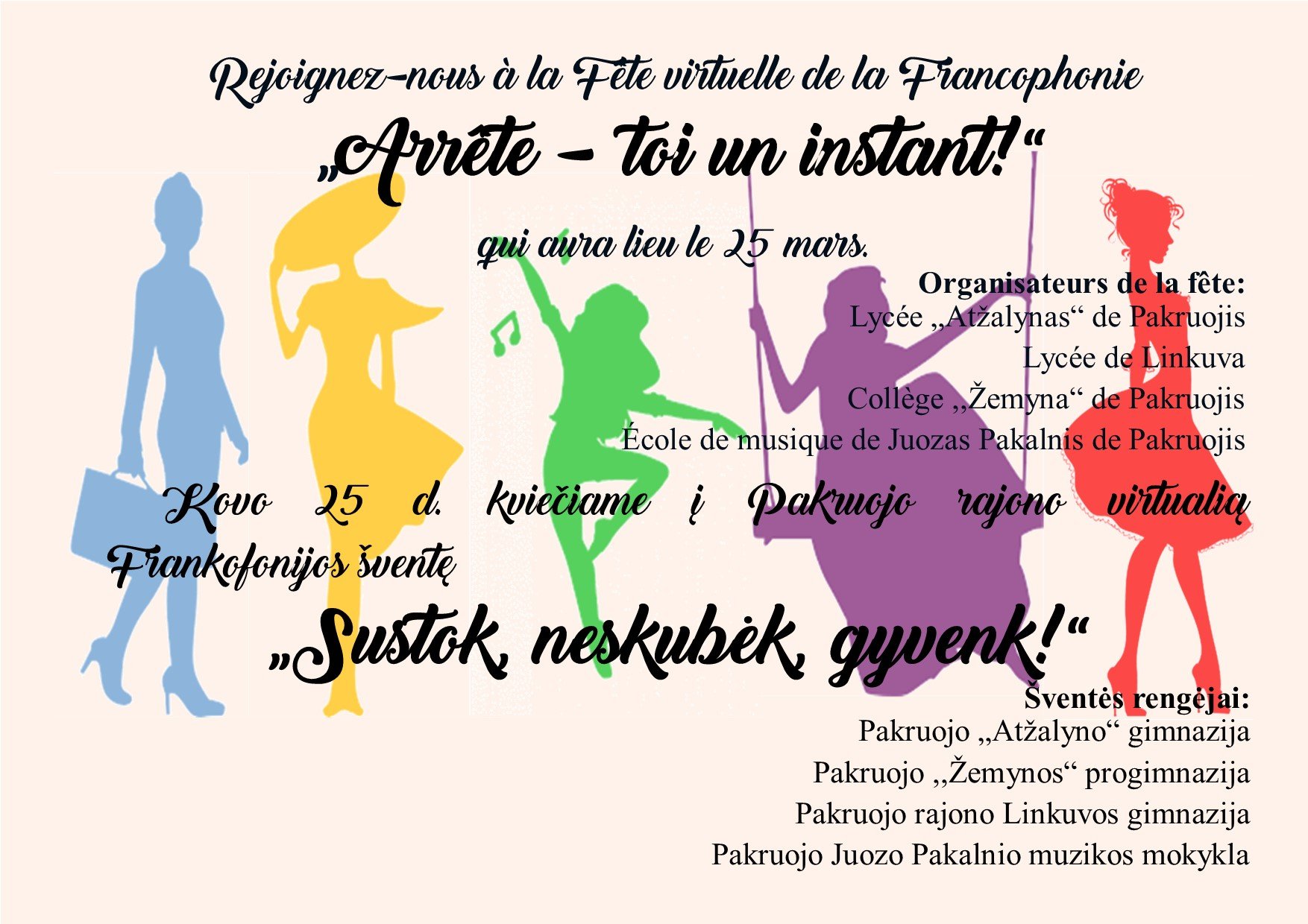 Bonjour! Kovo 25 dieną Frankofoniją švęskime kartu! Maloniai kviečiame į virtualią Frankofonijos šventę „Arrête-toi un instant!“ („Sustok, neskubėk, gyvenk!“).