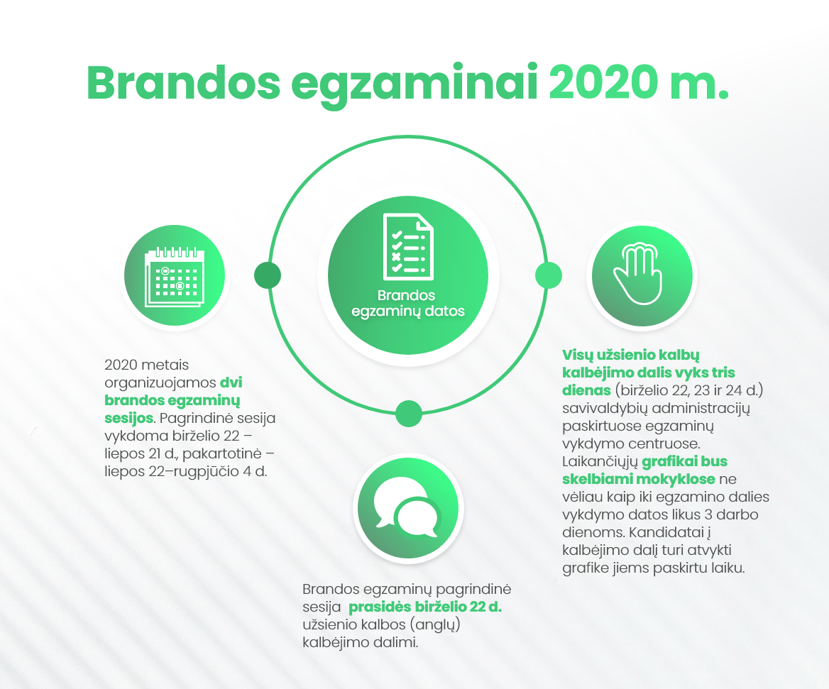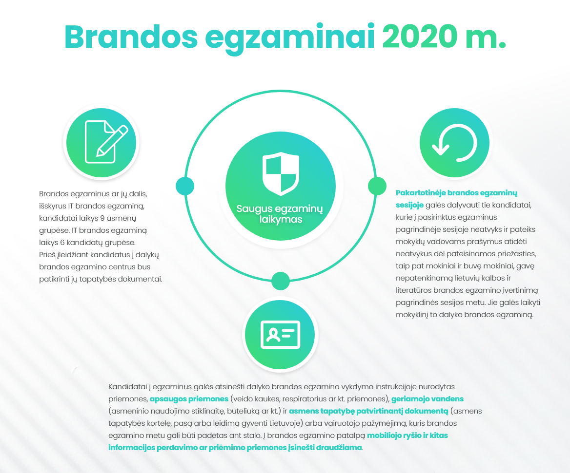 Artėjant valstybinių brandos egzaminų sesijai dalijamės pagrindine informacija abiturientams, kaip vyks egzaminų sesija ir kokių pagrindinių saugumo reikalavimų bus laikomasi.