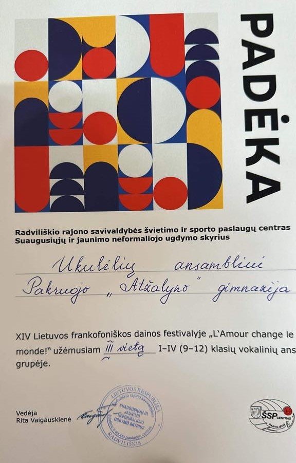 Taip jau sutapo, kad per vieną dieną buvo lemta dalyvauti dviejose veiklose skirtingose vietose. Rytą su Pakruojo „Atžalyno“ ir Linkuvos gimnazijų, kuriose dirbu, ansambliais vykome į Šeduvos gimnaziją, kur dalyvavome respublikiniame Frankofonijos festivalyje-konkurse „L’anour change Le monde“. Šventėje dalyvavo net 24 kolektyvai ir solistai iš įvairiausių Lietuvos miestų: Vilniaus, Kauno, Šiaulių, Klaipėdos, Radviliškio, Panevėžio, Ukmergės. Abu mano kolektyvai tikrai labai stengėsi, jų pasirodymai džiugino ir buvo šiltai priimti. Taip jau nutiko, kad šį kartą skubėjome ir negalėjome laukti rezultatų. Džiugi naujiena pasiekė jau pakeliui važiuojant į Rygos operos ir baleto teatrą (bilietai buvo įsigyti prieš 5 mėnesius), kad Pakruojo „Atžalyno“ gimnazijos ukulelių ansamblis gavo III vietos diplomą.
