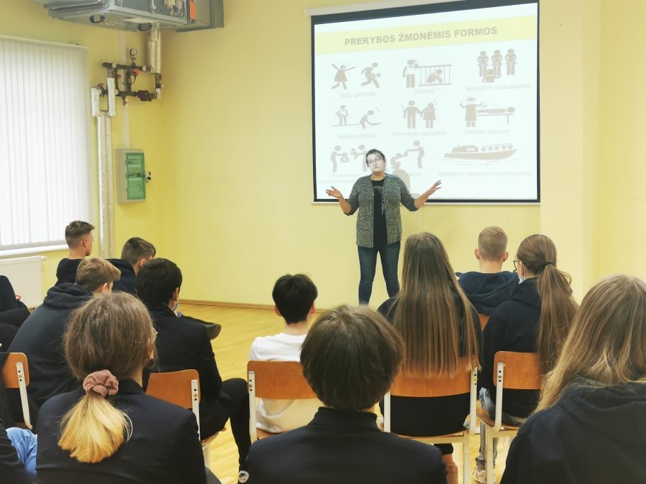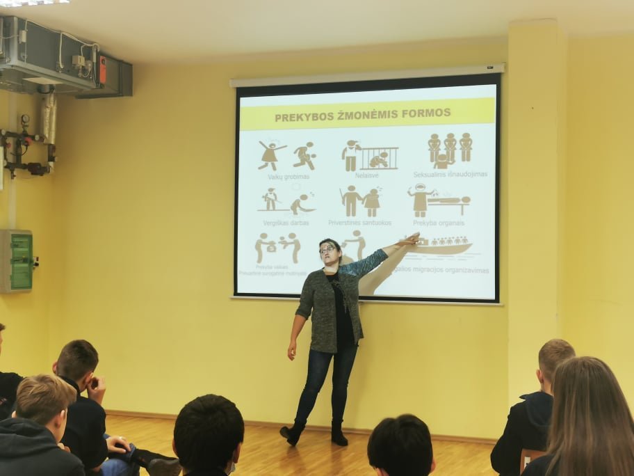 Spalio 16-ąją „Atžalyno“ gimnazijoje“ vyko diskusija su pirmokais gimnazistais apie prekybos žmonėmis reiškinį. Socialinė pedagogė Roma Bartkevičiūtė supažindino su skirtingomis prekybos žmonėmis formomis bei paaiškino, kaip nepakliūti į prekeivių pinkles. Po diskusijos mokiniai žiūrėjo filmą „Sekso kaina“, atidžiai klausėsi merginų pasakojamų istorijų. Gimnazistai išgirdo, kaip jos apgaulės būdu buvo išvežtos į kitą šalį ir prievarta parduotos į prostitucijos pasaulį, kur patyrė kraupių išgyvenimų, buvo pažemintos, nuvertintos kaip asmenybės. Mokiniams šis filmas paliko gilų įspūdį ir sukėlė begalę emocijų. Pabaigoje organizuotas aptarimas, raštu atsakyta į pateiktus anketos klausimus.