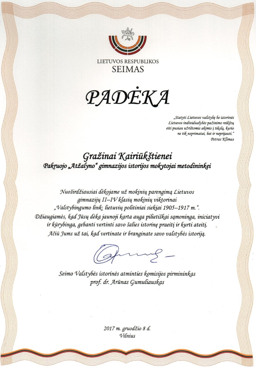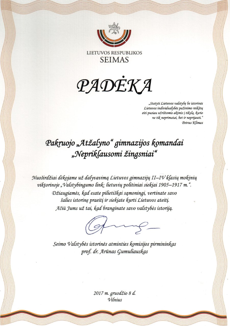 Mūsų gimnazijai atstovavo IVb klasės gimnazistai Dovydas Levinskas, Mindaugas Jareckas, Deividas Zaleskis ir IIIc klasės mokinės Agnė Mykolaitytė bei Greta Malinauskaitė. Mokiniai nagrinėjo šaltinius, sprendė testinius uždavinius, ieškojo užuominų iliustracijose ir demonstravo savo iškalbingumą atlikdami kūrybinę užduotį. Gimnazistų nuomone, jie varžydamiesi su kitų mokyklų komandomis įgavo patirties, pagilino žinias ir prisiminė svarbius istorinius įvykius. Mokiniai džiaugiasi, kad dalyvaudami šioje viktorinoje paliko „Atžalyno“ gimnazijos žymę Lietuvos istorijoje, nes pateko į geriausiai pasirodžiusių komandų dešimtuką.
