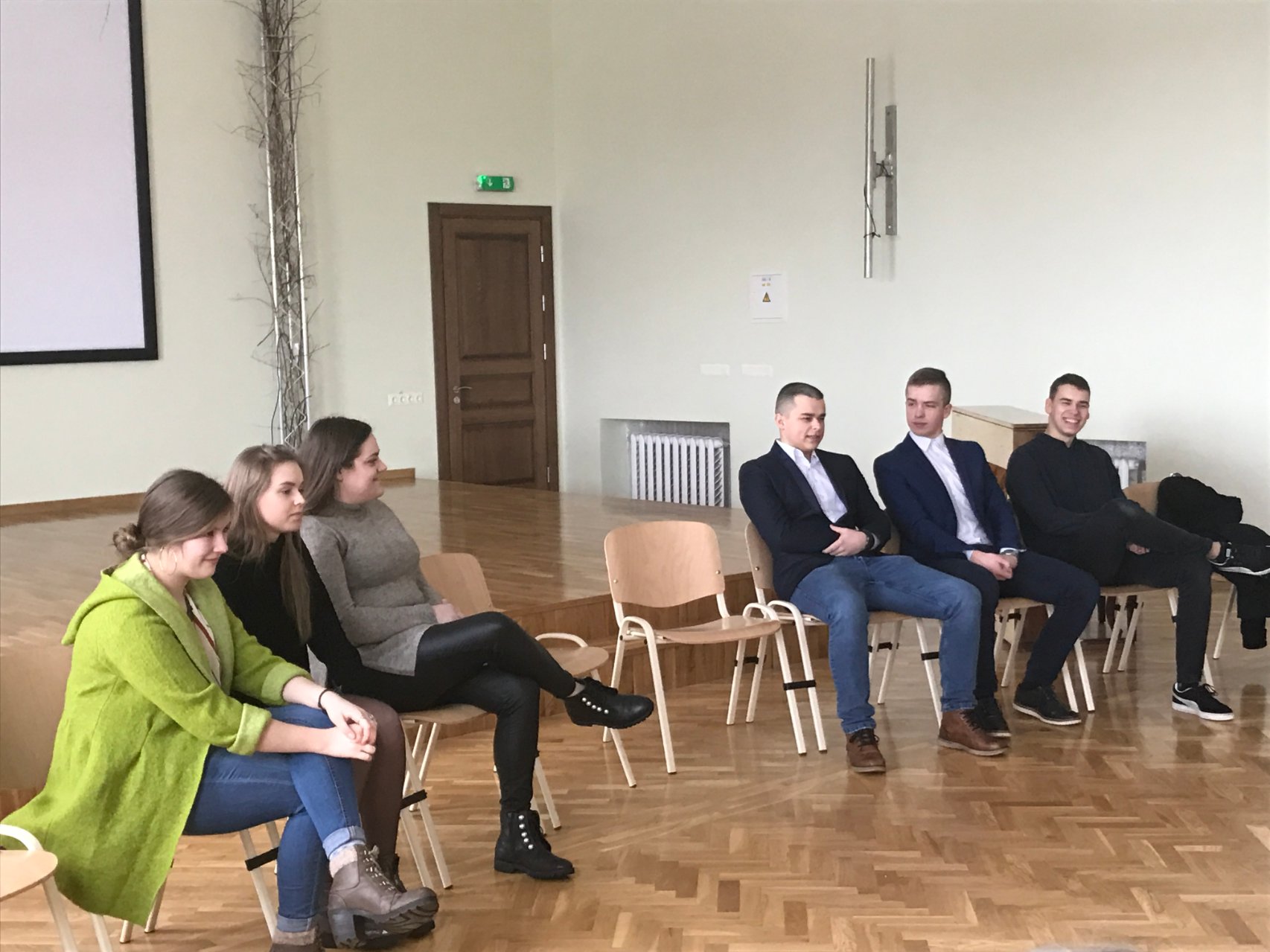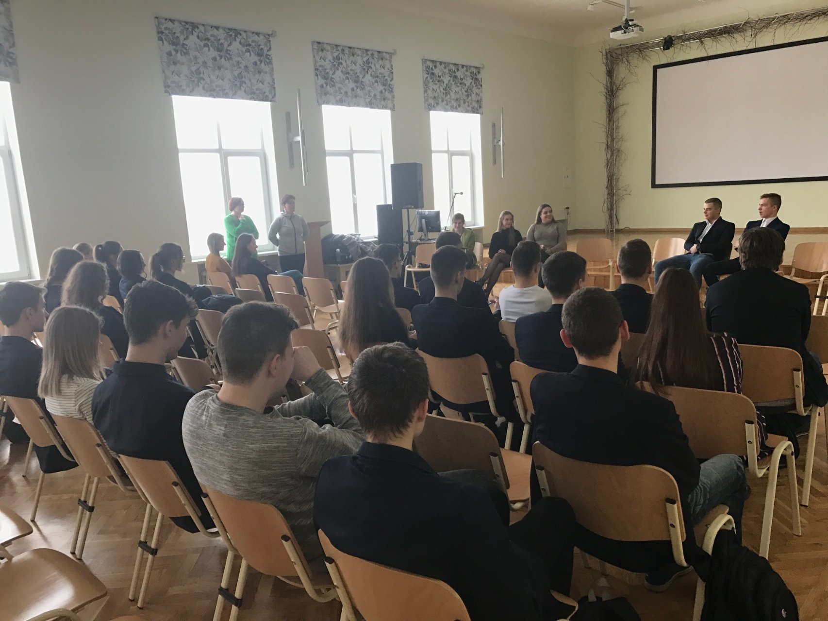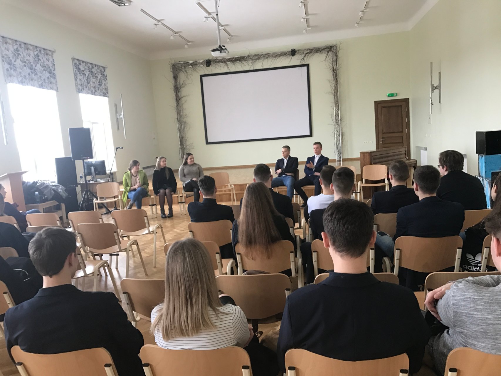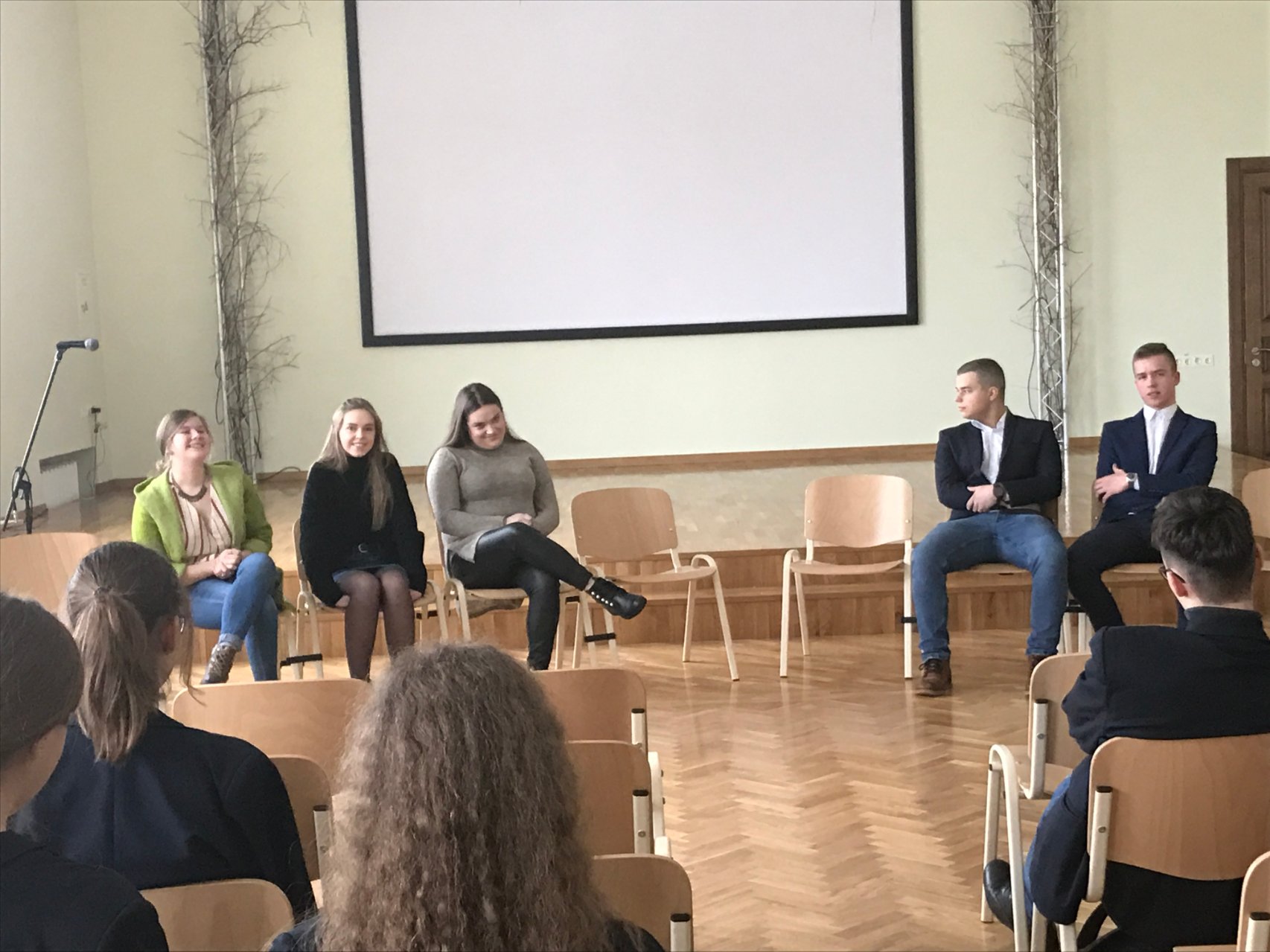 Vasario 1-osios popietę buvo džiugu gimnazijoje sulaukti buvusių mokinių. Konferencijų ir posėdžių salėje mūsų ketvirtokai galėjo išgirsti Vytautės Sabeckytės, Elinos Ridikaitės ir Otilijos Semaškaitės geranoriškų patarimų, smagiai pasišnekučiuoti su Mindaugu Jarecku, Luku Svirpliu, Deividu Zaleskiu apie studijų džiaugsmus ir rūpesčius, mokyklos bei universiteto skirtumus. Abiturientams buvo smalsu, ar būtina lankyti visas paskaitas, ką valgo studentai, kokios gyvenimo sąlygos bendrabučiuose...
