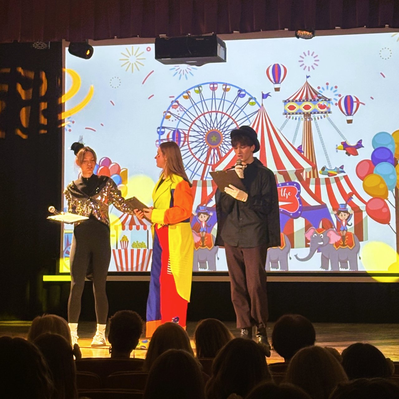 Šventės vedėjai – klounas, akrobatė ir magas – pradėjo renginį nuotaikingais pasirodymais. Klounas pasveikino visus susirinkusius, o magas priminė, kad iki mokyklos baigimo liko tik 100 dienų, per kurias dar galima juoktis, kurti prisiminimus ir mėgautis paskutinėmis mokslo metų akimirkomis.