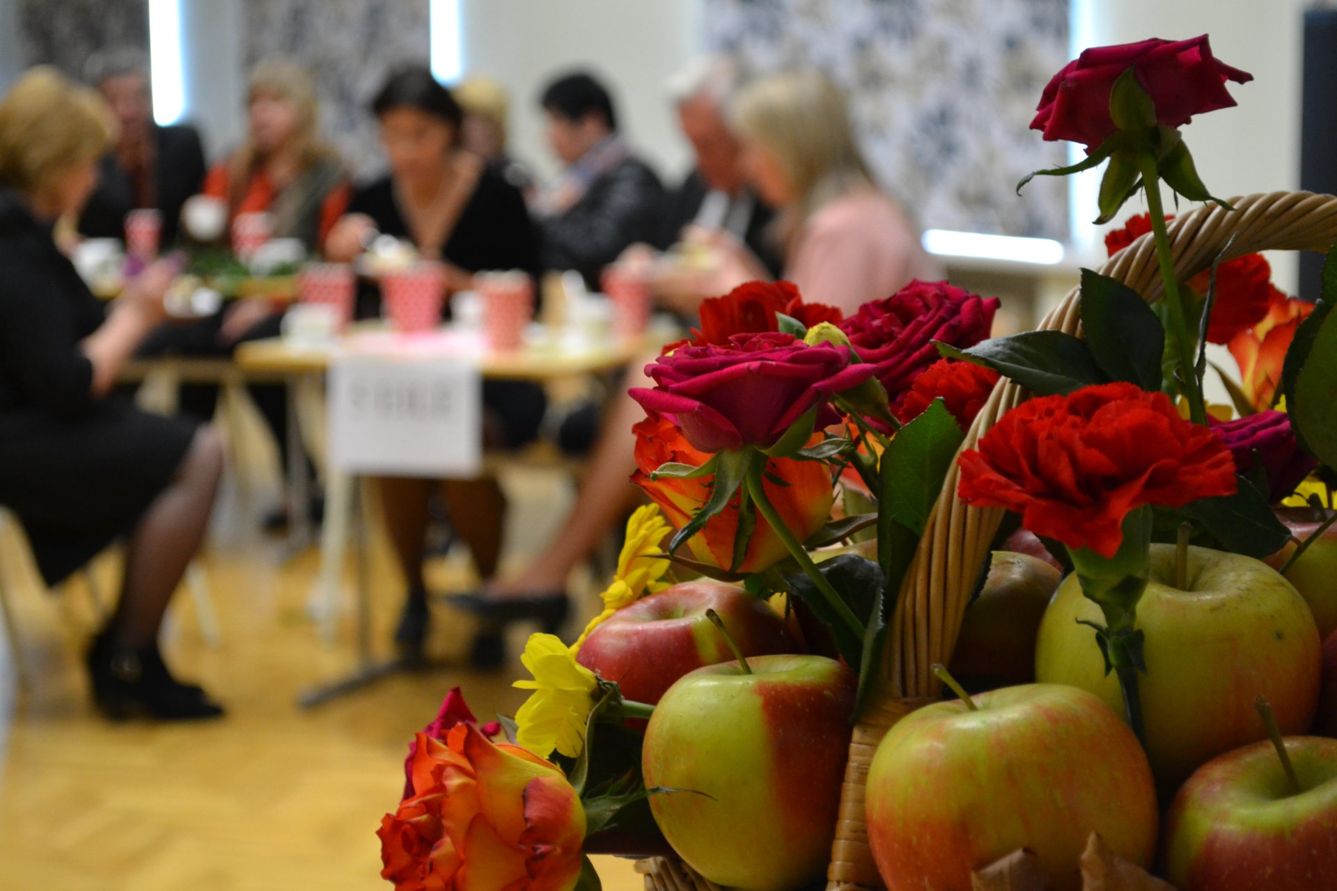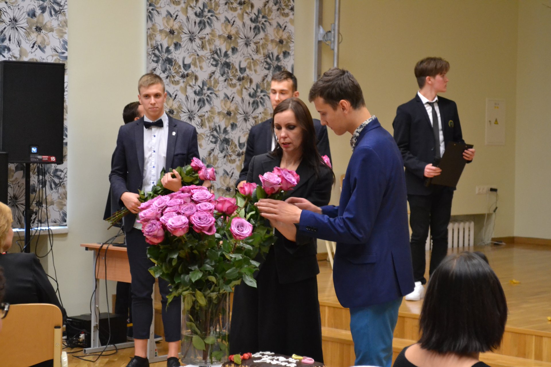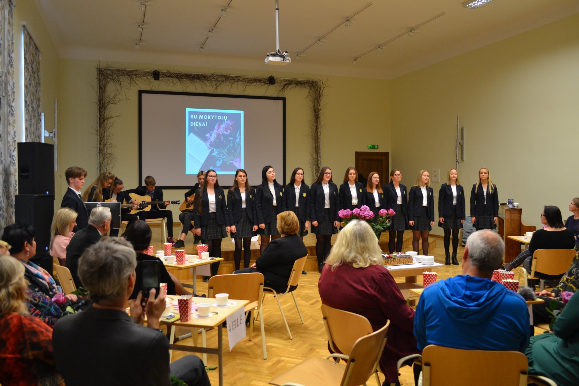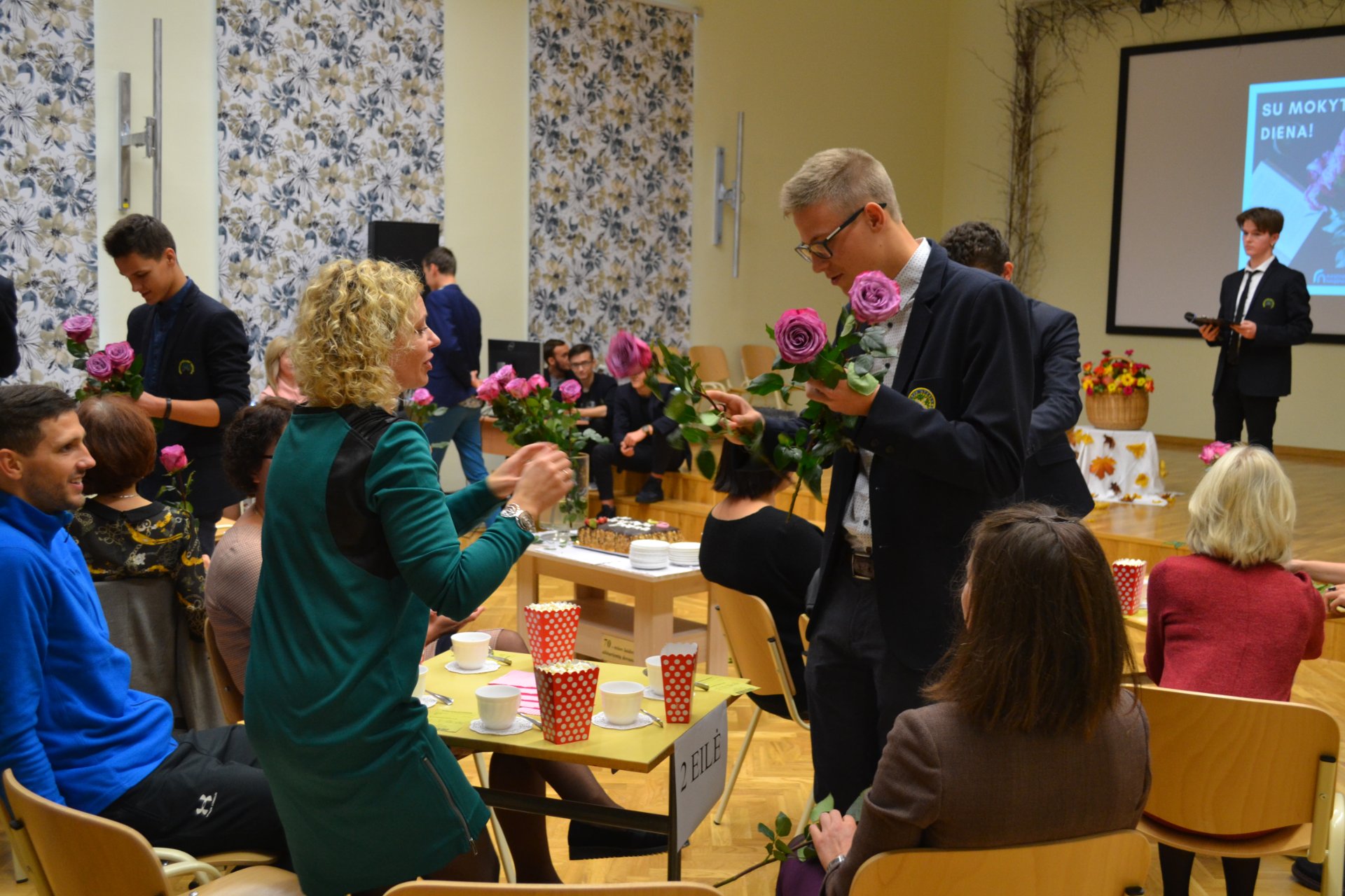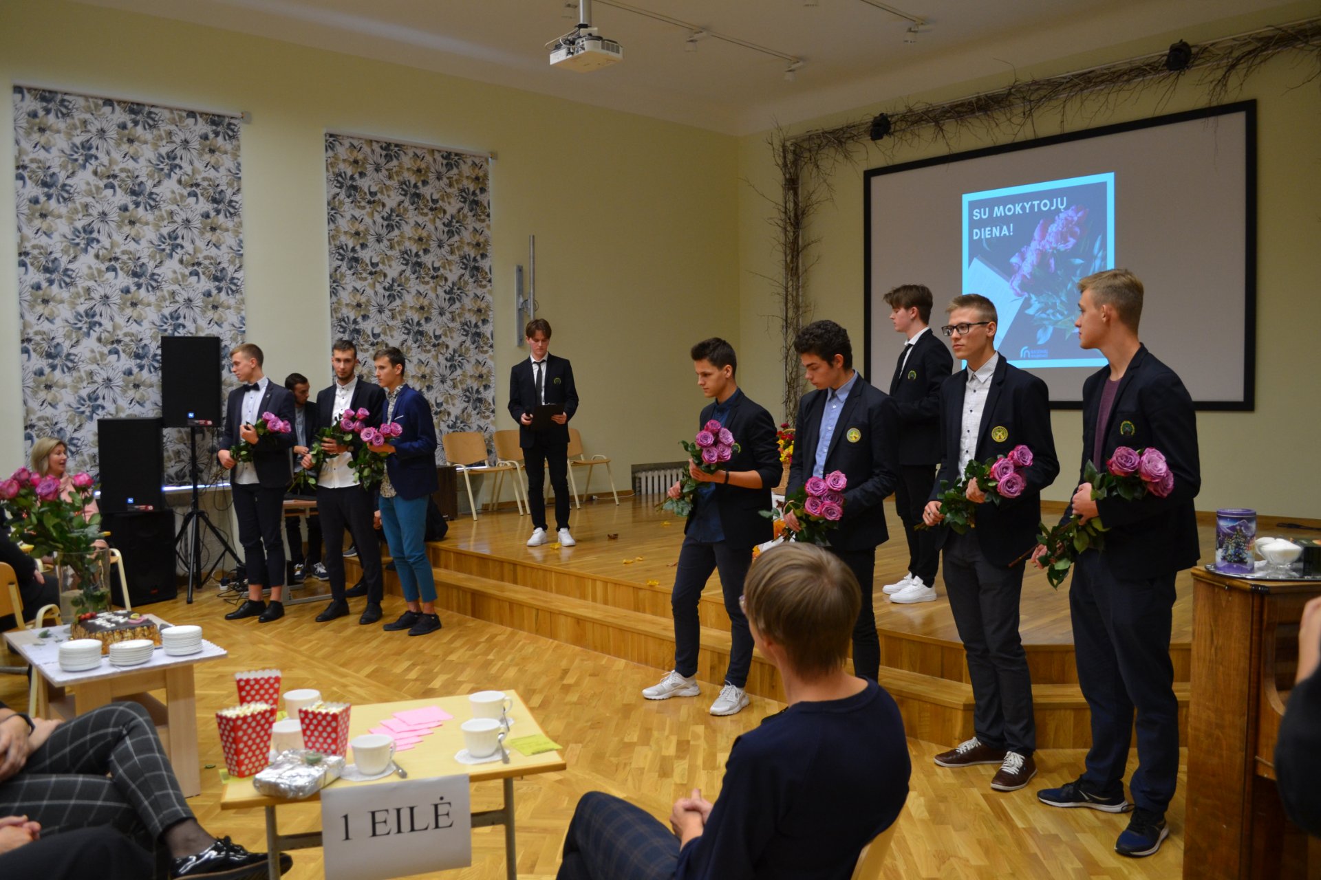 Po 4 pamokų visi pedagogai skubėjo į posėdžių ir konferencijų salę. Išsirinkę mėgstamų kukurūzų spragėsių, jie buvo maloniai palydėti prie biliete nurodytos vietos. Filmą kūrė, galima sakyti, visi gimnazistai, nes vieni dėkojo mokytojams, kiti deklamavo eilėraščius, treti rado įvairių minčių, kurių pirmosios raidės atitiko žodžio MOKYTOJAS raides, buvo ir tokių, kurie dainavo, vaidino. Originalūs vaikų pasveikinimai pedagogus nudžiugino, galbūt net ir nustebino. Po kino filmo peržiūros merginų ansamblis visiems dovanojo skambią dainą. Sveikinimo žodžius tarė abiturientai Dinas ir Titas Majauskai, mokytojų rankose pražydo kvapnūs rožių žiedai, kuriuos įteikė kiti ketvirtokai vaikinai. Vėliau ugdytojai galėjo prie kavos ir arbatos pasišnekučiuoti bei pasivaišinti tortu. Labai tikimės, kad mokytojai džiaugsmingai prisimins šią dieną, į atmintį įsirėš išgyventos emocijos...