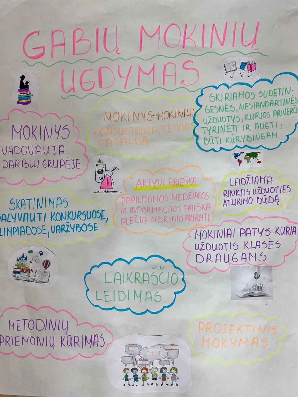 Gruodžio 7 d. popietę įvyko mokytojų tarybos posėdis tema „Kolegialaus bendradarbiavimo patirtys (darbo su aukštesnių gebėjimų mokiniais pobūdis, problemos, rezultatai ir pasiekimai konkursuose bei olimpiadose“). Direktoriaus pavaduotoja ugdymui Rasa Bertulienė pateikė skaičių mokinių, kurių mokymosi vidurkis nuo 8 iki 9,52 ir nuo 9 iki 9,53 (buvo lyginami šių metų rezultatai ir 2021-2022 m. m. metinis įvertinimas). Be to, aptarė, kuo skiriasi gerai besimokantis mokinys nuo gabaus, kaip juos atpažinti, ugdyti, pristatė, kokia yra paruošta metodinė medžiaga mokytojams. Direktoriaus pavaduotoja ugdymui Rasa Augustinaitienė pateikė skaičius, kiek šiais metais mūsų gimnazistų dalyvavo įvairiuose konkursuose, olimpiadose ir užėmė prizines vietas. Pasidžiaugta III vieta regioniniame meninio skaitymo konkurse, II vieta respublikiniame moksleivių konkurse „Konstituciniu keliu“. Po to metodinės grupės pristatė savo atliktus darbus tema „Kokius metodus taikome ugdydami gabius mokinius?“ Vėliau pavaduotoja Rasa Bertulienė kvietė padiskutuoti, su kokiomis problemomis susiduriame dirbdami su gabiais gimnazistais. „Minčių lietus“ atskleidė temos aktualumą. Direktorė Asta Valuntienė pakvietė numatyti kitą žingsnį, kad būtų galima kryptingai aiškintis gabių mokinių ugdymo klausimus.