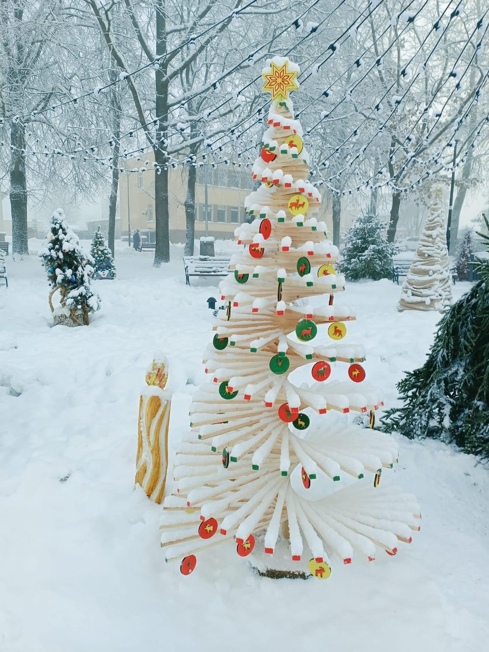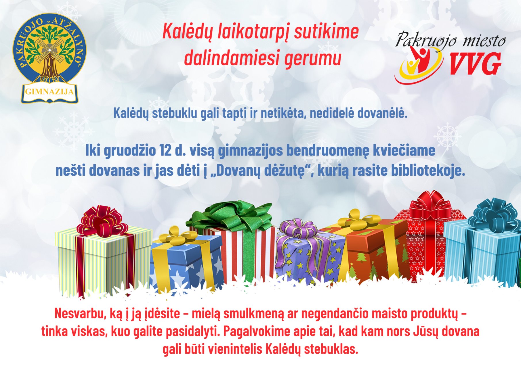Metų sandūra – ypatingas laikas... Laukdama švenčių gimnazijos bendruomenė puošia mokyklos vidaus, lauko erdves, o ir gamta dovanoja daug šviesos, balto džiaugsmo. Nuoširdžiai dėkojame visiems už įdomias idėjas, išradingumą, aktyvumą. Be to, gimnazijos pirmokų ir technologijų mokytojo Egidijaus Impolio kurta stilizuota eglutė puikuojasi Pakruojo miesto Vienybės aikštėje įkurtoje kalėdinių eglučių alėjoje. Kūrinio konstrukcijos autorius I b gimnazistas Ervinas Dominauskas. (Už nuotraukas dėkojame L. Baltrušaitienei ir V. Pėželiui).