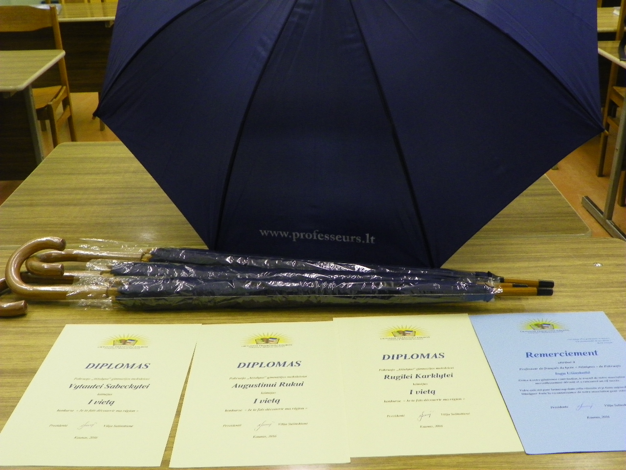Lapkričio mėnesį buvo paskelbti Lietuvos prancūzų kalbos mokytojų ir dėstytojų asociacijos organizuoto respublikinio konkurso „Je fais découvrir ma région“ („Atrandu savo regioną“) rezultatai. Gimnazistų komanda (Vytautė Sabeckytė, Rugilė Karklytė, Augustinas Rukas) savo kūrybinį darbą konkursui pateikė dar praėjusių mokslo metų pabaigoje. Tradiciškai ir labai iškilmingai nugalėtojai apdovanojami kiekvieną rudenį vykstančioje respublikinėje prancūzų kalbos mokytojų ir dėstytojų asociacijos konferencijoje. Taip jau atsitiko, kad šiemet minėto renginio data sutapo su gimnazijos jubiliejaus švente, todėl mūsų mokyklos atstovai nedalyvavo Kaune vykusioje konferencijoje. Nekantraudami laukėme buvusios mūsų gimnazijos mokinės, dabar Kaune gyvenančios Neringos Gudašytės-Menciūnės, kuri, grįždama aplankyti Pakruojyje gyvenančių savo tėvelių, parvežė skėčius ir diplomus – konkurso prizus.