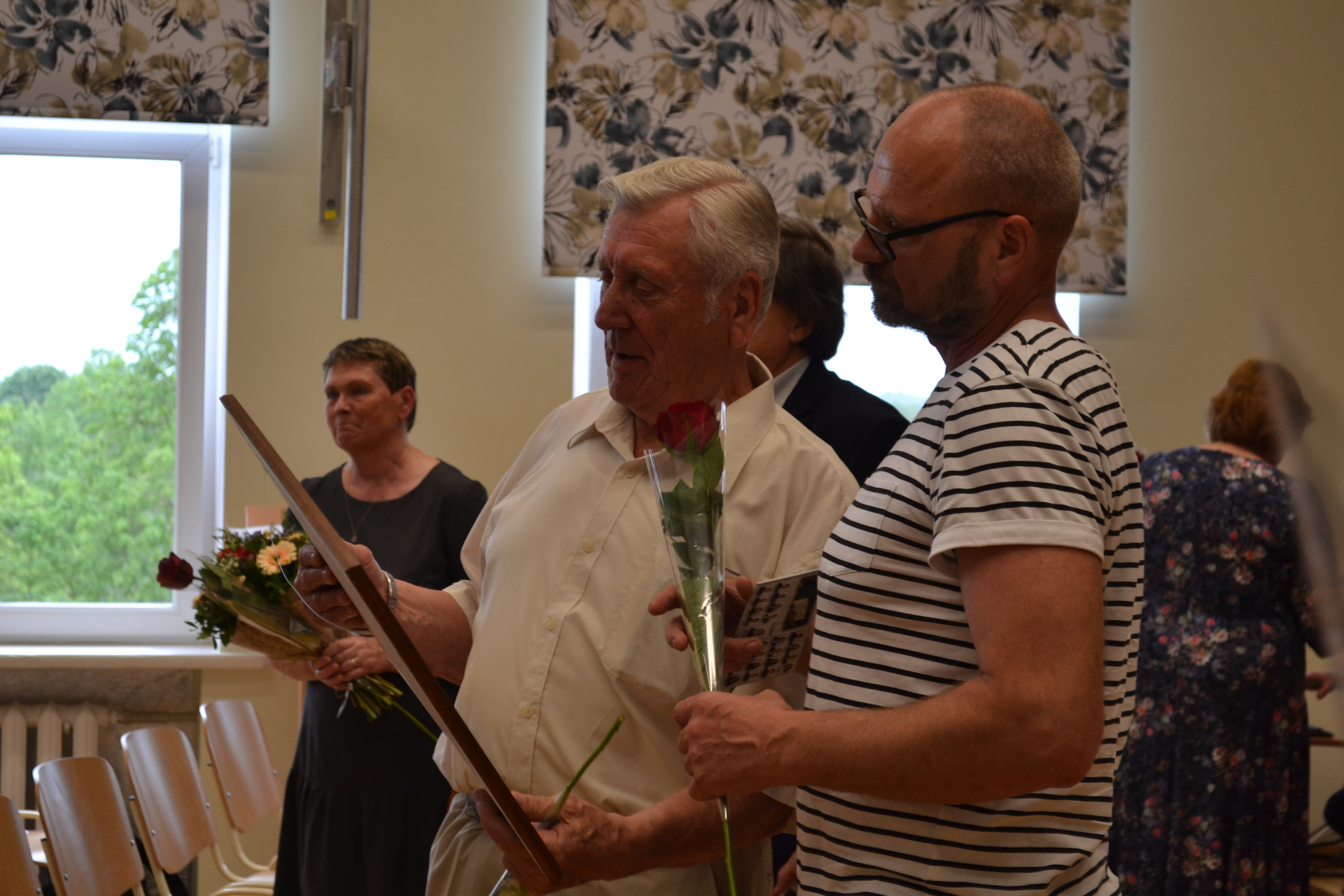 Vėliau trečiokai ketvirtokus ir jų auklėtojas pakvietė į posėdžių ir konferencijų salę, kur vyko jautri Paskutinio skambučio šventė. Renginio vedėjai Kamilė, Erina, Titas ir Dinas pakvietė ketvirtokus apmąstyti nueitą kelią ir dalyvauti netradicinėje pamokoje „Žvilgsnis į save“, kurios tikslas sukurti jų mokyklinės istorijos kompoziciją. Pradžioje kalbėjo Genovaitė Zarakauskienė ir Jolanta Gutauskienė, pirmosios abiturientų mokytojos, kurių būta ir daugiau, deja, atvykti galėjo tik kelios. Jos priminė pirmąją raidę, nedrąsią svajonę, vėl iš naujo tiesė švelnią ranką, kad kelias būtų tiesus, o abiturientai tvirti. Ketvirtokai padėkojo pirmosioms mokytojoms ir įteikė gėlių. Daina visus nudžiugino gimnazijos vokalinis ansamblis. Visus užbūrė mišrus choras, dovanojęs ne vieną kūrinį. Miela ir smagu buvo vėl išvysti buvusį gimnazijos direktorių Kęstutį Razumą, atėjusį pas abiturientus, kuriuos jis priėmė į mokyklą ir sveikino Rugsėjo 1-osios proga, kai jie buvo pirmokai. Šventės vedėjai kvietė ketvirtokus atverti širdis direktoriaus pavaduotojos ugdymui Rasos Bertulienės, laikinai atliekančios direktoriaus funkcijas, žodžiui. Ji priminė pasakėčią apie lapę ir varną ir kvietė išeinant į gyvenimą nepamiršti teksto išminties. Baigusi kalbą direktoriaus pavaduotoja ugdymui Rasa Bertulienė, laikinai atliekanti direktoriaus funkcijas, ir direktoriaus pavaduotoja ugdymui Rasa Augustinaitienė pasidžiaugė abiturientais, kurie aktyviai dalyvavo kultūrinėje, visuomeninėje veikloje, padėkojo olimpiadų prizininkams, įteikė jiems padėkos raštus. Nuoširdų sveikinimo žodį tarė ir direktoriaus pavaduotoja ugdymui R. Augustinaitienė, kvietusi šventės dieną geru ženklu laikyti saulę ir prašiusi nepavėluoti į egzaminus. Jautrus buvo ketvirtokų gimnazistų atsisveikinimo valsas... Vėliau abiturientai buvo kviečiami parodyti namų darbus – visos klasės pasirinko pasidalyti su visais smagiausiomis akimirkomis, patirtomis per ketverius metus. Po to vėl valso sūkury keitėsi ketvirtokų gimnazistų poros. Abiturientus sveikino gimnazijos mokinių prezidentė Gabija Jareckaitė, IIIc klasės gimnazistė. Ketvirtokus drąsino auklėtojos, dėkodamas už kelionę kartu, gerumą, bendrystę ir meilę. Visų širdis virpino Vakarės Vasiliauskaitės, IVa klasės gimnazistės, daina apie skrydį. Abiturientų vardu kalbėjo Austėja Miknevičiūtė, kuri perdavė raktą trečiokams, be to, linkėjo jiems kuo ilgiau džiaugtis laiku, praleistu mokykloje, nes jis taip greitai prabėga. Be to, abiturientai gimnazijai padovanojo suolelį, kuris tiktų sode po obelimis, kad mokiniai galėtų susėdę mokytis, šnekučiuotis. Nuoširdžiai padėkota gimnazijos administracijai, mokytojams, kad nuolat buvo šalia ir patarė, mylėjo, padėjo, kantriai lydėjo akimis ir širdimi... Abiturientų klasėms padovanotos per visą renginį kurtos kompozicijos, simbolizuojančios ketvirtokų nueitą mokyklinį kelią. Širdingai ačiū abiturientai tarė choregrafijos vadovei Audronei Geležinytei už triūsą ruošiant šokėjėlius, muzikos mokytojoms Ingridai Tuomienei, Vaivai Klupšienei, koncertmeisterei Rūtai Venslovienei už nuoširdų darbą su dainorėliais. Abiturientai džiaugėsi jaukia švente ir dėkojo trečiokams bei jų auklėtojoms už jaukią šventę.