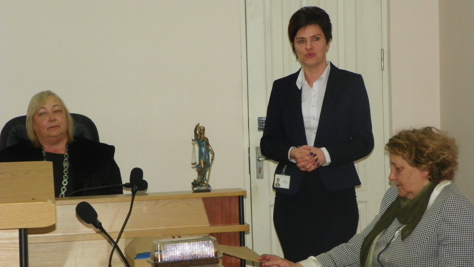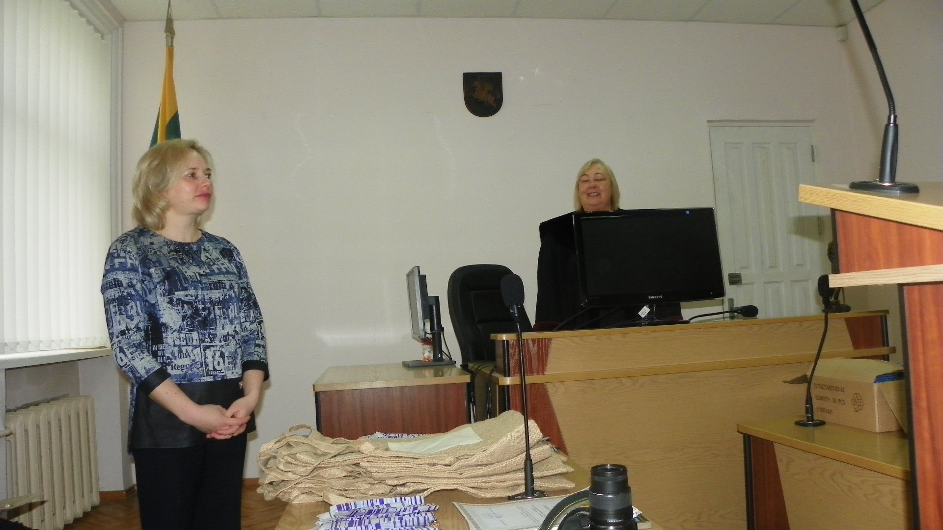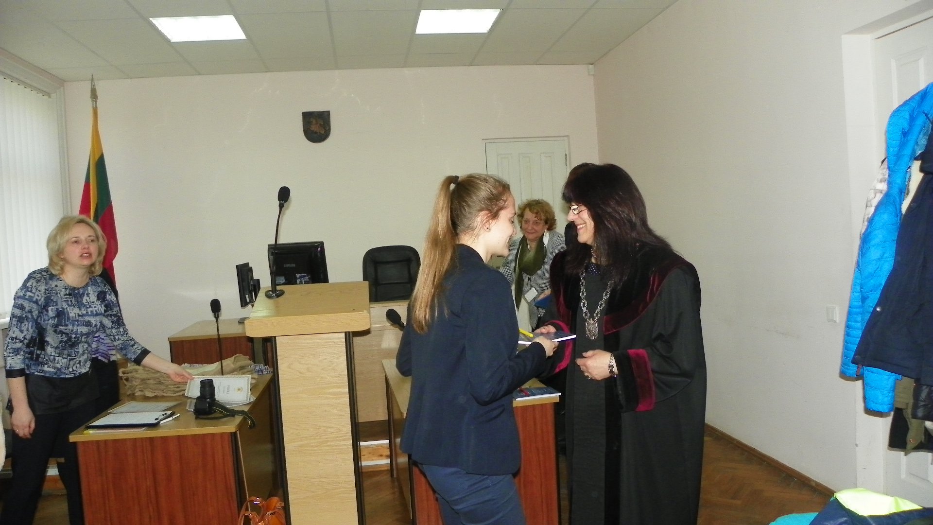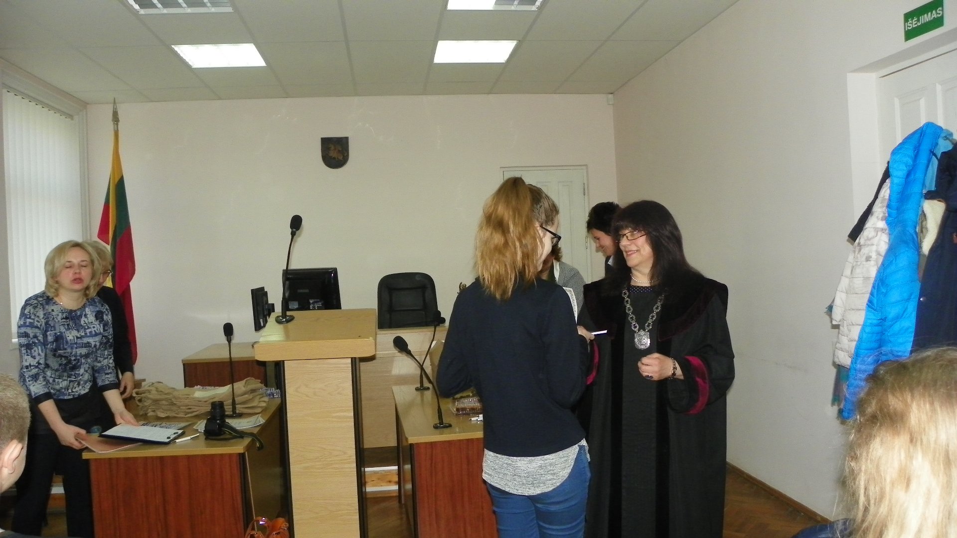 Laikinai einanti teismo pirmininkės pareigas Rima Razumienė pasidalijo mintimis, kodėl pasirinko teisėjos mantiją. Pirmininkė paantrino, kad čia kiekvienas gali būti kviečiamas teisingai liudyti. Tai gali daryti ne tik pilnamečiai, kurie prisiekia liudyti teisingai, bet ir mažamečiai, kurių apklausa – pokalbis vyksta drauge su psichologu specialiame apklausos kabinete, turinčiame reikiamą įrangą. Mokiniai turėjo galimybę stebėti, kaip vykdoma inscenizuota savanorio abituriento apklausa.