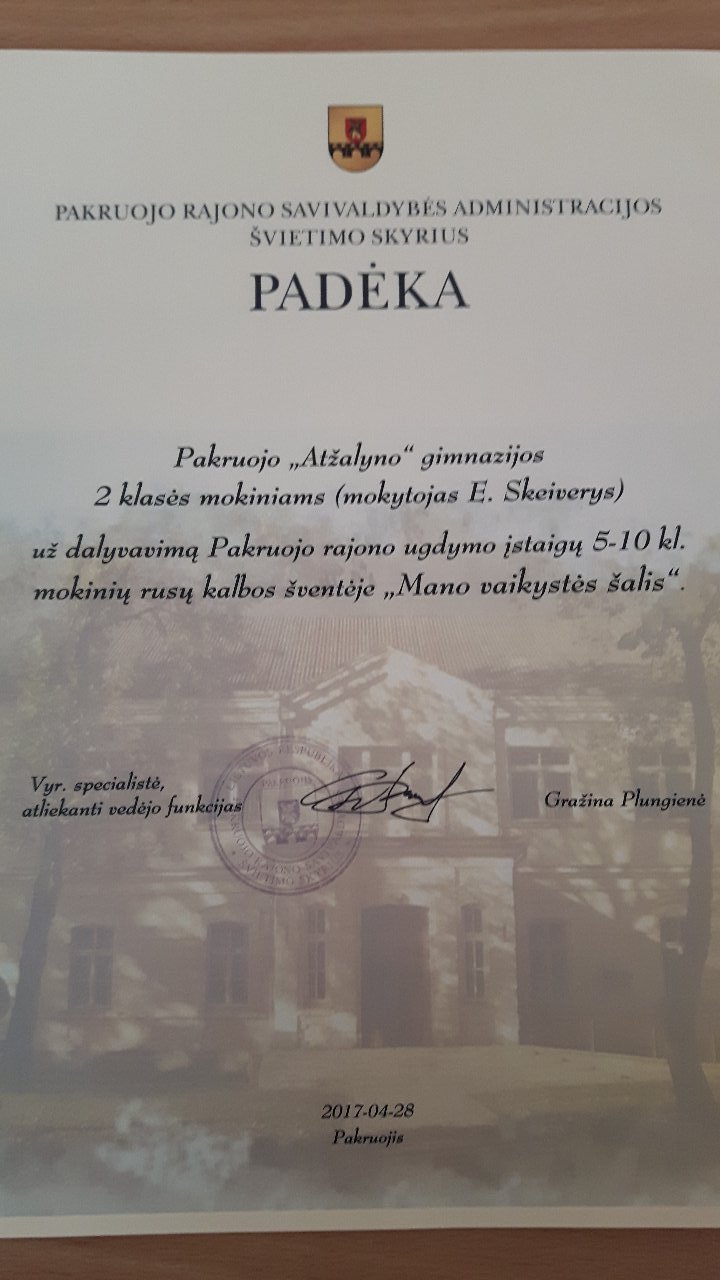 2017 m. balandžio 28 d. Pakruojo „Atžalyno“ gimnazistai vyko į Klovainius, kur dalyvavo rajoninėje rusų kalbos šventėje „Mano vaikystės šalis“. Mūsų antrokės paruošė rusų kalba kompoziciją, skirtą artėjančiai Motinos dienai, į kurią įpynė ir dainą „Mama“. Pasivaišinę arbata, pabendravę su šeimininkais ir kitais šventės dalyviais geros nuotaikos grįžome namo.