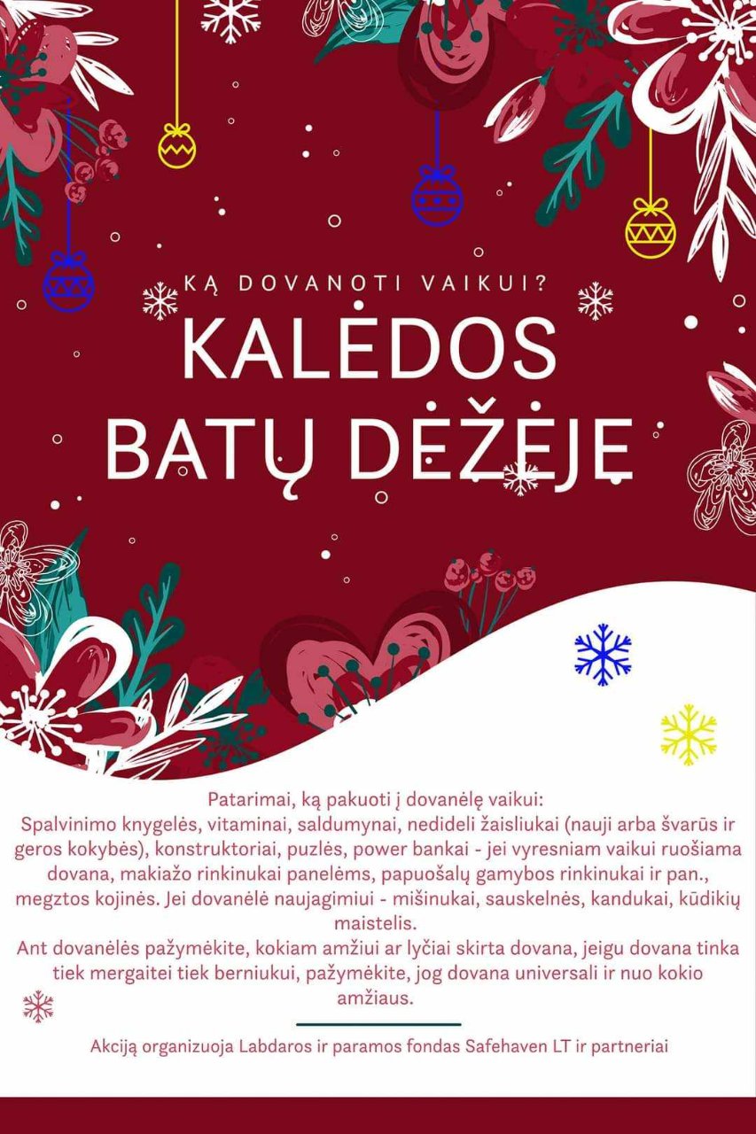 Dovanėlę, dailiai supakuotą batų dėžutėje, iki gruodžio 20 d. nuneškime į 413 kabinetą anglų kalbos mokytojai Rasai Stravinskienei, kuri ir koordinuos šį procesą.