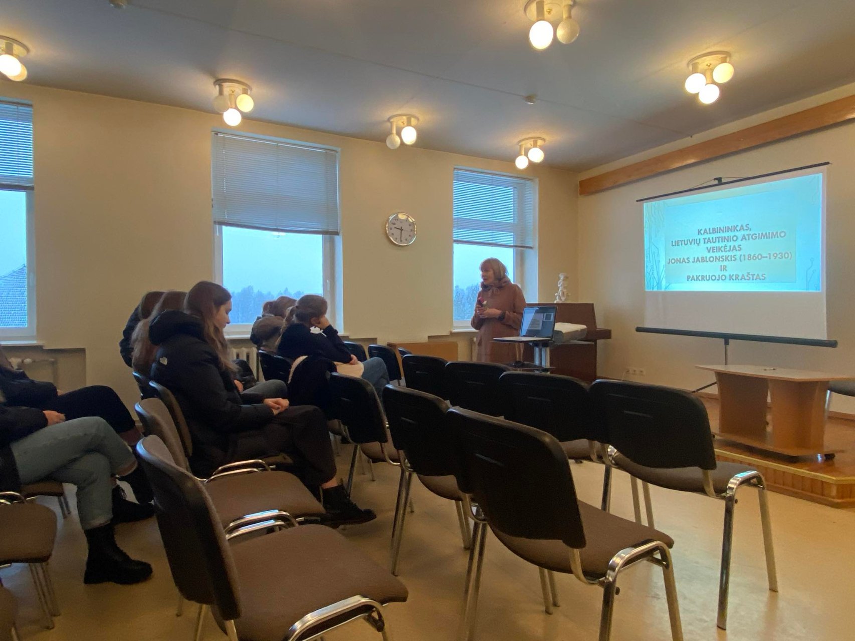 Džiugina bendrystė su Pakruojo Juozo Paukštelio viešąja biblioteka. Suderinę laiką su vyresniąja bibliotekininke kraštotyrai Gene Juodyte lapkričio 23 d. per gimtosios kalbos pamoką kartu su lietuvių kalbos ir literatūros mokytoja Roma Juknevičiene išsiruošėme į Pakruojo Juozo Paukštelio viešąją biblioteką. Bibliotekininkė mus supažindino su kalbininko, lietuvių tautinio atgimimo veikėjo, lietuvių bendrinės kalbos ugdytojo, normintojo Jono Jablonskio asmenybe, papasakojo apie jo ryšius su Pakruojo kraštu ir žmonėmis. Apsilankymas bibliotekoje buvo naudingas, nes sužinojome, kodėl Jonas Jablonskis vadinamas bendrinės kalbos tėvu, kuo svarbi jo 1901 m. parašyta gramatika, be to, buvo įdomu išgirsti, kas kalbininką sieja su Žeimeliu ir t.t. Beje, nustebome, kad Pakruojyje yra vienintelis Europoje paminklas knygos ženklui, tad išskubėjome prie jo.