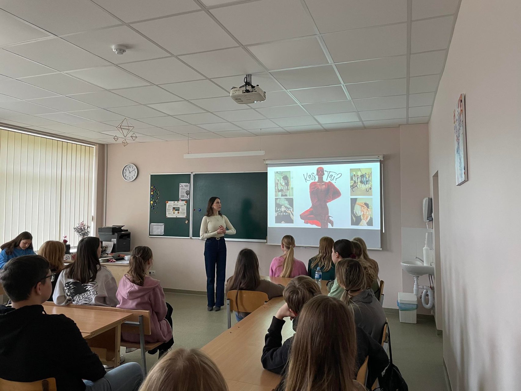 MIGLĖ VADAPALAITĖ, įvaizdžio dizainerė, papasakojo, kokie yra įvaizdžio dizaino pagrindai, aptarė pagrindines mados šakas: aprangos dizainą, visažistiką, plaukų stilistiką. Gimnazistai sužinojo, kad ši specialybė glaudžiai susijusi su grafiniu dizainu. O baigus studijas galima įsidarbinti televizijoje, kine, kurti reklamas ar tiesiog individualiai konsultuoti klientus.
