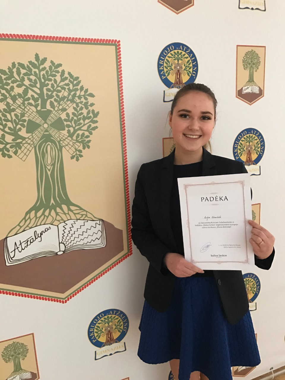 Jau ketvirtus metus iš eilės rašytoja Kristina Sabaliauskaitė kartu su leidykla „Baltos lankos“ organizuoja trumpojo rašinio konkursą. Šių metų tema „Mano demonai“ pakvietė griebti neatsiejamą žmogiškosios brandos palydovą – vidinį demoną – už ragų ir jį aprašyti. Paliesta, išprovokuota, skaudi tema. Lietuvių kalbos ir literatūros mokytojos Gražinos Spudienės paskatinta, šia tema ryžosi pasvarstyti IVc klasės gimnazistė Austėja Miknevičūtė. Ji apdovanota padėkos raštu.