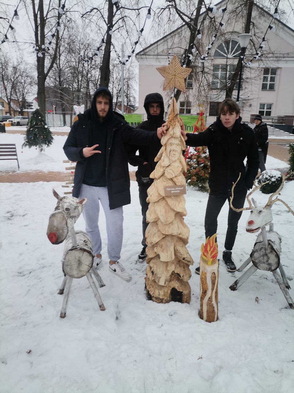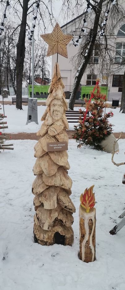 Jei pernai mūsų eglutė buvo medinė, surinkta iš detalių, tai šiemet priimtas kiek kitoks sprendimas – nutarta ją išskobti iš vientiso rąsto. Dirbta per būrelio užsiėmimus, po pamokų. Kuriant kompoziciją panaudotos jau turėtos kalėdinės dekoracijos. Nuoširdžiai tariu ačiū daugiausiai prisidėjusiam II b klasės mokiniui Ervinui Dominauskui, taip pat I a klasės gimnazistams Domantui Dzinduliui, Benui Šimkūnui, be to, I b klasės mokiniui Sauliui Jakštai ir I c klasės gimnazistams Austėjui Venciui, Martynui Jakštai, Ainiui Rauckiui, Gabrieliui Kranauskaui. Miela ir smagu, kad vaikinai negailėjo nei laiko, nei jėgų ir visi kartu dirbdami bei šnekučiuodamiesi priartėjome prie šv. Kalėdų paslapties...