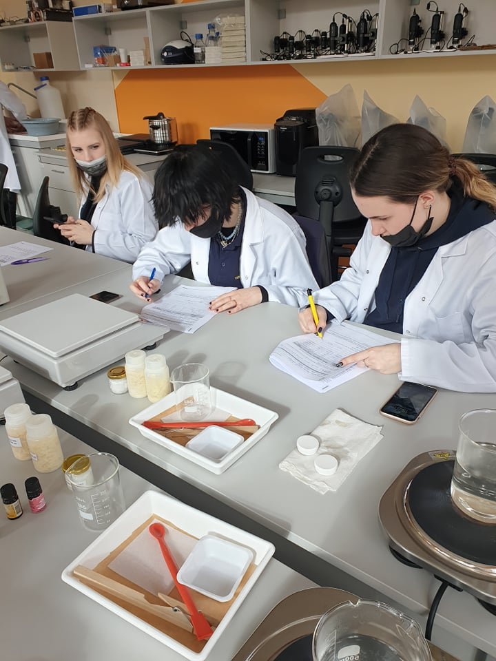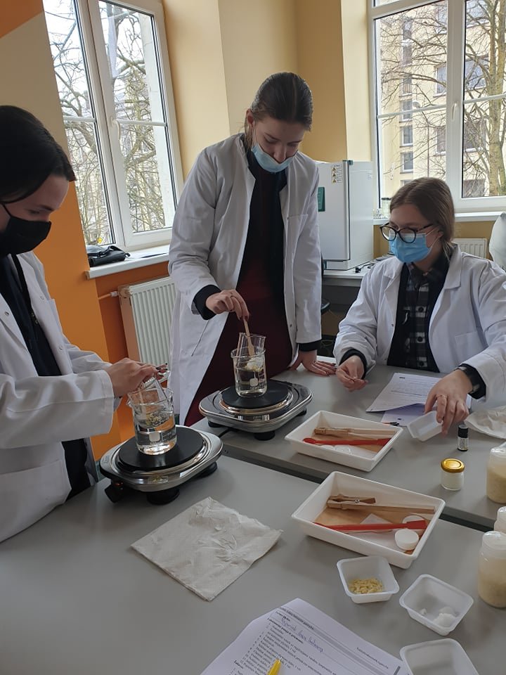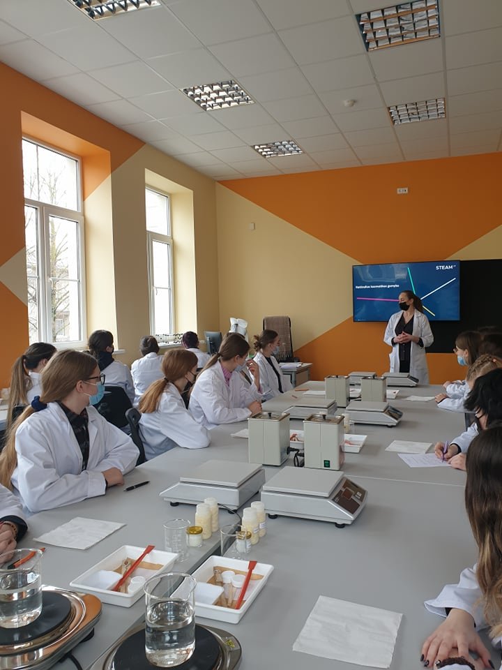 Kovo 9 dieną grupelė antrokų gimnazistų su biologijos mokytoja Daiva Makauskiene vyko į VU Šiaulių akademijos STEAM atviros prieigos centrą, kur Gyvenimo kokybės ir sveikatos technologijų laboratorijoje atliko darbą „Natūralios kosmetikos gamyba“.