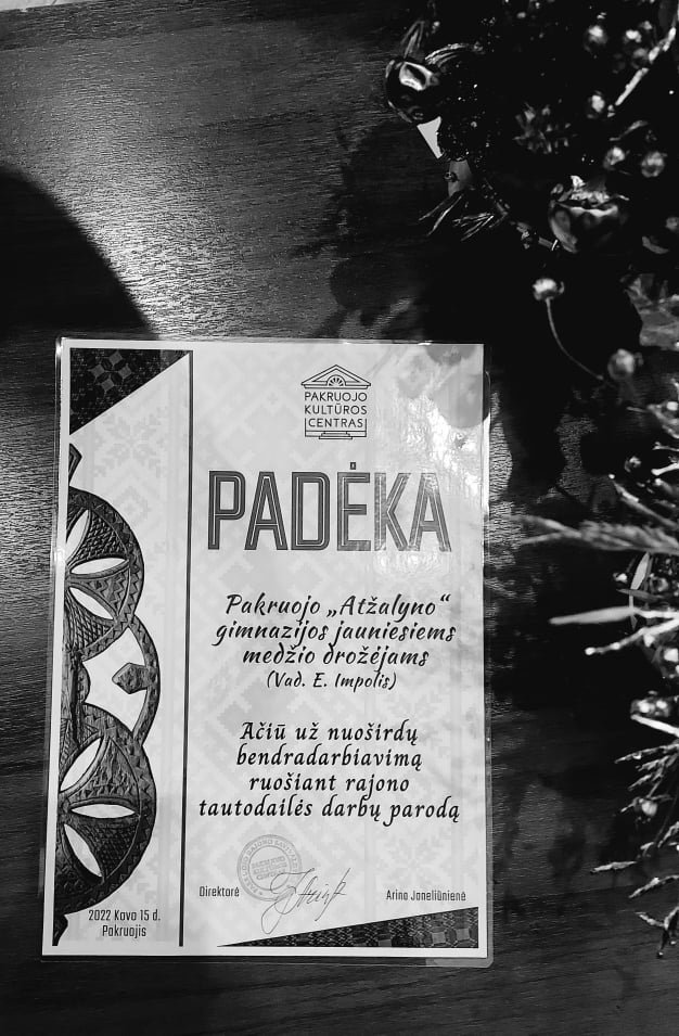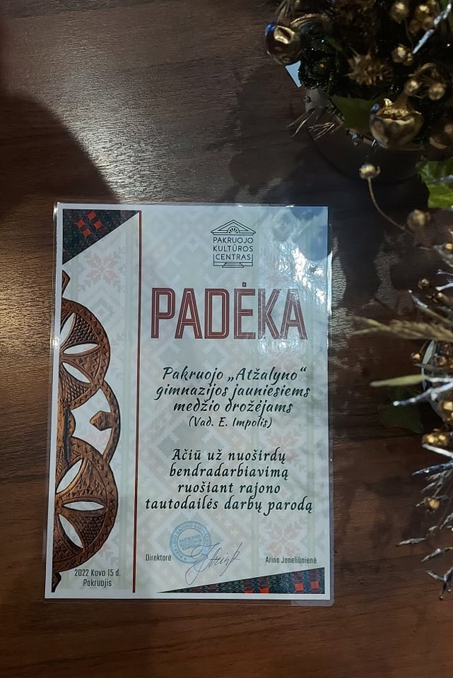 Kovo 15 dieną II gimnazijos klasių vaikinai su istorijos mokytoja Gražina Kairiūkštiene ir technologijų mokytoju Egidijumi Impoliu lankėsi Pakruojo kultūros centre, tautodailės darbų parodos atidarymo renginyje. Visi kartu apžiūrėjome medienos, tekstilės, tapybos darbų gausybę, pasiklausėme Pakruojo kultūros centro folkloro ansamblio „Verdenė" atliekamų dainų. Sveikinimo žodžius tarė Lietuvos tautodailininkų sąjungos Šiaulių bendrijos pirmininkė Laima Kelmelienė ir Pakruojo rajono savivaldybės mero pavaduotojas Virginijus Kacilevičius. Visiems tautodailininkams įteiktos padėkos. Mes taip pat gavome padėką už pagamintą eglutę baltų ženklų motyvais, beje, ji buvo eksponuojama ir gimnazijoje. Šaunus renginys!