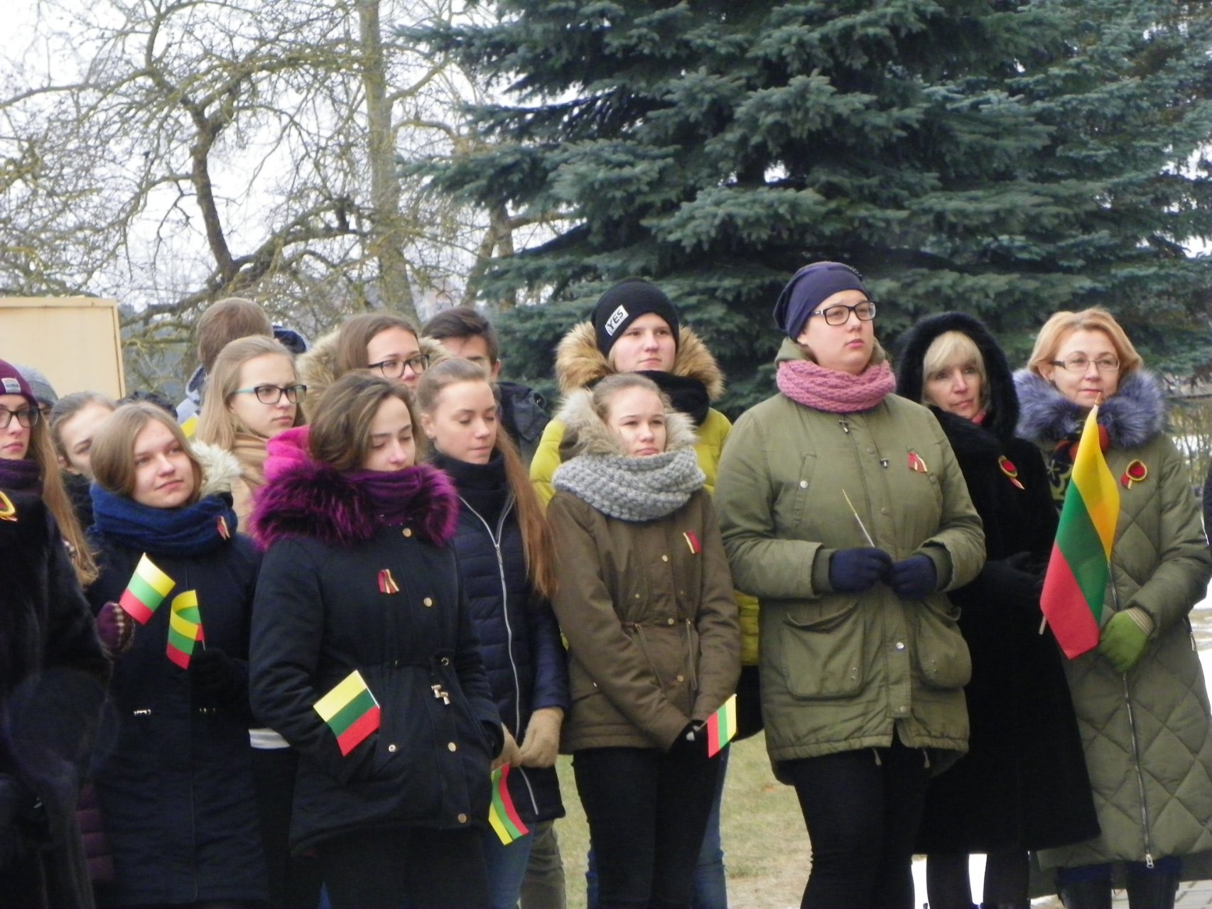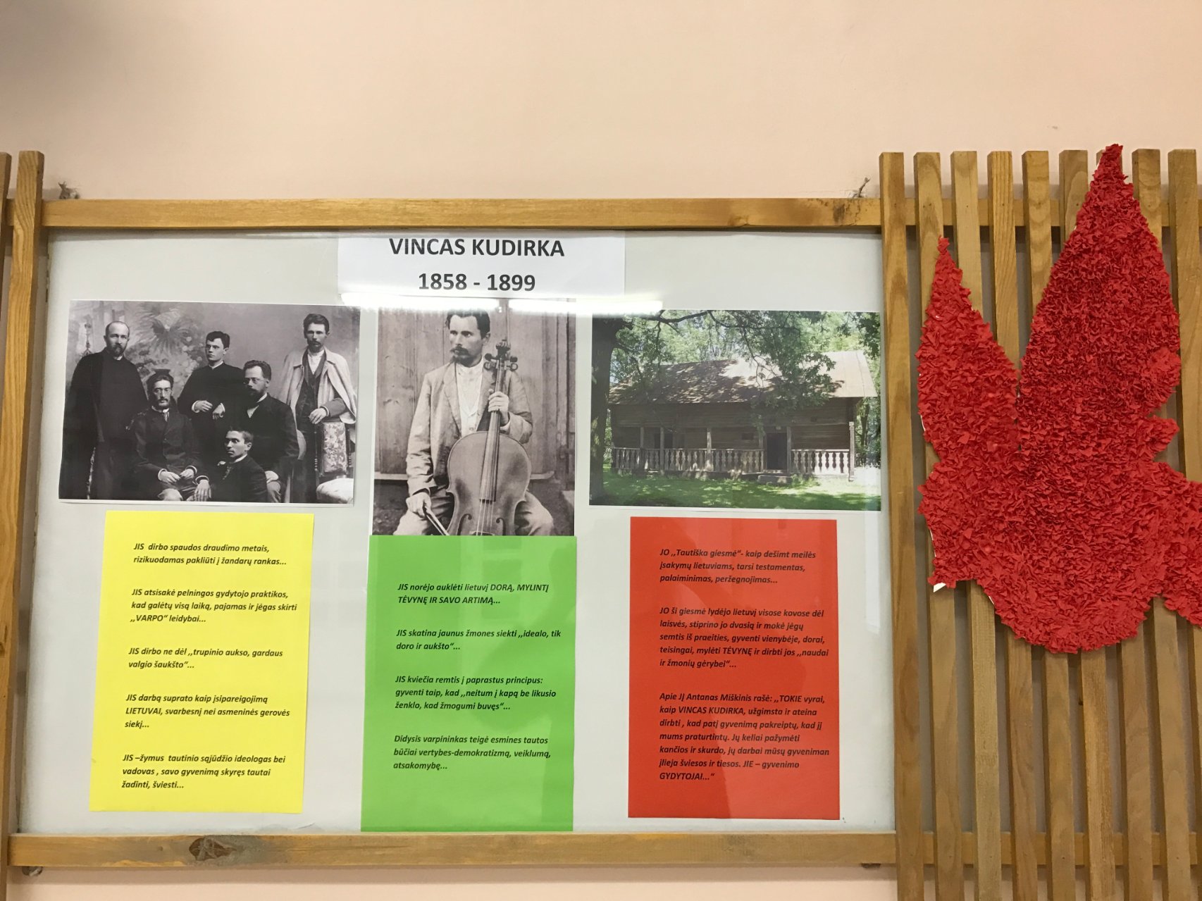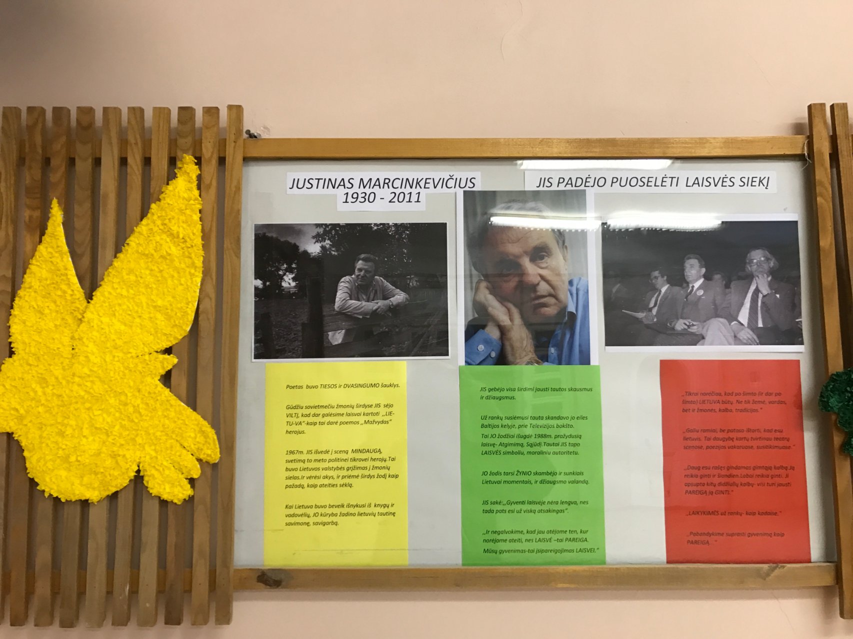 Prisiminti žmones, vedusius Lietuvą į nepriklausomybę ir padėjusius puoselėti laisvės siekį, žodžiu, kūrusius mūsų tautos kultūrą, galime stabtelėję prie stendo, kurį paruošė lietuvių kalbos ir literatūros mokytoja Gražina Spudienė. Poetai Vincas Kudirka, Maironis ir Justinas Marcinkevičius žadino lietuvių tautinę savimonę tada ir DABAR. Įsiklausykime į Just. Marcinkevičiaus žodžius: „Mūsų gyvenimas – tai įsipareigojimas LAISVEI.“ Tebūnie tai priminimas, kad turime jausti atsakomybę, nes tik nuo mūsų priklausys, kokia bus ateities Lietuva.