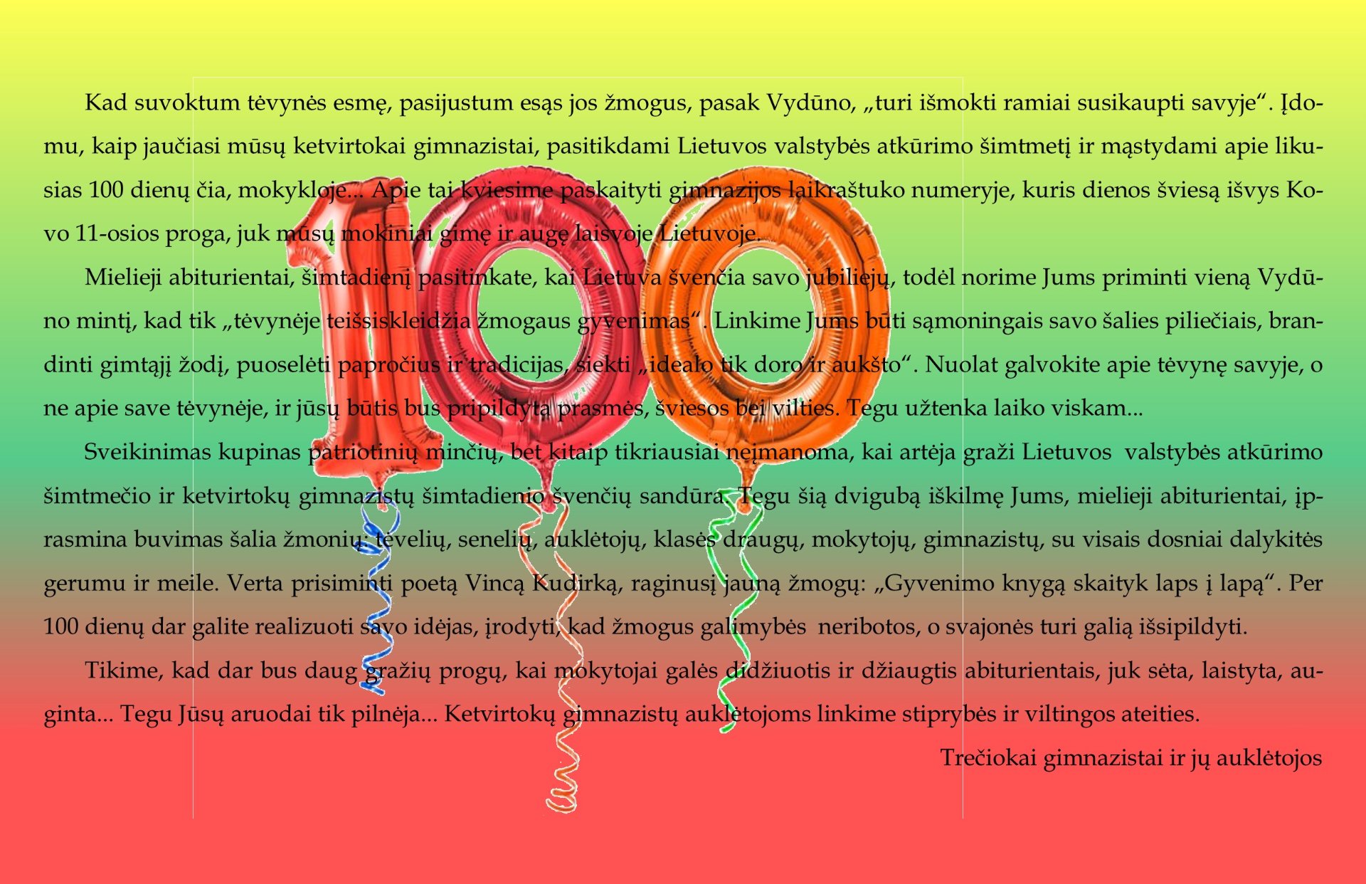 Lietuvos valstybės atkūrimo šimtmečio akivaizdoje mūsų gimnazijos langai papuošti vėliavos spalvų motyvais, kurie kiekvieną kviečia jaustis dalimi savo tėvynės, išdidžios ir laisvos. Už gražią iniciatyvą dėkojame pilietiškumo projekto „Dabar arba niekada“ ir samariečių būrelio vadovėms mokytojoms Ingai Ušinskaitei, Aušrai Dvelienei, Laimutei Činčienei bei mokiniams.