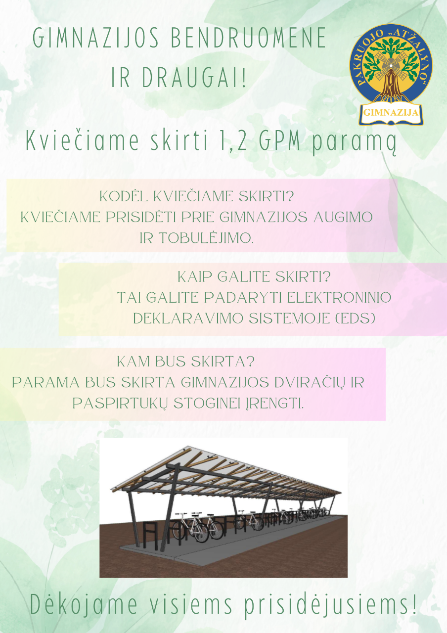 Norėdami skirti 1,2 proc. paramą mūsų gimnazijai, EDS sistemoje turite užpildyti formą FR0512 V.5. Jeigu nežinote, kaip tai padaryti, galime padėti. Prisijungę prie EDS sistemos, viršutinėje meniu juostoje pasirinkite „Deklaravimas“. Kairėje pusėje atsiras meniu juosta, kurioje pasirinkite „Pildyti formą“. Paieškos laukelyje „Formos kodas“ įveskite „FR0512“ ir spauskite „Filtruoti“. Iškris jums reikalinga forma. Kai atsidarys deklaracijos forma, pasitikrinkite, ar mokestinis laikotarpis yra 2022 m., ir spauskite gaublio pavidalo mygtuką. Atsidarys deklaravimo forma, tada spauskite „Pradėti“. Įveskite gavėjo identifikacinį numerį (kodą) 190066410 ir spauskite mygtuką „Tęsti“. Įrašykite mokesčio dalies dydį 1,2 proc. ir spauskite mygtuką „Išsaugoti“. Patikrinę duomenis, spauskite mygtuką „Taip, teisingi“-> „Formuoti prašymą“-> „Pateikti“. AČIŪ VISIEMS PRISIDĖJUSIEMS!