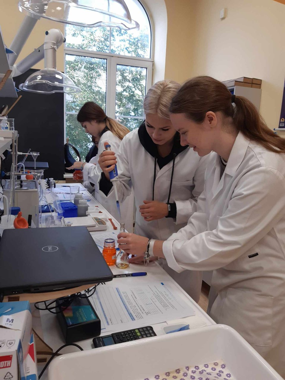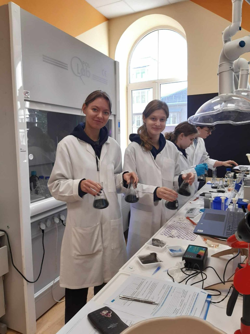Spalio 7 d. grupė gimnazijos trečiokų dirbo VU Šiaulių akademijos STEAM atviros prieigos centro chemijos laboratorijoje. Atlikome integruotą tiriamąjį darbą „Dažikliais užterštų nuotekų valymas aktyvintomis anglimis“.
