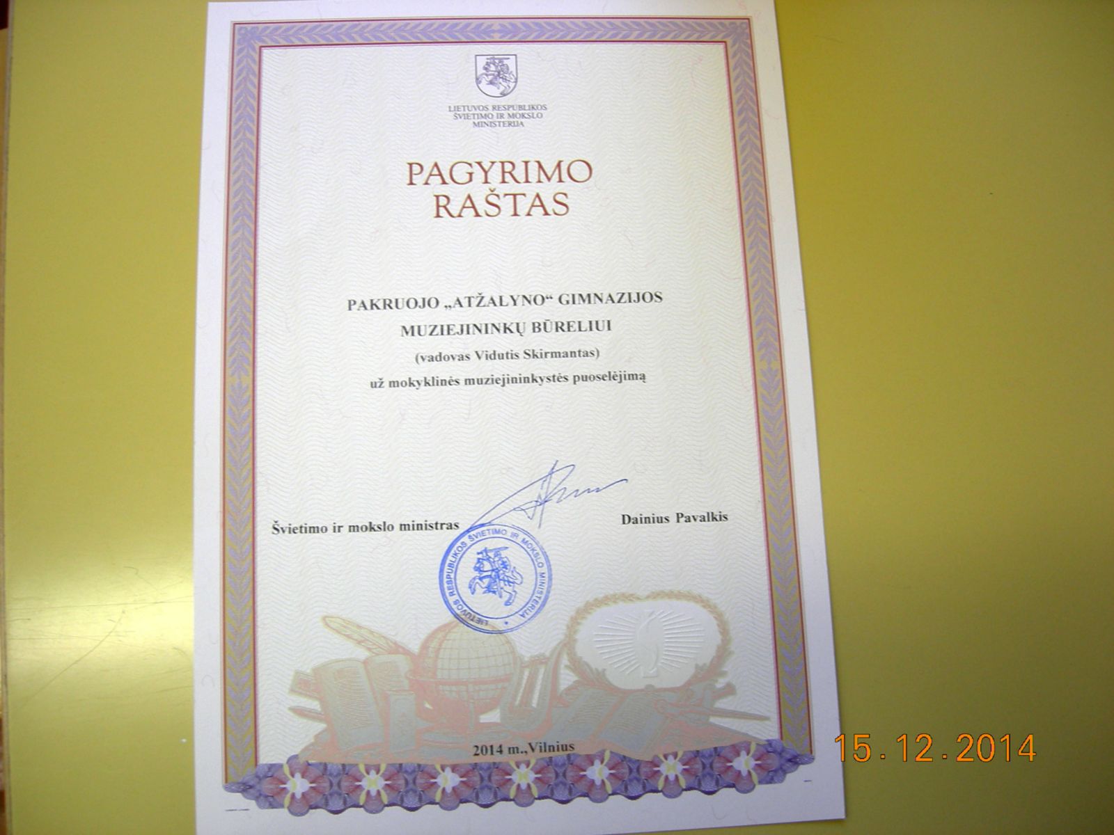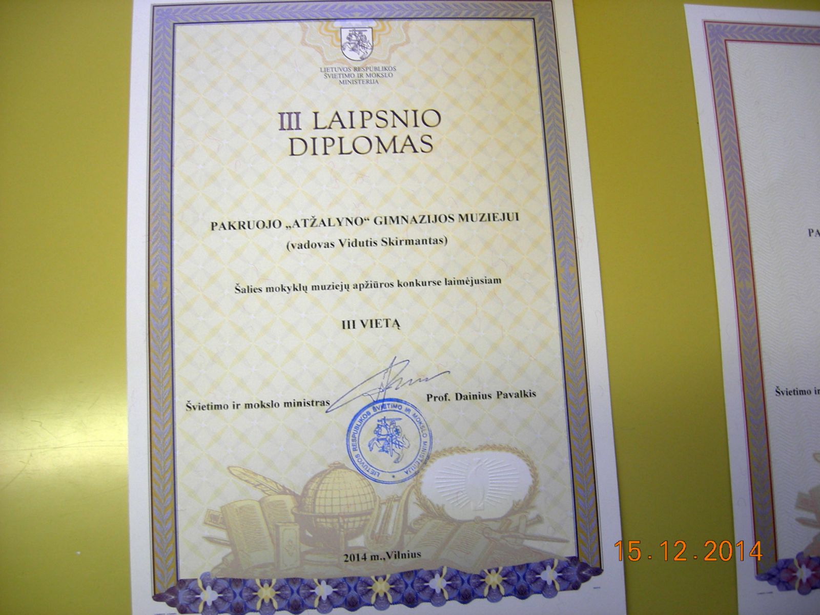Gruodžio 9 d. Vilniuje, dailės galerijoje įvyko respublikinė mokyklų muziejų apžiūros konkurso baigiamoji konferencija. Joje apžvelgtas atliktas muziejų veiklos dviejų metų darbas ir paskelbti nugalėtojai. Pakruojo ,,Atžalyno” gimnazijos muziejus šalies mokyklų muziejų apžiūroje konkurse laimėjo III-ąją vietą gimnazijų grupėje ir buvo apdovanotas švietimo ministerijos III laipsnio diplomu. Švietimo ministerijos pagyrimo raštas įteiktas ir gimnazijos muziejininkų būreliui.