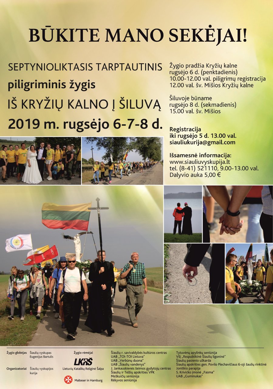 Rugsėjo 6-8 dienomis Šiaulių vyskupija organizuoja tradicinį piligriminį žygį pėsčiomis iš Kryžių kalno į Šiluvą. Žygio pradžia rugsėjo 6 d. 12.00 val. šv. Mišiomis Kryžių kalne. Į Šiluvą piligrimai nueis rugsėjo 8 d. 15.00 val., kur bus aukojamos šv. Mišios. Piligriminį žygį globoja Šiaulių vyskupas Jo ekscelencija Eugenijus Bartulis ir kviečia visus dalyvauti. Norintys keliauti galite kreiptis iki trečiadienio 14 val. į tikybos mokytoją Laimutę Činčienę (kabineto Nr. 16).