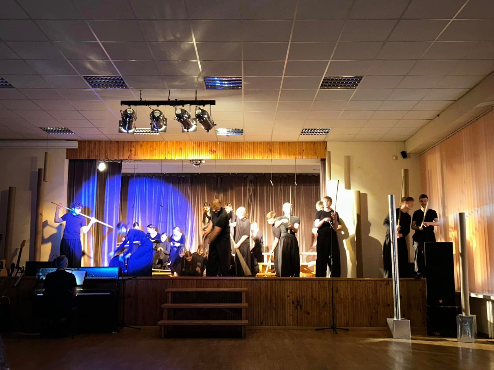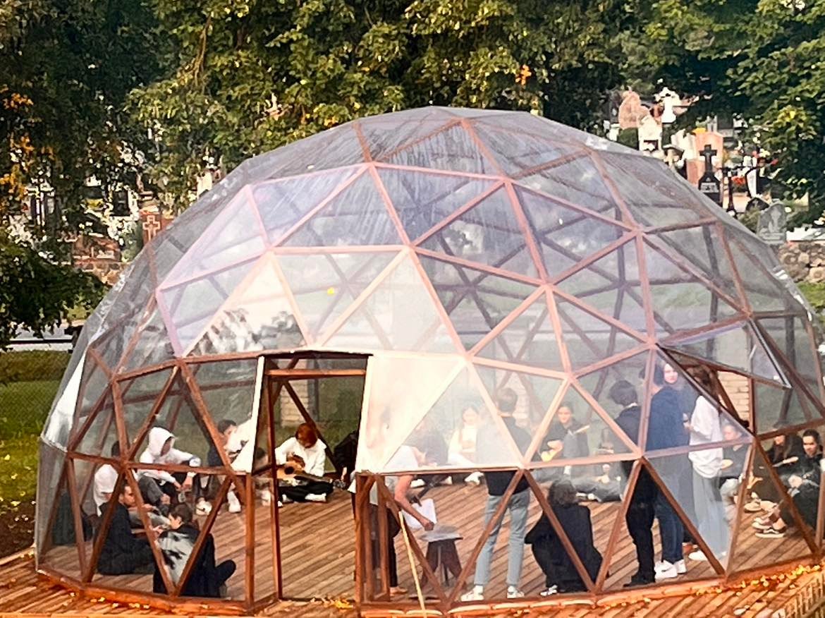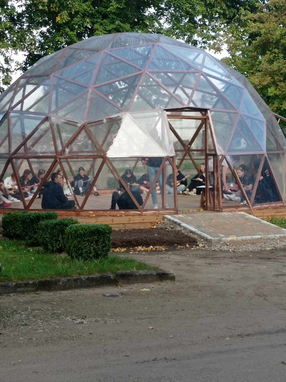 Nors kupolo baldai (stalai ir kėdės) atkeliaus tik lapkričio mėnesį, antrokai gimnazistai kartu su muzikos mokytoja Vaiva Klupšiene išbandė lauko kupolo erdvę per muzikos pamoką. Kokybišką ukulėlių garsų skambesį mokiniai apipynė dainomis, džiaugėsi puikia akustika ir džiugiai išgyveno bendrystės jausmą.